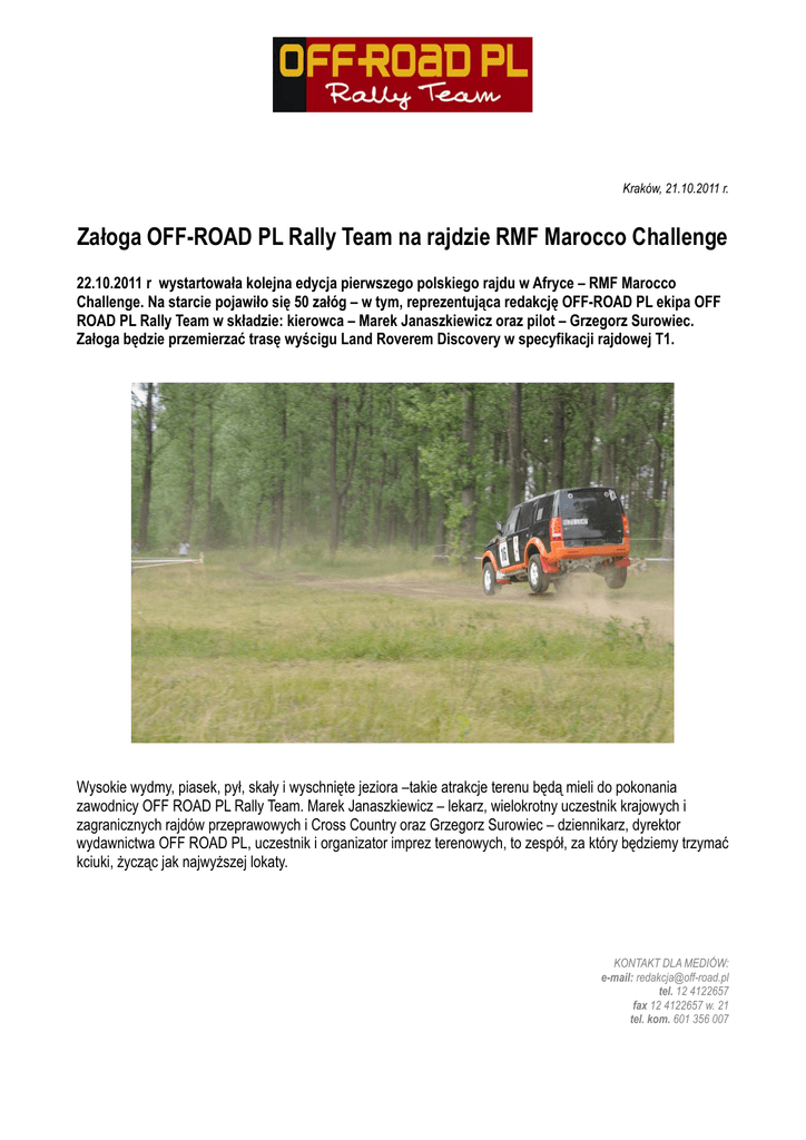 Kraków, 21.10.2011 r. Załoga OFF-ROAD PL Rally Team na rajdzie RMF Marocco Challenge 22.10.2011 r wystartowała kolejna edycja pierwszego polskiego rajdu w Afryce – RMF Marocco Challenge. Na starcie pojawiło się 50 załóg – w tym, reprezentująca redakcję OFF-ROAD PL ekipa OFF ROAD PL Rally Team w składzie: kierowca – Marek Janaszkiewicz oraz pilot – Grzegorz Surowiec. Załoga będzie przemierzać trasę wyścigu Land Roverem Discovery w specyfikacji rajdowej T1. Wysokie wydmy, piasek, pył, skały i wyschnięte jeziora –takie atrakcje terenu będą mieli do pokonania zawodnicy OFF ROAD PL Rally Team. Marek Janaszkiewicz – lekarz, wielokrotny uczestnik krajowych i zagranicznych rajdów przeprawowych i Cross Country oraz Grzegorz Surowiec – dziennikarz, dyrektor wydawnictwa OFF ROAD PL, uczestnik i organizator imprez terenowych, to zespół, za który będziemy trzymać kciuki, życząc jak najwyższej lokaty. KONTAKT DLA MEDIÓW: e-mail: [email protected] tel. 12 4122657 fax 12 4122657 w. 21 tel. kom. 601 356 007 Grzegorz Surowiec – pilot: W rajdzie pojedziemy naszym Land Roverem Discovery w specyfikacji rajdowej T1. Auto było wstępnie przygotowane na Dakar 2008, ale w tym roku specjalnie je przebudowaliśmy. W obecnej wersji znalazł się nowy układ napędowy oparty na mocnym silniku (4,6 l, 300 KM) pracującym w układzie V8. Co prawda jednostka napędowa zawiodła nas przed planowanym startem w tegorocznej edycji rajdu Silkway, ale wszystko zostało naprawione i dopracowane, mamy więc nadzieję, że uda nam się przejechać bez awarii zaplanowane na trasę RMF Marocco Challenge 2 500 km, osiągając przy tym jak najwyższy wynik. Z rodzajem terenu, który został dla nas przygotowany podczas tego wyścigu mieliśmy już sporo styczności, więc liczymy na to, że doświadczenie oraz auto nas nie zawiodą. Zawodnicy przez 7 dni wyścigu, będą mieli codziennie do pokonania 200 km trasy. O przebiegu rajdu będziemy informować Was na bieżąco. Informacje będą dostępne także na stronie www.off-road.pl. OFF-ROAD PL Magazyn 4x4 to jedyny miesięcznik off-roadowy w Polsce, ekspert w dziedzinie samochodów terenowych, SUV-ów i quadów. Na rynku od 1999 roku, oferuje rzetelne i ciekawe artykuły. Wysoka pozycja w środowisku użytkowników samochodów terenowych i SUV-ów. Magazyn obecny na najważniejszych imprezach off-roadowych w kraju i za granicą. Magazyn tworzony przez pasjonatów, od lat czynnie związanych z off-roadem. W magazynie m.in. nowości z rynku samochodów terenowych, SUV-ów i quadów; testy i fachowe opisy pojazdów terenowych, części samochodowych, opon i akcesoriów, relacje z najważniejszych krajowych i zagranicznych imprez off-roadowych, historie najciekawszych modeli „terenówek”, wyposażenie turystyczne i wyprawowe (odzież, GPS, CB, telefony GSM i inne). KONTAKT DLA MEDIÓW: e-mail: [email protected] tel. 12 4122657 fax 12 4122657 w. 21 tel. kom. 601 356 007