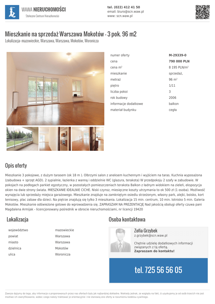 tel. (022) 412 41 50 email: [email protected] www: scn.waw.pl Mieszkanie na sprzedaż Warszawa Mokotów - 3 pok. 96 m2 Lokalizacja: mazowieckie, Warszawa, Warszawa, Mokotów, Woronicza numer oferty M-29339-0 cena 790 000 PLN cena m 8 195 PLN/m2 mieszkanie sprzedaż, metraż 96 m2 piętro 1/11 liczba pokoi 3 rok budowy 2006 informacje dodatkowe balkon materiał budynku cegła 2 Opis oferty Mieszkanie 3 pokojowe, z dużym tarasem (ok 18 m ). Olbrzymi salon z aneksem kuchennym i wyjściem na taras. Kuchnia wyposażona (zabudowa + sprzęt AGD). 2 sypialnie, łazienka z wanną i oddzielnie WC (glazura, terakota) W przedpokoju 2 szafy w zabudowie. W pokojach na podłogach parkiet egzotyczny, w pozostałych pomieszczeniach terakota Balkon z ładnym widokiem na zieleń, ekspozycja okien na dwie strony świata. MIESZKANIE IDEALNIE CICHE. Niski czynsz, miesięczne koszty utrzymania to ok 500 zł (1 osoba). Możliwość wynajęcia lub sprzedaży miejsca garażowego. Mieszkanie znajduje na zamkniętym osiedlu strzeżonym, własny park, alejki, boisko, kort tenisowy, plac zabaw dla dzieci. Na piętrze znajdują się tylko 3 mieszkania. Lokalizacja 15 min. centrum, 10 min. lotnisko 5 min. Galeria Mokotów. Mieszkanie odświeżone gotowe do wprowadzenia się. ZAPRASZAM NA PREZENTACJĘ Nad jakością obsługi oferty czuwa pani Magdalena Armijak - licencjonowany pośrednik w obrocie nieruchomościami, nr licencji 19420 Lokalizacja Osoba kontaktowa Zofia Grzybek województwo mazowieckie powiat Warszawa [email protected] miasto Warszawa dzielnica Mokotów ulica Woronicza Chętnie udzielę dodatkowych informacji związanych z tą ofertą. Zapraszam do kontaktu! tel. 725 56 56 05 Zawsze dążymy do tego, aby informacje o proponowanych przez nas ofertach były jak najbardziej dokładne. Niekiedy jednak, ze względu na fakt, iż uzyskujemy je od osób trzecich nie jest możliwe ich zweryfikowanie, wobec czego należy traktować je orientacyjnie i nie stanowią one oferty w rozumieniu kodeksu cywilnego.