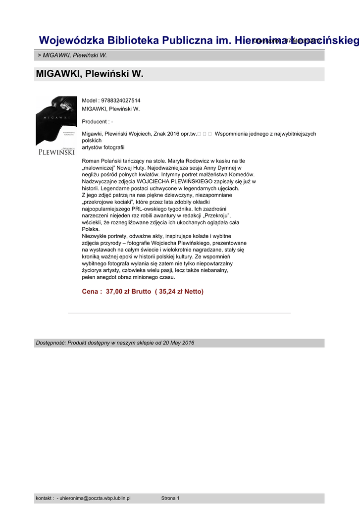Utworzono : 07Łopacińskieg March 2017 Wojewódzka Biblioteka Publiczna im. Hieronima > MIGAWKI, Plewiński W. MIGAWKI, Plewiński W. Model : 9788324027514 MIGAWKI, Plewiński W. Producent : Migawki, Plewiński Wojciech, Znak 2016 opr.tw.��� Wspomnienia jednego z najwybitniejszych polskich artystów fotografii Roman Polański tańczący na stole. Maryla Rodowicz w kasku na tle „malowniczej” Nowej Huty. Najodważniejsza sesja Anny Dymnej w negliżu pośród polnych kwiatów. Intymny portret małżeństwa Komedów. Nadzwyczajne zdjęcia WOJCIECHA PLEWIŃSKIEGO zapisały się już w historii. Legendarne postaci uchwycone w legendarnych ujęciach. Z jego zdjęć patrzą na nas piękne dziewczyny, niezapomniane „przekrojowe kociaki”, które przez lata zdobiły okładki najpopularniejszego PRL-owskiego tygodnika. Ich zazdrośni narzeczeni niejeden raz robili awantury w redakcji „Przekroju”, wściekli, że roznegliżowane zdjęcia ich ukochanych oglądała cała Polska. Niezwykłe portrety, odważne akty, inspirujące kolaże i wybitne zdjęcia przyrody – fotografie Wojciecha Plewińskiego, prezentowane na wystawach na całym świecie i wielokrotnie nagradzane, stały się kroniką ważnej epoki w historii polskiej kultury. Ze wspomnień wybitnego fotografa wyłania się zatem nie tylko niepowtarzalny życiorys artysty, człowieka wielu pasji, lecz także niebanalny, pełen anegdot obraz minionego czasu. Cena : 37,00 zł Brutto ( 35,24 zł Netto) Dostępność: Produkt dostępny w naszym sklepie od 20 May 2016 kontakt : - [email protected] Strona 1