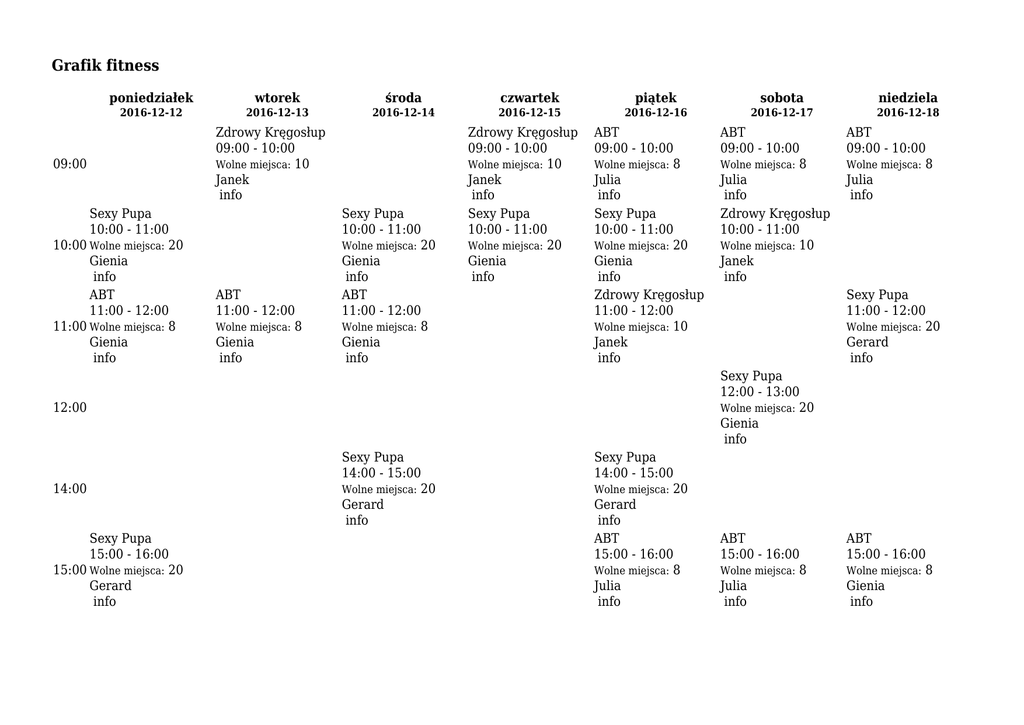 Grafik fitness poniedziałek wtorek środa czwartek piątek sobota niedziela 2016-12-12 2016-12-13 2016-12-14 2016-12-15 2016-12-16 2016-12-17 2016-12-18 09:00 Sexy Pupa 10:00 - 11:00 10:00 Wolne miejsca: 20 Gienia info ABT 11:00 - 12:00 11:00 Wolne miejsca: 8 Gienia info Zdrowy Kręgosłup 09:00 - 10:00 Wolne miejsca: 10 Janek info ABT 11:00 - 12:00 Wolne miejsca: 8 Gienia info Sexy Pupa 10:00 - 11:00 Wolne miejsca: 20 Gienia info ABT 11:00 - 12:00 Wolne miejsca: 8 Gienia info Zdrowy Kręgosłup 09:00 - 10:00 Wolne miejsca: 10 Janek info Sexy Pupa 10:00 - 11:00 Wolne miejsca: 20 Gienia info ABT 09:00 - 10:00 Wolne miejsca: 8 Julia info Sexy Pupa 10:00 - 11:00 Wolne miejsca: 20 Gienia info Zdrowy Kręgosłup 11:00 - 12:00 Wolne miejsca: 10 Janek info Sexy Pupa 15:00 - 16:00 15:00 Wolne miejsca: 20 Gerard info ABT 09:00 - 10:00 Wolne miejsca: 8 Julia info Sexy Pupa 11:00 - 12:00 Wolne miejsca: 20 Gerard info Sexy Pupa 12:00 - 13:00 Wolne miejsca: 20 Gienia info 12:00 14:00 ABT 09:00 - 10:00 Wolne miejsca: 8 Julia info Zdrowy Kręgosłup 10:00 - 11:00 Wolne miejsca: 10 Janek info Sexy Pupa 14:00 - 15:00 Wolne miejsca: 20 Gerard info Sexy Pupa 14:00 - 15:00 Wolne miejsca: 20 Gerard info ABT 15:00 - 16:00 Wolne miejsca: 8 Julia info ABT 15:00 - 16:00 Wolne miejsca: 8 Julia info ABT 15:00 - 16:00 Wolne miejsca: 8 Gienia info poniedziałek wtorek środa czwartek piątek sobota niedziela 2016-12-12 2016-12-13 2016-12-14 2016-12-15 2016-12-16 2016-12-17 2016-12-18 Sexy Pupa 21:00 - 22:00 Wolne miejsca: 20 Gerard info ABT 22:00 - 23:00 Wolne miejsca: 8 Gienia info Sexy Pupa 23:00 - 23:59 Wolne miejsca: 20 Gerard info Sexy Pupa 21:00 - 22:00 Wolne miejsca: 20 Gerard info ABT 22:00 - 23:00 Wolne miejsca: 8 Gienia info Sexy Pupa 23:00 - 23:59 Wolne miejsca: 20 Gerard info Pump 16:00 - 17:00 Wolne miejsca: 10 Julia info 16:00 ABT 17:00 - 18:00 17:00 Wolne miejsca: 8 Gienia info Zdrowy Kręgosłup 19:00 - 20:00 19:00 Wolne miejsca: 10 Janek info Sexy Pupa 21:00 - 22:00 21:00 Wolne miejsca: 20 Gerard info ABT 22:00 - 23:00 22:00 Wolne miejsca: 8 Gienia info Sexy Pupa 23:00 - 23:59 23:00 Wolne miejsca: 20 Gerard info ABT 17:00 - 18:00 Wolne miejsca: 2 Julia info Sexy Pupa 21:00 - 22:00 Wolne miejsca: 20 Gerard info ABT 22:00 - 23:00 Wolne miejsca: 8 Gienia info Sexy Pupa 23:00 - 23:59 Wolne miejsca: 20 Gerard info ABT 17:00 - 18:00 Wolne miejsca: 8 Julia info Zdrowy Kręgosłup 19:00 - 20:00 Wolne miejsca: 10 Janek info Sexy Pupa 21:00 - 22:00 Wolne miejsca: 20 Gerard info ABT 22:00 - 23:00 Wolne miejsca: 8 Gienia info Sexy Pupa 23:00 - 23:59 Wolne miejsca: 20 Gerard info Sexy Pupa 21:00 - 22:00 Wolne miejsca: 20 Gerard info ABT 22:00 - 23:00 Wolne miejsca: 8 Gienia info Sexy Pupa 23:00 - 23:59 Wolne miejsca: 20 Gerard info Zdrowy Kręgosłup 19:00 - 20:00 Wolne miejsca: 10 Janek info Sexy Pupa 21:00 - 22:00 Wolne miejsca: 20 Gerard info ABT 22:00 - 23:00 Wolne miejsca: 8 Gienia info Sexy Pupa 23:00 - 23:59 Wolne miejsca: 20 Gerard info
