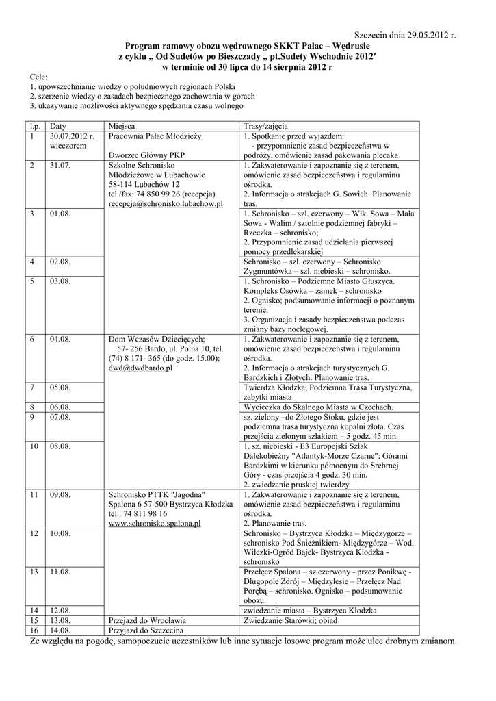 Szczecin dnia 29.05.2012 r. Program ramowy obozu wędrownego SKKT Pałac – Wędrusie z cyklu „ Od Sudetów po Bieszczady „ pt.Sudety Wschodnie 2012′ w terminie od 30 lipca do 14 sierpnia 2012 r Cele: 1. upowszechnianie wiedzy o południowych regionach Polski 2. szerzenie wiedzy o zasadach bezpiecznego zachowania w górach 3. ukazywanie możliwości aktywnego spędzania czasu wolnego l.p. 1 Daty 30.07.2012 r. wieczorem 2 31.07. 3 01.08. 4 02.08. 5 03.08. 6 04.08. 7 05.08. 8 9 06.08. 07.08. 10 08.08. 11 09.08. 12 10.08. 13 11.08. 14 15 16 12.08. 13.08. 14.08. Miejsca Pracownia Pałac Młodzieży Dworzec Główny PKP Szkolne Schronisko Młodzieżowe w Lubachowie 58-114 Lubachów 12 tel./fax: 74 850 99 26 (recepcja) [email protected] Dom Wczasów Dziecięcych; 57- 256 Bardo, ul. Polna 10, tel. (74) 8 171- 365 (do godz. 15.00); [email protected] Schronisko PTTK "Jagodna" Spalona 6 57-500 Bystrzyca Kłodzka tel.: 74 811 98 16 www.schronisko.spalona.pl Przejazd do Wrocławia Przyjazd do Szczecina Trasy/zajęcia 1. Spotkanie przed wyjazdem: - przypomnienie zasad bezpieczeństwa w podróży, omówienie zasad pakowania plecaka 1. Zakwaterowanie i zapoznanie się z terenem, omówienie zasad bezpieczeństwa i regulaminu ośrodka. 2. Informacja o atrakcjach G. Sowich. Planowanie tras. 1. Schronisko – szl. czerwony – Wlk. Sowa – Mała Sowa - Walim / sztolnie podziemnej fabryki – Rzeczka – schronisko; 2. Przypomnienie zasad udzielania pierwszej pomocy przedlekarskiej Schronisko – szl. czerwony – Schronisko Zygmuntówka – szl. niebieski – schronisko. 1. Schronisko – Podziemne Miasto Głuszyca. Kompleks Osówka – zamek – schronisko 2. Ognisko; podsumowanie informacji o poznanym terenie. 3. Organizacja i zasady bezpieczeństwa podczas zmiany bazy noclegowej. 1. Zakwaterowanie i zapoznanie się z terenem, omówienie zasad bezpieczeństwa i regulaminu ośrodka. 2. Informacja o atrakcjach turystycznych G. Bardzkich i Złotych. Planowanie tras. Twierdza Kłodzka, Podziemna Trasa Turystyczna, zabytki miasta Wycieczka do Skalnego Miasta w Czechach. sz. zielony –do Złotego Stoku, gdzie jest podziemna trasa turystyczna kopalni złota. Czas przejścia zielonym szlakiem – 5 godz. 45 min. 1. sz. niebieski - E3 Europejski Szlak Dalekobieżny "Atlantyk-Morze Czarne"; Górami Bardzkimi w kierunku północnym do Srebrnej Góry - czas przejścia 4 godz. 30 min. 2. zwiedzanie pruskiej twierdzy 1. Zakwaterowanie i zapoznanie się z terenem, omówienie zasad bezpieczeństwa i regulaminu ośrodka. 2. Planowanie tras. Schronisko – Bystrzyca Kłodzka – Międzygórze – schronisko Pod Śnieżnikiem- Międzygórze – Wod. Wilczki-Ogród Bajek- Bystrzyca Klodzka schronisko Przełęcz Spalona – sz.czerwony - przez Ponikwę Długopole Zdrój – Międzylesie – Przełęcz Nad Porębą – schronisko. Ognisko – podsumowanie obozu. zwiedzanie miasta – Bystrzyca Kłodzka Zwiedzanie Starówki; obiad Ze względu na pogodę, samopoczucie uczestników lub inne sytuacje losowe program może ulec drobnym zmianom.