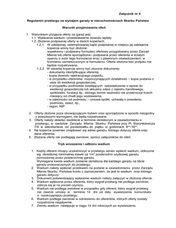 Załącznik nr 4 Regulamin przetargu na wynajem garaży w nieruchomościach Skarbu Państwa Warunki przyjmowania ofert 1. Warunkiem przyjęcia oferty na garaż jest: 1.1. Wpłacenie wadium i przedstawienie dowodu wpłaty. 1.2. Złożenie podpisanej oferty w dwóch kopertach. 1.2.1. W zaklejonej, ostemplowanej bądź podpisanej w miejscu jej zaklejenia kopercie winny być złożone: wypełniony i podpisany formularz ofertowy przygotowany przez Zarząd Mienia lub oferta sporządzona i podpisana przez oferenta w ścisłym oparciu o wzór tego formularza wraz z pisemnym oświadczeniem, w brzmieniu zamieszczonym w formularzu. Oferta złożona bez podpisu nie będzie rozpatrywana. 1.2.2. W otwartej kopercie winny być złozone dokumenty: - dokumenty identyfikujące oferenta, - kopia dowodu rejetracyjnego pojazdu, - w przypadku oferentów rozpoczynających działalność – kopia podania o wpis do ewidencji gospodarczej, - w przypadku podmiotów działających: zaświadczenie o wpisie do ewidencji gospodarczej lub aktualny odpis z rejestru handlowego, spółdzielni, fundacji itp., którego termin ważności nie przekroczył trzech miesięcy od chwili jego wystawienia, - w zależności od podmiotu – umowa spółki, uchwałą o powołaniu podmiotu, statut, itp., - regon, NIP. 2. Oferty złożone poza obowiązującym trybem oraz sporządzone w sposób niezgodny z powyższymi wymogami, nie będą rozpatrywane. 3. Oferty należy składać osobiście w terminie określonym w zawiadomieniu o przetargu, w siedzibie Zarządu Mienia Skarbu Państwa przy Pl. Starynkiewicza 7/9 w sekretariacie od poniedziałku do piątku w godzinach 8oo-16oo. 4. Na kopercie powinien znajdować się adres garażu, którego dotyczy oferta oraz dane oferenta. 5. Złożone oferty nie podlegają zwrotowi, oprócz załączników do ofert. Tryb wnoszenia i odbioru wadium 1. Każdy oferent chcący uczestniczyć w przetargu winien wpłacić wadium, obliczone wg określonej minimalnej stawki za 1m2 powierzchni użytkowej garażu pomnożonej przez powierzchnię garażu. Wymagana kwota wadium zostanie określona dla każdego garażu na liście garaży przeznaczonych do przetargu. 2. Wadium należy wpłacać przelewem na podane w zawiadomieniu przez Zarządu Mienia Skarbu Państwa konto z zaznaczeniem, że jest to wadium oraz którego garażu dotyczy. 3. Dokument potwierdzający wpłacenie wadium należy załączyć w złożonej ofercie. 4. Wadium wpłacone przez oferenta, który wygrał przetarg nie podlega zwrotowi, zalicza się je na poczet czynszu. 5. Wadium nie podlega zwrotowi w przypadku gdy oferent, który wygrał przetarg nie zawrze umowy w terminie 14 dni od daty wywieszenia komunikatu o rozstrzygnięciu przetargu. 6. Wadium podlega zwrotowi w odniesieniu do oferentów, których oferty zostały rozpatrzone negatywnie. 7. Zwrotu wadium następuje w ciągu 14 dni roboczych po wywieszeniu 8. komunikatu o rozstrzygnięciu przetargu. Zamawiający zwraca wadium wraz z odsetkami wynikającymi z umowy rachunku bankowego, na którym było ono przechowywane, pomniejszone o koszty prowadzenia rachunku bankowego oraz prowizji bankowej za przelew pieniędzy na rachunek bankowy wskazany przez oferenta. Procedura wyłaniania zwycięzcy przetargu 1. 2. 3. 4. 5. 6. 7. Następnego dnia po zakończeniu przyjmowania ofert są one przedmiotem opinii Komisji rozstrzygającej przetarg. 1.1. Przewodniczący Komisji odbiera i potwierdza odbiór złożonych w sekretariacie ofert. 1.2. Po otwarciu ofert Przewodniczący Komisji : 1.2.1. sprawdza prawidłowość złożonych ofert, 1.2.2. odczytuje z ofert wysokość oferowanej stawki czynszu oraz proponowaną działalność. 1.3. Przy otwieraniu ofert może uczestniczyć oferent. 1.4. Ze spotkania Komisji sporządza się protokół z wnioskiem do Dyrektora ZMSP o akceptację wyboru najkorzystniejszej oferty. 1.5. Po podjęciu przez Dyrektora ZMSP decyzji dotyczącej wyboru najkorzystniejszej oferty następuje ogłoszenie o rozstrzygnięciu przetargu w formie komunikatu umieszczonego na tablicy w siedzibie ZMSP oraz pisemne powiadomienie oferentów. 1.6. W przypadku niepodpisania z winy oferenta umowy najmu w terminie 14 dni od daty ogłoszenia wyników przetargu, Dyrektor ZMSP ma prawo dokonać wyboru nastepnej najkorzystniejszej oferty o ile zaoferowana wysokość czynszu nie jest mniejsza od minimalnej ustalowej dla danego garażu. Przetarg uznaje się za ważny nawet w przypadku złożenia jednej oferty. Dyrektor ZMSP może unieważnić przetarg w całości lub części. Kryterium wyboru oferty jest proponowana wysokość stawki czynszu. Jeżeli zostały złożone oferty o takiej samej wysokości stawki czynszu, ZMSP wzywa oferentów do złożenia w terminie 7 dni ofert dodatkowych. W przypadku powtórnego złożenia ofert o takiej samej stawce czynszu ZMSP unieważnia przetarg. Po wygraniu przetargu, oferent który zawiera umowę najmu zobowiązany jest przed podpisaniem umowy najmu, do wpłacenia kaucji przelewem na podane przez Zarząd Mienia Skarbu Panstwa konto w wysokości trzymiesięcznych należności czynszowych. Postanowienia końcowe 1. 2. W przypadku wystawienia przez ZMSP lokalu do przetargu po raz kolejny, wymagane jest ponowne złożenie oferty. Wyniki przetargu prezentowane są w formie komunikatu wywieszonego w siedzibie ZMSP ul. Starynkiewicza 7/9.