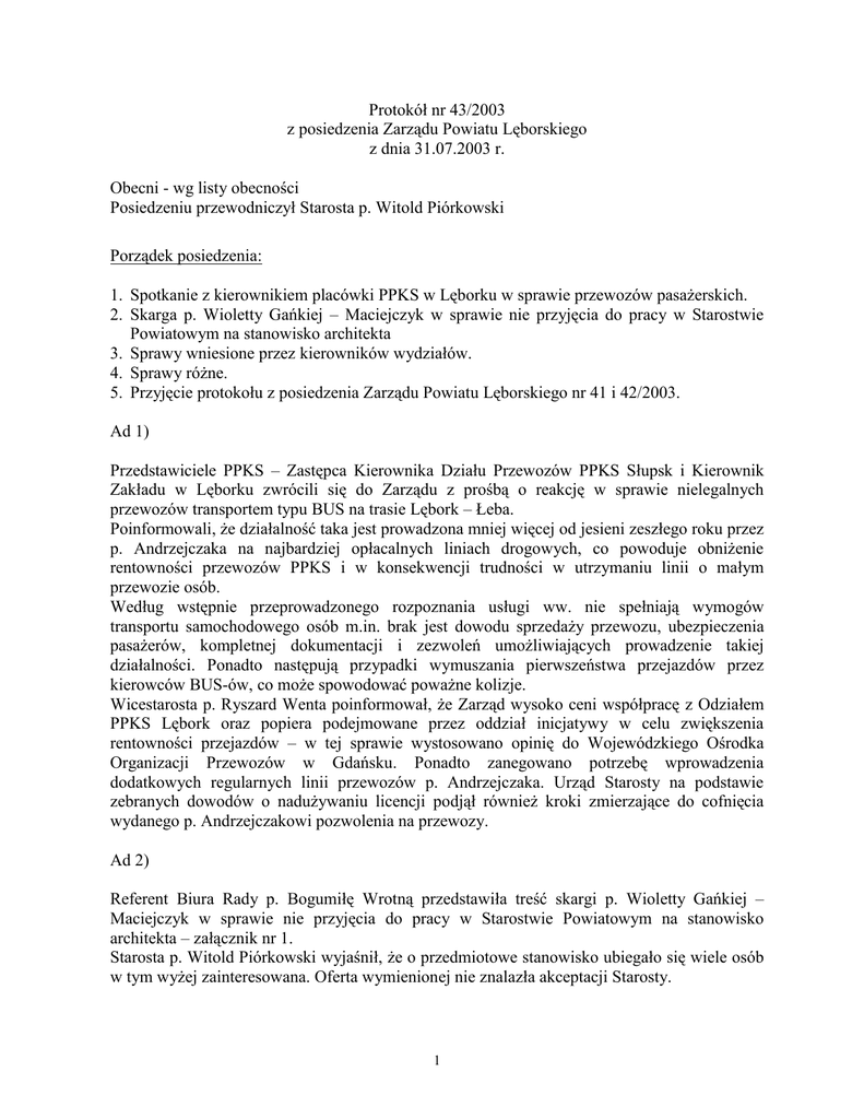 Protokół nr 43/2003 z posiedzenia Zarządu Powiatu Lęborskiego z dnia 31.07.2003 r. Obecni - wg listy obecności Posiedzeniu przewodniczył Starosta p. Witold Piórkowski Porządek posiedzenia: 1. Spotkanie z kierownikiem placówki PPKS w Lęborku w sprawie przewozów pasażerskich. 2. Skarga p. Wioletty Gańkiej – Maciejczyk w sprawie nie przyjęcia do pracy w Starostwie Powiatowym na stanowisko architekta 3. Sprawy wniesione przez kierowników wydziałów. 4. Sprawy różne. 5. Przyjęcie protokołu z posiedzenia Zarządu Powiatu Lęborskiego nr 41 i 42/2003. Ad 1) Przedstawiciele PPKS – Zastępca Kierownika Działu Przewozów PPKS Słupsk i Kierownik Zakładu w Lęborku zwrócili się do Zarządu z prośbą o reakcję w sprawie nielegalnych przewozów transportem typu BUS na trasie Lębork – Łeba. Poinformowali, że działalność taka jest prowadzona mniej więcej od jesieni zeszłego roku przez p. Andrzejczaka na najbardziej opłacalnych liniach drogowych, co powoduje obniżenie rentowności przewozów PPKS i w konsekwencji trudności w utrzymaniu linii o małym przewozie osób. Według wstępnie przeprowadzonego rozpoznania usługi ww. nie spełniają wymogów transportu samochodowego osób m.in. brak jest dowodu sprzedaży przewozu, ubezpieczenia pasażerów, kompletnej dokumentacji i zezwoleń umożliwiających prowadzenie takiej działalności. Ponadto następują przypadki wymuszania pierwszeństwa przejazdów przez kierowców BUS-ów, co może spowodować poważne kolizje. Wicestarosta p. Ryszard Wenta poinformował, że Zarząd wysoko ceni współpracę z Odziałem PPKS Lębork oraz popiera podejmowane przez oddział inicjatywy w celu zwiększenia rentowności przejazdów – w tej sprawie wystosowano opinię do Wojewódzkiego Ośrodka Organizacji Przewozów w Gdańsku. Ponadto zanegowano potrzebę wprowadzenia dodatkowych regularnych linii przewozów p. Andrzejczaka. Urząd Starosty na podstawie zebranych dowodów o nadużywaniu licencji podjął również kroki zmierzające do cofnięcia wydanego p. Andrzejczakowi pozwolenia na przewozy. Ad 2) Referent Biura Rady p. Bogumiłę Wrotną przedstawiła treść skargi p. Wioletty Gańkiej – Maciejczyk w sprawie nie przyjęcia do pracy w Starostwie Powiatowym na stanowisko architekta – załącznik nr 1. Starosta p. Witold Piórkowski wyjaśnił, że o przedmiotowe stanowisko ubiegało się wiele osób w tym wyżej zainteresowana. Oferta wymienionej nie znalazła akceptacji Starosty. 1 Na zwolnione miejsce w Wydziale Architektoniczno – Budowlanym zatrudniona została inna osoba ze skierowania Powiatowego Urzędu Pracy w Lęborku w ramach subsydiowanych środków na roboty publiczne. Natomiast poruszony w skardze zarzut dotyczący braku podpisu na przekazanej odpowiedzi na ofertę pracy był wynikiem niedopatrzenia pracownika komórki kadrowej, co zostało mu wytknięte. Ad 3) Kierownik Wydziału Geodezji, Gospodarki Nieruchomościami i Katastru p. Bronisław Krzesiński przedstawił: 1) projekt uchwały Rady Powiatu Lęborskiego w sprawie wyrażenia zgody na przyjęcie nieruchomości zabudowanej komórką, położonej w obrębie Małoszyce, gm. Nowa Wieś Lęborska, oznaczonej w operacie ewidencji gruntów nr 12/2 o pow. 17 m2. Zarząd podjął uchwałę w wersji przedstawionej i skierował do Rady Powiatu w celu rozpatrzenia i uchwalenia. /4 głosy za/ 2) projekt uchwały Rady Powiatu Lęborskiego w sprawie zmiany uchwały nr XLI/282/2002 Rady Powiatu Lęborskiego z dnia 9 października 2002 roku w sprawie wyrażenia zgody na dokonanie darowizny nieruchomości stanowiącej własność Powiatu Lęborskiego na rzecz Gminy Nowa Wieś Lęborska (lokalu mieszkalnego nr 4 w Małoszycach). Istotą zmiany jest sprostowanie błędnego zapisu dotyczącego wysokości udziałów w przynależnej do lokalu mieszkalnego komórce. Zarząd podjął uchwałę w wersji przedstawionej i skierował do Rady Powiatu w celu rozpatrzenia i uchwalenia. /4 głosy za/ 3) projekt uchwały Rady Powiatu Lęborskiego w sprawie przyznania pierwszeństwa dzierżawcy w nabyciu lokalu użytkowego przy ul. Armii Krajowej 25 – działka zabudowana nr 24/2 obr. 7 miasta Lęborka. Zarząd podjął uchwałę w wersji przedstawionej i skierował do Rady Powiatu w celu rozpatrzenia i uchwalenia. /4 głosy za/ 4) wniosek p. Urszuli Uhlenberg, zam. Małoszyce 9/1 o umorzenie należności za pobieraną od września 2002 roku do czerwca 2003 roku wodę z wodociągu w Małoszycach z uwagi na bardzo trudną sytuację finansową. Zarząd przychylił się do wniosku warunkując umorzenie wierzytelności brakiem pobierania przez wnioskodawczynię w tym czasie dodatku mieszkaniowego, który winien być przeznaczony na pokrycie kosztów opłat. Zarząd zobowiązał kierownika wydziału do zbadania tej kwestii. /4 głosy za/ 2 5) wniosek p. Cz. i W. Pietruszyńskich o wyrażenie zgody na przeprowadzenie prac budowlanych i remontowych fermy króliczej na dzierżawionej nieruchomości o powierzchni 65 arów w Małoszycach. Kierownik wydziału poinformował, że umowa dzierżawy nieruchomości opiewa na 3 lata tj. do końca 2005 roku. Zarząd zobowiązał kierownika wydziału do przeprowadzenia wizji lokalnej nieruchomości oraz ustalenia zakresu planowanych robót. Ponadto uznał, że należy uzyskać opinię prawną, co do ewentualnych roszczeń dzierżawcy z tego tytułu w przypadku nie przedłużenia umowy dzierżawy. P.o. Kierownika Wydziału Komunikacji i Drogownictwa p. Zenon Kaczkowski przedstawił: 1) protokół komisji przetargowej z dnia 21 lipca b.r. z postępowania o udzielenie zamówienia publicznego o wartości powyżej 30.000 EURO na dostawę tablic rejestracyjnych. Komisja przetargowa spośród 3 złożonych ofert ustaliła, że najkorzystniejszą ofertę złożyła Firma EUROTAB Spółka z o.o. ul. Solidarności 117 00-140 Warszawa. Z przedłożonej dokumentacji wynika, że koszty dostawy tablic będą znacznie wyższe niż do tej pory (o ok. 13,80 zł