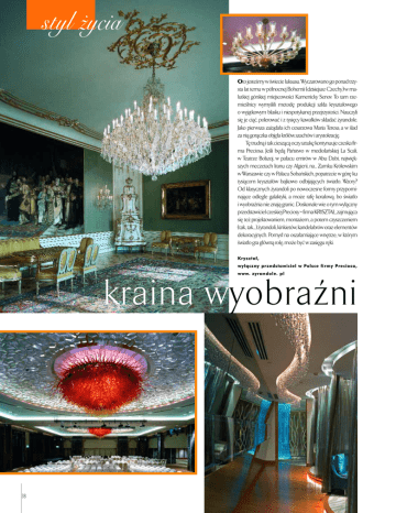 styl ˝ycia Oto jesteÊmy w Êwiecie luksusu. Wyczarowano go ponad trzysta lat temu w pó∏nocnej Bohemii (dzisiejsze Czechy) w malutkiej górskiej miejscowoÊci Kamenicky Senov. To tam rzemieÊlnicy wymyÊlili metod´ produkcji szk∏a kryszta∏owego o wyjàtkowym blasku i niespotykanej przejrzystoÊci. Nauczyli si´ je ciàç, polerowaç i z tysi´cy kawa∏ków sk∏adaç ˝yrandole. Jako pierwsza za˝àda∏a ich cesarzowa Maria Teresa, a w Êlad za nià goràczka obj´∏a królów, szachów i arystokracj´. T´ trudnà i tak cieszàcà oczy sztuk´ kontynuuje czeska firma Preciosa. JeÊli b´dà Paƒstwo w mediolaƒskiej La Scali, w Teatrze Bolszoj, w pa∏acu emirów w Abu Dabi, najwi´kszych meczetach Iranu czy Algierii, na... Zamku Królewskim w Warszawie czy w Pa∏acu Sobaƒskich, popatrzcie w gór´ ku tysiàcom kryszta∏ów bajkowo odbijajàcych Êwiat∏o. Wzory? Od klasycznych ˝yrandoli po nowoczesne formy przypominajàce odleg∏e galaktyki, a mo˝e raf´ koralowà, bo Êwiat∏o i wyobraênia nie znajà granic. Doskonale wie o tym wy∏àczny przedstawiciel czeskiej Preciosy – firma KRYSZTA¸, zajmujàca si´ te˝ projektowaniem, monta˝em, a potem czyszczeniem (tak, tak...) ˝yrandoli, kinkietów, kandelabrów oraz elementów dekoracyjnych. Pomys∏ na osza∏amiajàce wn´trze, w którym Êwiat∏o gra g∏ównà rol´, mo˝e byç w zasi´gu r´ki. Kryszta∏, wy∏àczny przedstawiciel w Polsce firmy Preciosa, www. zyrandole. pl kraina wyobraêni 38