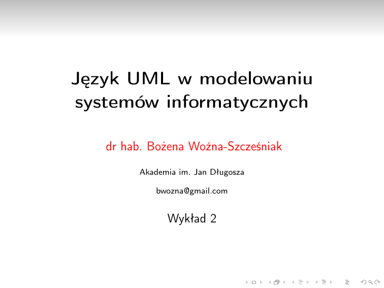 Język UML w modelowaniu systemów informatycznych dr hab. Bożena Woźna-Szcześniak Akademia im. Jan Długosza [email protected] Wykład 2 Związki między klasami • Asocjacja (ang. Associations) • Uogólnienie, dziedziczenie (ang. Generalizations) • Agregacja (ang. Aggregations) • Kompozycja (ang. Composite aggregation) • Zagnieżdżenia (ang. Nestings) • Klasy asocjacyjne (ang. Association Classes) • Zależności (ang. Dependencies) Asocjacja • Asocjacja jest podstawowym rodzajem związków/relacji między klasami i oznacza istnienie trwałego powiązania pomiędzy nimi. • Asocjacja może zawierać nazwane role na każdym końcu, liczebności, kierunki i ograniczenia. • Przykłady asocjacji: • Student studiuje na uczelni • Piłkarz gra w drużynie piłkarskiej • Lekarz pracuje w szpitalu, itd Nazwy, role i liczebność asocjacji • Nazwa asocjacji wskazuje bezpośrednio czynność, jaka zachodzi pomiędzy klasami. Może także wskazywać kierunek. • Role określają jaką rolę pełni dana klasa w asocjacji. Nazwy, role i liczebność asocjacji • Liczebność określa, ile obiektów jednej klasy bierze udział w asocjacji drugiej klasy. • Liczebność można określić stałą cyfrą, np.: 1, 2, 3, 4, itd. • Liczebność można określić jako nieskończoność oznaczane przez * • Liczebność można określić przedziałem, np. • • • • 0..4 - od 0 do 4 2..5 - od 2 do 5 10..1000 - od 10 do 1000 1..* - od 1 do nieskończoność (minimum 1), itd Klasy asocjacyjne • Klasa asocjacyjna to klasa powiązana za pomocą linii przerywanej z asocjacją. • Klasa asocjacyjna opisuje asocjacje pomiędzy klasami, których ta asocjacja dotyczy. • Klasa asocjacyjna umożliwia asocjacji posiadanie operacji i atrybutów. Klasy asocjacyjne • W przypadku występowania klasy asocjacyjnej w kodzie programu, klasy biorące udział w asocjacji mogą, ale nie muszą, posiadać bezpośrednie połączenia pomiędzy sobą. • Zatem nasza klasa Pracownik nie musi mieć bezpośredniego połączenia z klasą Projekt. Klasa Pracownik może mieć na przykład połączenie z klasą Rola, zaś klasa Rola z klasą Projekt. Dzięki temu przez pośrednictwo klasy asocjacyjnej Rola, klasa Pracownik jest powiązana z klasą Projekt. Dziedziczenie (generalizacja) • Generalizacja odpowiada dziedziczeniu znanemu z języków programowania. • Generalizacja to związek pomiędzy bardziej ogólną klasą (rodzicem) a klasą bardziej szczegółową (dzieckiem). • Przykłady generalizacji: • Kwadrat jest Figurą • Fiat jest Samochodem • Pies jest Zwierzęciem, itd. Agregacja • Agregacje są wykorzystywane w celu przedstawienia elementów, które są złożone z mniejszych elementów. • Agregacja, w skrócie, oznacza zawieranie, np. • Dom zawiera okno • Sygnalizacja świetlna zawiera żarówkę • Mieszkanie zawiera telefon • Agregację na diagramie UML oznacza się strzałką z końcem zakończonym pustym rombem, skierowany w kierunku klasy rodzicielskiej. Kompozycja I • Kompozycja jest szczególnym przypadkiem agregacji. • Kompozycja od agregacji różni się tym, że klasa posiada obiekty (składa się z obiektów), które bez tej klasy nie mogły by istnieć. • Jeśli rodzic w kompozycji jest usuwany, zwykle wszystkie jego części są usuwane z nim; jednakże część może zostać indywidualnie usunięte z kompozycji, bez konieczności usuwania całej kompozycji. • Kompozycja jest relacją przechodnią, asymetryczną i może być rekurencyjne. • Kompozycję na diagramie UML oznacza się strzałką z końcem zakończonym wypełnionym rombem, skierowany w kierunku klasy rodzicielskiej. Kompozycja II Różnica między agregacją i kompozycją - przykład Książka adresowa składa się z wielu kontaktów i grup kontaktów. Grupa kontaktów to wirtualne grupowanie kontaktów; każdy kontakt może być zawarty w więcej niż jednej grupie kontaktów. Usunięcie książki adresowej powoduje, że wszystkie kontakty i grupy kontaktowe zostaną usunięte. Usunięcie grupy kontaktów, nie powoduje usunięcia żadnego kontaktu. Zagnieżdżenia Zagnieżdżenie jest relacją pokazującą, że element źródłowy (np. klasa Element) jest zagnieżdżona w elemencie docelowym (np. klasa Stos). Zagnieżdżenia I class Stos { private : c l a s s E l ement { public : i n t dana ; E le m ent ∗ n e x t ; }; E le m e n t ∗ Top ; public : Stos ( ) ; ~Stos (){ c l e a r ( ) ; } ; bool empty ( ) const ; void c l e a r ( ) ; void push ( i n t ) ; Zagnieżdżenia II void pop ( ) ; int top ( ) ; }; Zależności • Zależności używane są do modelowania szerokiego zakresu związków pomiędzy elementami modelu. • Zwykle stosowane są na wczesnym etapie procesu projektowania, gdy wiadomo, że istnieje jakiś związek między dwoma elementami, ale jest zbyt wcześnie, aby dokładnie wiedzieć, jaki jest to związek. • W późniejszym etapie procesu projektowania zależności zostaną uszczegółowione lub zastąpione bardziej konkretnym typem związku. Diagramy klas i związki- przykład Źródło:http://www.uml-diagrams.org/class-diagrams-overview.html Diagramy obiektów • Diagram obiektu może być uważane za szczególny przypadek diagramu klasy. • Diagramy obiektu wykorzystują podzbiór elementów diagramu klas, aby podkreślić związek pomiędzy instancjami klas w pewnym momencie czasowym. • Diagramy obiektu nie pokazują niczego architektonicznie innego do diagramów klas, ale odzwierciedlają wielość i role. Diagramy obiektów - różnice w wyglądzie pomiędzy klasą i obiektem • Klasy składa się z trzech części: nazwa klasy, atrybuty i operacje. • Domyślnie obiekty nie mają takiego przedziału, posiadają tylko nazwę. • Obiekty na diagramie prezentuje się za pomocą prostokątów, w których nazwa jest podkreślona. Po niej, po dwukropku, znajduje się nazwa klasy, której obiekt reprezentuje dany prostokąt. Diagramy obiektów -
