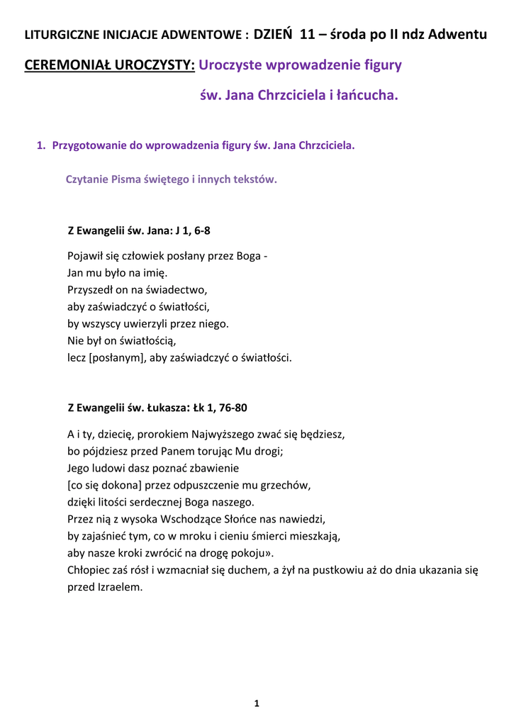 LITURGICZNE INICJACJE ADWENTOWE : DZIEŃ 11 – środa po II ndz Adwentu CEREMONIAŁ UROCZYSTY: Uroczyste wprowadzenie figury św. Jana Chrzciciela i łańcucha. 1. Przygotowanie do wprowadzenia figury św. Jana Chrzciciela. Czytanie Pisma świętego i innych tekstów. Z Ewangelii św. Jana: J 1, 6-8 Pojawił się człowiek posłany przez Boga Jan mu było na imię. Przyszedł on na świadectwo, aby zaświadczyć o światłości, by wszyscy uwierzyli przez niego. Nie był on światłością, lecz [posłanym], aby zaświadczyć o światłości. Z Ewangelii św. Łukasza: Łk 1, 76-80 A i ty, dziecię, prorokiem Najwyższego zwać się będziesz, bo pójdziesz przed Panem torując Mu drogi; Jego ludowi dasz poznać zbawienie [co się dokona] przez odpuszczenie mu grzechów, dzięki litości serdecznej Boga naszego. Przez nią z wysoka Wschodzące Słońce nas nawiedzi, by zajaśnieć tym, co w mroku i cieniu śmierci mieszkają, aby nasze kroki zwrócić na drogę pokoju». Chłopiec zaś rósł i wzmacniał się duchem, a żył na pustkowiu aż do dnia ukazania się przed Izraelem. 1 Z Orędzi na Czasy na Czasy Ostateczne: Po czytaniu Pisma świętego i innych tekstów wnosimy figurę św. Jana Chrzciciela do szopki adwentowej śpiewając pieśń: 2 2. Przygotowanie do wprowadzenia łańcucha. Czytanie Pisma świętego i innych tekstów. Z listu św. Pawła do Rzymian: Rz 6, 6-7 To wiedzcie, że dla zniszczenia grzesznego ciała dawny nasz człowiek został razem z Nim ukrzyżowany po to, byśmy już więcej nie byli w niewoli grzechu. Kto bowiem umarł, stał się wolny od grzechu. Z Ewangelii św. Jana: J 8, 34-36 Odpowiedział im Jezus: «Zaprawdę, zaprawdę, powiadam wam: Każdy, kto popełnia grzech, jest niewolnikiem grzechu. A niewolnik nie przebywa w domu na zawsze, lecz Syn przebywa na zawsze. Jeżeli więc Syn was wyzwoli, wówczas będziecie rzeczywiście wolni. Z księgi Mądrości: Mdr 10, 15-21; 11, 1-4 Mądrość wyzwala Izraela Ona wyrwała lud święty, plemię nienaganne, spośród narodu ciemięzców. Wstąpiła w duszę Sługi Pańskiego, w znakach i cudach groźnym władcom się przeciwstawiła. Oddała świętym zapłatę ich trudów, powiodła ich drogą cudowną i stała się im za dnia osłoną, a światłem gwiazd wśród nocy. Przeprawiła ich przez Morze Czerwone, przeprowadziła poprzez wody mnogie, a wrogów ich potopiła i wyrzuciła z głębin otchłani. Wzięli więc sprawiedliwi łupy z bezbożnych i opiewali, Panie, święte imię Twoje, i sławili zgodnie zwycięską Twą rękę. Mądrość bowiem otworzyła usta niemych i głośnymi uczyniła języki niewprawnych. Poszczęściła ich dziełom przez ręce świętego Proroka: przebyli bezludną pustynię i rozbili namioty w miejscach niedostępnych. Stawili czoło nieprzyjaciołom i odparli wrogów. Wołali do Ciebie, gdy byli spragnieni, i otrzymali wodę z litej skały, w pragnieniu ochłodę - z kamienia twardego. 3 Z księgi Jeremiasza: Jr 30, 10-11 Ty się jednak nie bój, sługo mój Jakubie - wyrocznia Pana i nie lękaj się, Izraelu, bo Ja cię wybawię z dalekiej ziemi, twoje potomstwo z kraju jego wygnania. Powróci Jakub i będzie zażywał nie zmąconego niczym pokoju, a nikt go nie będzie trwożył. Ja bowiem jestem z tobą - wyrocznia Pana by cię wybawić. Zgotuję zagładę wszystkim narodom, między którymi cię rozproszyłem, ciebie zaś nie wyniszczę. Ukarzę cię jednak sprawiedliwie i nie ujdziesz zupełnie bezkarnie» Po czytaniu Pisma świętego wnosimy łańcuch do szopki adwentowej śpiewając pieśń: 4