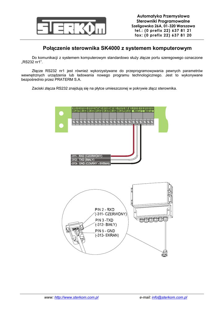 Automatyka Przemysłowa Sterowniki Programowalne Szeligowska 26A, 01-320 Warszawa tel.: ( 0 pr efix 22) 637 81 21 fax: ( 0 pr efix 22) 637 81 20 Połączenie sterownika SK4000 z systemem komputerowym Do komunikacji z systemem komputerowym standardowo służy złącze portu szeregowego oznaczone „RS232 nr1”. Złącze RS232 nr1 jest również wykorzystywane do przeprogramowywania pewnych parametrów wewnętrznych urządzenia lub ładowania nowego programu technologicznego. Jest to wykonywane bezpośrednio przez PRATERM S.A. Zaciski złącza RS232 znajdują się na płytce umieszczonej w pokrywie złącz sterownika. www: http://www.sterkom.com.pl e-mail: [email protected]
