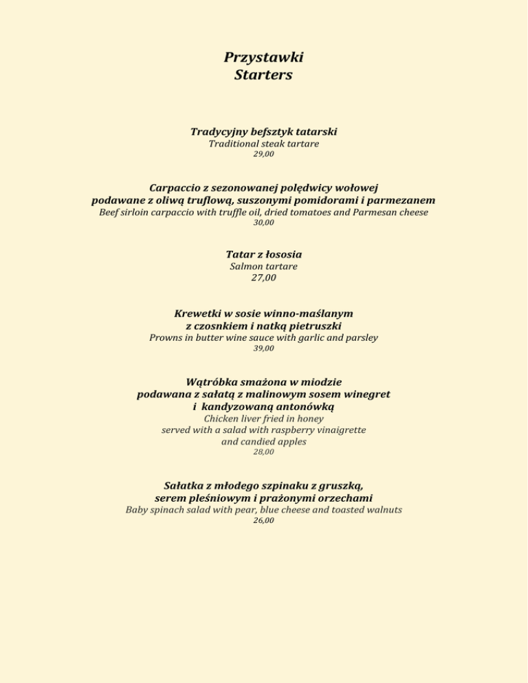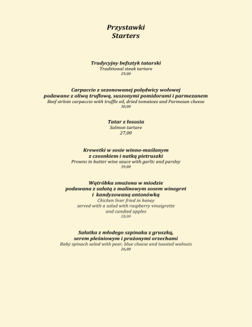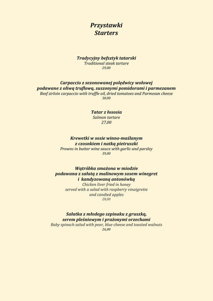 Przystawki Starters Tradycyjny befsztyk tatarski Traditional steak tartare 29,00 Carpaccio z sezonowanej polędwicy wołowej podawane z oliwą truflową, suszonymi pomidorami i parmezanem Beef sirloin carpaccio with truffle oil, dried tomatoes and Parmesan cheese 30,00 Tatar z łososia Salmon tartare 27,00 Krewetki w sosie winno-maślanym z czosnkiem i natką pietruszki Prowns in butter wine sauce with garlic and parsley 39,00 Wątróbka smażona w miodzie podawana z sałatą z malinowym sosem winegret i kandyzowaną antonówką Chicken liver fried in honey served with a salad with raspberry vinaigrette and candied apples 28,00 Sałatka z młodego szpinaku z gruszką, serem pleśniowym i prażonymi orzechami Baby spinach salad with pear, blue cheese and toasted walnuts 26,00 Zupy Soups Zupa cebulowa z tymiankiem, parmezanem i grzankami Onion soup with thyme, parmesan cheese and croutons 16,00 Chowder – śmietanowa zupa z owocami morza Chowder 19,00 Stracciatella - rosół z parmezanowymi kluseczkami Stracciatella – broth with parmesan cheese noodles 17,00 Krem z brokułów z prażonymi płatkami migdałów Cream of broccoli with roasted almonds 16,00 Żurek na zakwasie z jajkiem i białą kiełbasą Traditional polish sour soup with egg and sausage 17,00 Dania główne Main courses Gryczane risotto z kurkami i kozim serem Buckwheat risotto with chanterelles and goat cheese 26,00 Policzki wołowe w naturalnym sosie podawane z puree selerowo-pietruszkowym i szparagami Beef cheeks in a natural sauce served with mashed celery-parsley and asparagus 49,00 Pierś kurczaka z chrupiącą skórką podawana ze szpinakiem z gorgonzolą puree z marchewki i ziemniakami au gratin Chicken breast with crispy skin served on spinach with gorgonzola and potatoes au gratin 34,00 Kaczka pieczona w majeranku podawana z gnocchi i puree z buraczków Roasted duck in marjoram served with gnocchi and beet puree 54,00 Stek z wołowiny sezonowanej podawany z sosem z kolorowego pieprzu ( lub masłem czosnkowym), pieczonymi ziemniakami , pieczarkami z patelni i sałatą z sosem winegret Seasoned beef steak served with colored pepper sauce ( or garlic butter) baked potatoes and mix salad 59,00 Grillowany łosoś z sosem z kopru włoskiego, z warzywami pieczonymi w miodzie z ziołami Grilled salmon with fennel sauce served with vegetables roasted in honey and herbs 49,00 Desery Desserts Brownie z gałką lodów waniliowych i wiśniowym sosem Brownie with vanilla ice cream and cherry sauce 17,00 Lody waniliowe z gorącymi malinami Vanilla ice-cream with hot raspberries 15,00 Lody czekoladowe z syropem ze świeżej mięty Chocolate ice cream with fresh mint syrup 15,00
