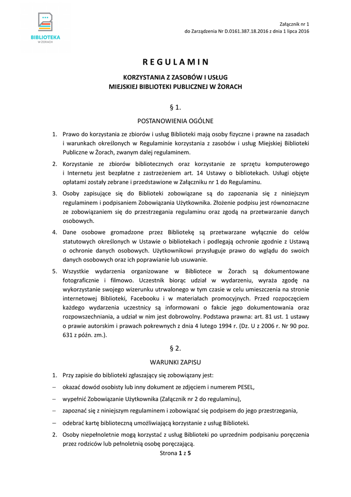 Załącznik nr 1 do Zarządzenia Nr D.0161.387.18.2016 z dnia 1 lipca 2016 REGULAMIN KORZYSTANIA Z ZASOBÓW I USŁUG MIEJSKIEJ BIBLIOTEKI PUBLICZNEJ W ŻORACH § 1. POSTANOWIENIA OGÓLNE 1. Prawo do korzystania ze zbiorów i usług Biblioteki mają osoby fizyczne i prawne na zasadach i warunkach określonych w Regulaminie korzystania z zasobów i usług Miejskiej Biblioteki Publiczne w Żorach, zwanym dalej regulaminem. 2. Korzystanie ze zbiorów bibliotecznych oraz korzystanie ze sprzętu komputerowego i Internetu jest bezpłatne z zastrzeżeniem art. 14 Ustawy o bibliotekach. Usługi objęte opłatami zostały zebrane i przedstawione w Załączniku nr 1 do Regulaminu. 3. Osoby zapisujące się do Biblioteki zobowiązane są do zapoznania się z niniejszym regulaminem i podpisaniem Zobowiązania Użytkownika. Złożenie podpisu jest równoznaczne ze zobowiązaniem się do przestrzegania regulaminu oraz zgodą na przetwarzanie danych osobowych. 4. Dane osobowe gromadzone przez Bibliotekę są przetwarzane wyłącznie do celów statutowych określonych w Ustawie o bibliotekach i podlegają ochronie zgodnie z Ustawą o ochronie danych osobowych. Użytkownikowi przysługuje prawo do wglądu do swoich danych osobowych oraz ich poprawianie lub usuwanie. 5. Wszystkie wydarzenia organizowane w Bibliotece w Żorach są dokumentowane fotograficznie i filmowo. Uczestnik biorąc udział w wydarzeniu, wyraża zgodę na wykorzystanie swojego wizerunku utrwalonego w tym czasie w celu umieszczenia na stronie internetowej Biblioteki, Facebooku i w materiałach promocyjnych. Przed rozpoczęciem każdego wydarzenia uczestnicy są informowani o fakcie jego dokumentowania oraz rozpowszechniania, a udział w nim jest dobrowolny. Podstawa prawna: art. 81 ust. 1 ustawy o prawie autorskim i prawach pokrewnych z dnia 4 lutego 1994 r. (Dz. U z 2006 r. Nr 90 poz. 631 z późn. zm.). § 2. WARUNKI ZAPISU 1. Przy zapisie do biblioteki zgłaszający się zobowiązany jest: − okazać dowód osobisty lub inny dokument ze zdjęciem i numerem PESEL, − wypełnić Zobowiązanie Użytkownika (Załącznik nr 2 do regulaminu), − zapoznać się z niniejszym regulaminem i zobowiązać się podpisem do jego przestrzegania, − odebrać kartę biblioteczną umożliwiającą korzystanie z usług Biblioteki. 2. Osoby niepełnoletnie mogą korzystać z usług Biblioteki po uprzednim podpisaniu poręczenia przez rodziców lub pełnoletnią osobę poręczającą. Strona 1 z 5 Załącznik nr 1 do Zarządzenia Nr D.0161.387.18.2016 z dnia 1 lipca 2016 3. Podpisanie oświadczenia o zapoznaniu się z regulaminem jest równoznaczne z przyjęciem odpowiedzialności za stan techniczny wypożyczonych materiałów bibliotecznych i ich terminowy zwrot. Za osoby niepełnoletnie odpowiedzialność ponoszą rodzice lub opiekunowie prawni. 4. Osoby zapisane do Biblioteki zobowiązane są do informowania o każdej zmianie miejsca stałego lub czasowego pobytu w możliwie najkrótszym terminie. 5. Biblioteka udostępnia swoje zbiory użytkownikom działającym osobiście lub poprzez pełnomocników. Pełnomocnik wskazany w Zobowiązaniu Użytkownika posługuje się kartą biblioteczną osoby, w imieniu której występuje. § 3. KARTY BIBLIOTECZNE 1. Na karcie bibliotecznej znajduje się napis „Miejska Biblioteka Publiczna w Żorach”, adres strony internetowej Biblioteki, numer karty, numer identyfikacyjny PIN oraz kod kreskowy. 2. Użytkownik posiadający kartę biblioteczną ma prawo do korzystania w pełnym zakresie ze zbiorów i usług całej sieci bibliotecznej Miejskiej Biblioteki Publicznej na zasadach określonych w niniejszym Regulaminie. 3. Korzystając z usług Biblioteki Użytkownik każdorazowo może zostać poproszony o okazanie karty bibliotecznej za wyjątkiem zwrotu zbiorów. 4. Korzystający z usług Bibliotek nie mogą posługiwać się kartami innych osób za wyjątkiem sytuacji wskazanej w § 2 pkt 5. 5. Karta biblioteczna jest ważna na okres jednego roku, a po upływie tego czasu wymagana jest prolongata. 6. Bibliotekarz ma prawo poprosić Użytkownika o okazanie dokumentu tożsamości ze zdjęciem. 7. Posługiwanie się kartą biblioteczną przez osoby nieuprawnione może skutkować zatrzymaniem karty i zablokowaniem konta czytelniczego. 8. Zagubienie lub kradzież karty należy niezwłocznie zgłosić w dowolnej placówce Biblioteki osobiście lub telefonicznie. W przeciwnym razie użytkownik karty zostanie obciążony ewentualnymi kosztami wynikłymi z posługiwania się kartą przez osoby nieuprawnione. 9. Koszt wystawienia duplikatu karty ponosi Użytkownik. Czas ważności duplikatu jest identyczny jak czas ważności karty pierwotnej. § 4. ZASADY UDOSTĘPNIANIA 1. Wypożyczyć można jednorazowo: - 6 książek wraz z dokumentami towarzyszącymi na okres nie dłuższy niż 30 dni, - czytnik ebooków na okres nie dłuższy niż 30 dni - 2 tytuły audiobooka na okres nie dłuższy niż 30 dni, - 2 płyty wraz z dokumentami towarzyszącymi na okres nie dłuższy niż 7 dni, - 3 egzemplarze czasopism na okres nie dłuższy niż 7 dni, - 2 książki ze zbiorów czytelni na okres nie dłuższy niż 2 dni. 2. W przypadku osób starszych i niepełnosprawnych możliwe jest zwiększenie limitu do 10 Strona 2 z 5 Załącznik nr 1 do Zarządzenia Nr D.0161.387.18.2016 z dnia 1 lipca 2016 wypożyczonych woluminów książek w jednej placówce oraz wydłużenie terminu zwrotu wypożyczanych pozycji. O zwiększeniu limitu decyduje bibliotekarz. 3. Bibliotekarz może ograniczyć liczbę wypożyczanych pozycji osobom nie posiadającym stałego miejsca pobytu na terenie miasta Żory. 4. Wybrane zbiory Użytkownik rejestruje u dyżurnego bibliotekarza. Wypożyczone zbiory można zwracać tylko w tej placówce, w której zostały wypożyczone. 5. Wszelkie uszkodzenia i defekty wypożyczanych materiałów bibliotecznych Użytkownik powinien zgłaszać niezwłocznie po ich zauważeniu. W przeciwnym wypadku odpowiada on za powstałą 