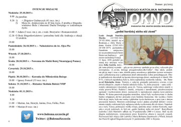 Numer: 30/2015 INTENCJE MSZALNE Niedziela: 25.10.2015 r. 8.00 Za parafian 9.30 1) 2) + Zbigniew Grabarczyk (41 rocz. śm.) Msza św. dziękczynna za 42 lata życia. Z prośbą o błogosławieństwo Boże i obecność Ducha Świętego w codziennym życiu. 11.00 + Adam (3 rocz. śm.); zm. z rodz. Brożynów i Romanowskich 12.30 O Boże błogosławieństwo i potrzebne łaski dla Andrzeja z okazji 12 urodzin. 19.00 Poniedziałek: 26.10.2015 r. - Nabożeństwo do św. Ojca Pio 18.00 Wtorek: 27.10.2015 r. 18.00 Środa: 28.10.2015 r. - Nowenna do Matki Bożej Nieustającej Pomocy 18.00 Czwartek: 29.10.2015 r. 18.00 Piątek: 30.10.2015 r. - Koronka do Miłosierdzia Bożego 18.00 + Ignacy Frencel (33 rocz. śm.) Sobota: 31.10.2015 r. - Różaniec Siedmiu Boleści NMP 18.00 Niedziela: 01.11.2015 r. 8.00 9.30 11.00 + Marian, Jan, Henryk, Janina, Ewa, Feliks, Piotr. 19.00 + Marian (8 rocz. śm.) www.bolesna.szczecin.pl 4 Twitter: @BolesnaSzczecin „godni bardziej nieba niż ziemi” Louis Joseph Stanislas Martin (22 VIII 182329 VII 1894) urodził się w Bordeaux, a Zelia Maria z domu Guèrin (23XI 183128 VIII 1877) pochodziła z Gandelain – miejscowości na przedmieściach SaintDenis-sur-Sarthon w północno-zachodniej Francji. 13 lipca 1858 poślubił poznaną trzy miesiące wcześniej Zelię Guèrin, która – jak sama później wyznała – gdy po raz pierwszy spotkała go na ulicy, usłyszała głos wewnętrzny, iż „to ten, którego przygotowałem dla Ciebie”. Ona także, podobnie jak jej mąż i wraz z nim, dzieliła pracę zawodową z głębokim życiem wewnętrznym i pobożnością oraz z pełnieniem dzieł miłosierdzia wobec potrzebujących. Oboje małżonkowie doczekali się łącznie dziewięciorga dzieci, urodzonych w latach 1860-73, z których najmłodszą była ta, która najbardziej rozsławiła rodzinę – św. Teresa od Dzieciątka Jezus. Niestety, z całej tej gromadki potomstwa czworo, w tym dwóch chłopców, zmarło w bardzo młodym wieku. Te, które przeżyły – same córki – zostały zakonnicami i doczekały, poza św. Teresą, sędziwego wieku (dwie zmarły w wieku prawie 90 lat). Radości i smutki, związane z narodzinami, przedwczesnymi zgonami i wychowaniem dzieci, naznaczyły w największym stopniu życie państwa Martin. W domu panowała pogodna atmosfera, dzieci były wychowywane w duchu bardzo religijnym, ale bez przesady a tym bardziej fanatyzmu. Jak wynika z listów Zelii do jej męża, była ona osobą o głębokim życiu duchowym, a przy tym z dużym poczuciem humoru. Heroizm codziennego życia i piękny przykład miłości i zrozumienia między rodzicami były najlepszą szkołą wychowania dla ich dzieci. Najmłodsza z nich, Teresa, późniejsza wielka święta, patronka misji i doktor Kościoła, napisała o swych rodzicach, że byli oni „godni bardziej nieba niż ziemi”. Beatyfikacja Ludwika i Zelii Martinów odbyła się 19 października 2008 w Lisieux. Stali się oni drugim małżeństwem, wyniesionym przez Kościół na ołtarze w naszych czasach. Pierwszymi byli Alojzy (lub Ludwik) i Maria Beltrame Quattrocchi z Włoch, których Jan Paweł II ogłosił błogosławionymi 21 października 2001 w Rzymie. 1 Liturgia słowa – XXX niedziela zwykła I czytanie (Jr 31,7-9) To bowiem mówi Pan: Wykrzykujcie radośnie na cześć Jakuba, weselcie się pierwszym wśród narodów! Głoście, wychwalajcie i mówcie: Pan wybawił swój lud, Resztę Izraela! Oto sprowadzę ich z ziemi północnej i zgromadzę ich z krańców ziemi. Są wśród nich niewidomi i dotknięci kalectwem, kobieta brzemienna wraz z położnicą: powracają wielką gromadą. Oto wyszli z płaczem, lecz wśród pociech ich przyprowadzę. Przywiodę ich do strumienia wody równą drogą - nie potkną się na niej. Jestem bowiem ojcem dla Izraela, a Efraim jest moim synem pierworodnym. II czytanie (Hbr 5,1-6) Każdy arcykapłan z ludzi brany, dla ludzi bywa ustanawiany w sprawach odnoszących się do Boga, aby składał dary i ofiary za grzechy. Może on współczuć z tymi, którzy nie wiedzą i błądzą, ponieważ sam podlega słabościom. I ze względu na nią powinien jak za lud, tak i za samego siebie składać ofiary za grzechy. I nikt sam sobie nie bierze tej godności, lecz tylko ten, kto jest powołany przez Boga jak Aaron. Podobnie i Chrystus nie sam siebie okrył sławą przez to, iż stał się arcykapłanem, ale /uczynił to/ Ten, który powiedział do Niego: Ty jesteś moim Synem, jam Cię dziś zrodził, jak i w innym /miejscu/: Tyś jest kapłanem na wieki na wzór Melchizedeka. Ewangelia (Mk 10,46-52) Gdy Jezus wraz z uczniami i sporym tłumem wychodził z Jerycha, niewidomy żebrak, Bartymeusz, syn Tymeusza, siedział przy drodze. Ten słysząc, że to jest Jezus z Nazaretu, zaczął wołać: Jezusie, Synu Dawida, ulituj się nade mną! Wielu nastawało na niego, żeby umilkł. Lecz on jeszcze głośniej wołał: Synu Dawida, ulituj się nade mną! Jezus przystanął i rzekł: Zawołajcie go! I przywołali niewidomego, mówiąc mu: Bądź dobrej myśli, wstań, woła cię. On zrzucił z siebie płaszcz, zerwał się i przyszedł do Jezusa. A Jezus przemówił do niego: Co chcesz, abym ci uczynił? Powiedział Mu niewidomy: Rabbuni, żebym przejrzał. Jezus mu rzekł: Idź, twoja wiara cię uzdrowiła. Natychmiast przejrzał i szedł za Nim drogą. 2 Ogłoszenia duszpasterskie - 25.10.2015 r. 1. Zapraszamy na ostatnie już nabożeństwa różańcowe, dzisiaj o godz. 18 30, a od poniedziałku do piątku po Mszy św. wieczornej. W sposób szczególny zapraszamy na różaniec w piątek, który odmawiamy przy figurze Matki Bożej na placu kościelnym. 2. „Modlitwa za żywych i zmarłych” jest jednym z siedmiu uczynków miłosierdzia, co do duszy. Dlatego słuszna jest modlitwa za ludzi, którzy już dawno zmarli. Modlitwa za zmarłych tzw. „wypominki” od 1 listopada będą w naszym kościele w dni powszednie po Mszy św. wieczornej, a w niedzielę o godz. 18 3