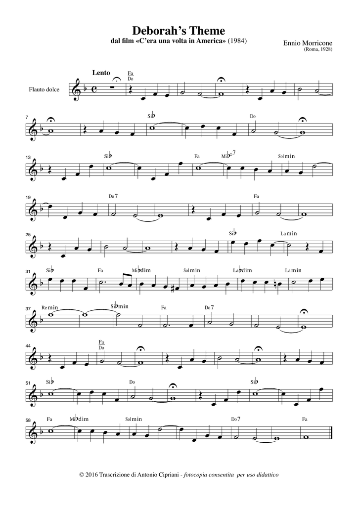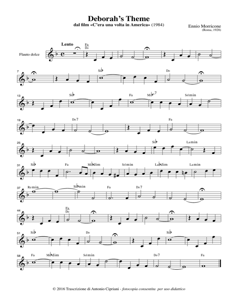 Deborah’s Theme dal film «C’era una volta in America» (1984) Ennio Morricone (Roma, 1928) Lento Flauto dolce 7 U b & w &b c U w U C ∑ Œ F Œ œ œ ˙ ˙ ˙ œ ˙ œ œ œ Bb C U œ œ œ œ ˙ Œ œ œ œ w ˙ w b w &b Œ œ œ œ œ B 13 &b œ œ œ œ C7 19 ˙ œ œ œ ˙ w F bo7 œ œ œ œ E Œ œ œ ˙ G min F w œ œ œ ˙ ˙ Bb A min œ œ œ œ ˙ Œ œ Œ œ œ œ w &b Œ œ œ œ ˙ ˙ w Bb F E bdim G min A bdim A min œ œ œ œ ˙. œ œ œ œ œ œ œ nœ ˙ œ œ œ œ œ &b œ œ #œ B bmin D min F C7 U w w ˙ b & ˙ ˙. œ ˙ ˙ ˙ ˙ w 25 31 37 F C &b Œ œ œ œ ˙ ˙ Bb C œ œ œ œ ˙ &b w 44 51 &b w 58 F E U w Œ ˙ bdim G min œ œ œ œ œ œ ˙ U w œ œ œ œ ˙ ˙ U w Œ œ œ œ b œ w Œ œ œ œ B C7 œ œ œ ˙ ˙ w © 2016 Trascrizione di Antonio Cipriani - fotocopia consentita per uso didattico œ œ F w œ