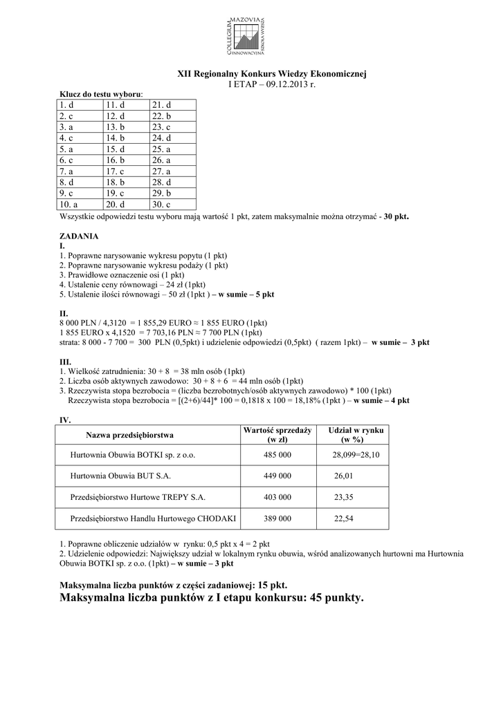 XII Regionalny Konkurs Wiedzy Ekonomicznej I ETAP – 09.12.2013 r. Klucz do testu wyboru: 1. d 2. c 3. a 4. c 5. a 6. c 7. a 8. d 9. c 10. a 11. d 12. d 13. b 14. b 15. d 16. b 17. c 18. b 19. c 20. d 21. d 22. b 23. c 24. d 25. a 26. a 27. a 28. d 29. b 30. c Wszystkie odpowiedzi testu wyboru mają wartość 1 pkt, zatem maksymalnie moŜna otrzymać - 30 pkt. ZADANIA I. 1. Poprawne narysowanie wykresu popytu (1 pkt) 2. Poprawne narysowanie wykresu podaŜy (1 pkt) 3. Prawidłowe oznaczenie osi (1 pkt) 4. Ustalenie ceny równowagi – 24 zł (1pkt) 5. Ustalenie ilości równowagi – 50 zł (1pkt ) – w sumie – 5 pkt II. 8 000 PLN / 4,3120 = 1 855,29 EURO ≈ 1 855 EURO (1pkt) 1 855 EURO x 4,1520 = 7 703,16 PLN ≈ 7 700 PLN (1pkt) strata: 8 000 - 7 700 = 300 PLN (0,5pkt) i udzielenie odpowiedzi (0,5pkt) ( razem 1pkt) – w sumie – 3 pkt III. 1. Wielkość zatrudnienia: 30 + 8 = 38 mln osób (1pkt) 2. Liczba osób aktywnych zawodowo: 30 + 8 + 6 = 44 mln osób (1pkt) 3. Rzeczywista stopa bezrobocia = (liczba bezrobotnych/osób aktywnych zawodowo) * 100 (1pkt) Rzeczywista stopa bezrobocia = [(2+6)/44]* 100 = 0,1818 x 100 = 18,18% (1pkt ) – w sumie – 4 pkt IV. Wartość sprzedaŜy (w zł) Udział w rynku (w %) Hurtownia Obuwia BOTKI sp. z o.o. 485 000 28,099=28,10 Hurtownia Obuwia BUT S.A. 449 000 26,01 Przedsiębiorstwo Hurtowe TREPY S.A. 403 000 23,35 Przedsiębiorstwo Handlu Hurtowego CHODAKI 389 000 22,54 Nazwa przedsiębiorstwa 1. Poprawne obliczenie udziałów w rynku: 0,5 pkt x 4 = 2 pkt 2. Udzielenie odpowiedzi: Największy udział w lokalnym rynku obuwia, wśród analizowanych hurtowni ma Hurtownia Obuwia BOTKI sp. z o.o. (1pkt) – w sumie – 3 pkt Maksymalna liczba punktów z części zadaniowej: 15 pkt. Maksymalna liczba punktów z I etapu konkursu: 45 punkty.