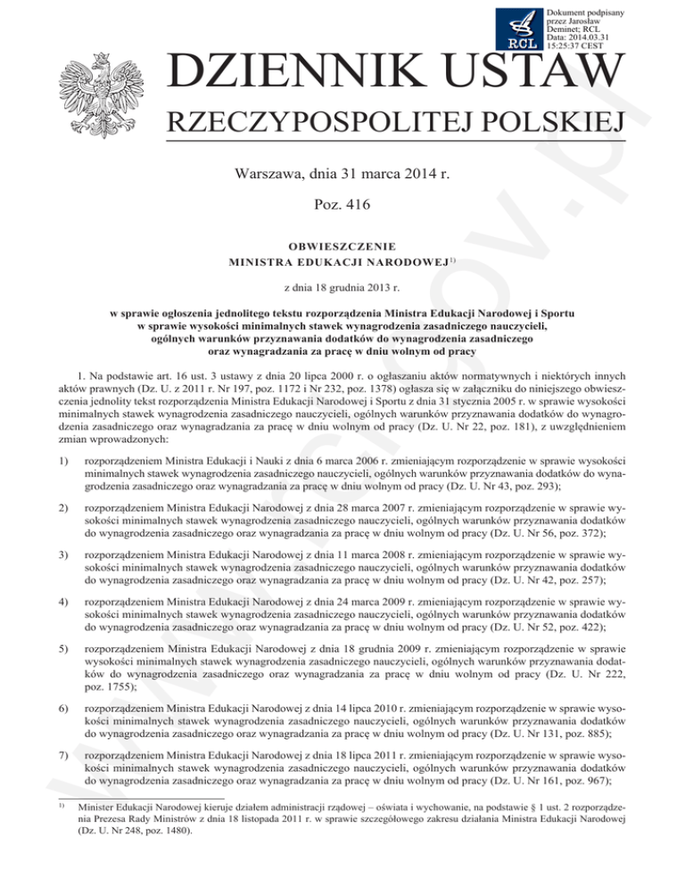 Dokument podpisany przez Jarosław Deminet; RCL Data: 2014.03.31 15:25:37 CEST DZIENNIK USTAW v.p l RZECZYPOSPOLITEJ POLSKIEJ Warszawa, dnia 31 marca 2014 r. Poz. 416 OBWIESZCZENIE MINISTRA EDUKACJI NARODOWEJ 1) .go z dnia 18 grudnia 2013 r. w sprawie ogłoszenia jednolitego tekstu rozporządzenia Ministra Edukacji Narodowej i Sportu w sprawie wysokości minimalnych stawek wynagrodzenia zasadniczego nauczycieli, ogólnych warunków przyznawania dodatków do wynagrodzenia zasadniczego oraz wynagradzania za pracę w dniu wolnym od pracy 1) w. rcl 1. Na podstawie art. 16 ust. 3 ustawy z dnia 20 lipca 2000 r. o ogłaszaniu aktów normatywnych i niektórych innych aktów prawnych (Dz. U. z 2011 r. Nr 197, poz. 1172 i Nr 232, poz. 1378) ogłasza się w załączniku do niniejszego obwieszczenia jednolity tekst rozporządzenia Ministra Edukacji Narodowej i Sportu z dnia 31 stycznia 2005 r. w sprawie wysokości minimalnych stawek wynagrodzenia zasadniczego nauczycieli, ogólnych warunków przyznawania dodatków do wynagrodzenia zasadniczego oraz wynagradzania za pracę w dniu wolnym od pracy (Dz. U. Nr 22, poz. 181), z uwzględnieniem zmian wprowadzonych: rozporządzeniem Ministra Edukacji i Nauki z dnia 6 marca 2006 r. zmieniającym rozporządzenie w sprawie wysokości minimalnych stawek wynagrodzenia zasadniczego nauczycieli, ogólnych warunków przyznawania dodatków do wynagrodzenia zasadniczego oraz wynagradzania za pracę w dniu wolnym od pracy (Dz. U. Nr 43, poz. 293); 2)rozporządzeniem Ministra Edukacji Narodowej z dnia 28 marca 2007 r. zmieniającym rozporządzenie w sprawie wysokości minimalnych stawek wynagrodzenia zasadniczego nauczycieli, ogólnych warunków przyznawania dodatków do wynagrodzenia zasadniczego oraz wynagradzania za pracę w dniu wolnym od pracy (Dz. U. Nr 56, poz. 372); 3)rozporządzeniem Ministra Edukacji Narodowej z dnia 11 marca 2008 r. zmieniającym rozporządzenie w sprawie wysokości minimalnych stawek wynagrodzenia zasadniczego nauczycieli, ogólnych warunków przyznawania dodatków do wynagrodzenia zasadniczego oraz wynagradzania za pracę w dniu wolnym od pracy (Dz. U. Nr 42, poz. 257); 4)rozporządzeniem Ministra Edukacji Narodowej z dnia 24 marca 2009 r. zmieniającym rozporządzenie w sprawie wysokości minimalnych stawek wynagrodzenia zasadniczego nauczycieli, ogólnych warunków przyznawania dodatków do wynagrodzenia zasadniczego oraz wynagradzania za pracę w dniu wolnym od pracy (Dz. U. Nr 52, poz. 422); ww 5)rozporządzeniem Ministra Edukacji Narodowej z dnia 18 grudnia 2009 r. zmieniającym rozporządzenie w sprawie wysokości minimalnych stawek wynagrodzenia zasadniczego nauczycieli, ogólnych warunków przyznawania dodatków do wynagrodzenia zasadniczego oraz wynagradzania za pracę w dniu wolnym od pracy (Dz. U. Nr 222, poz. 1755); 6)rozporządzeniem Ministra Edukacji Narodowej z dnia 14 lipca 2010 r. zmieniającym rozporządzenie w sprawie wysokości minimalnych stawek wynagrodzenia zasadniczego nauczycieli, ogólnych warunków przyznawania dodatków do wynagrodzenia zasadniczego oraz wynagradzania za pracę w dniu wolnym od pracy (Dz. U. Nr 131, poz. 885); 7)rozporządzeniem Ministra Edukacji Narodowej z dnia 18 lipca 2011 r. zmieniającym rozporządzenie w sprawie wysokości minimalnych stawek wynagrodzenia zasadniczego nauczycieli, ogólnych warunków przyznawania dodatków do wynagrodzenia zasadniczego oraz wynagradzania za pracę w dniu wolnym od pracy (Dz. U. Nr 161, poz. 967); 1) Minister Edukacji Narodowej kieruje działem administracji rządowej – oświata i wychowanie, na podstawie § 1 ust. 2 rozporządzenia Prezesa Rady Ministrów z dnia 18 listopada 2011 r. w sprawie szczegółowego zakresu działania Ministra Edukacji Narodowej (Dz. U. Nr 248, poz. 1480). Dziennik Ustaw –2– Poz. 416 9) v.p l 8)rozporządzeniem Ministra Edukacji Narodowej z dnia 3 lipca 2012 r. zmieniającym rozporządzenie w sprawie wysokości minimalnych stawek wynagrodzenia zasadniczego nauczycieli, ogólnych warunków przyznawania dodatków do wynagrodzenia zasadniczego oraz wynagradzania za pracę w dniu wolnym od pracy (Dz. U. poz. 790); rozporządzeniem Ministra Edukacji Narodowej z dnia 1 sierpnia 2013 r. zmieniającym rozporządzenie w sprawie wysokości minimalnych stawek wynagrodzenia zasadniczego nauczycieli, ogólnych warunków przyznawania dodatków do wynagrodzenia zasadniczego oraz wynagradzania za pracę w dniu wolnym od pracy (Dz. U. poz. 913). 2. Podany w załączniku do niniejszego obwieszczenia tekst jednolity rozporządzenia nie obejmuje: 1)§ 2 i § 3 rozporządzenia Ministra Edukacji i Nauki z dnia 6 marca 2006 r. zmieniającego rozporządzenie w sprawie wysokości minimalnych stawek wynagrodzenia zasadniczego nauczycieli, ogólnych warunków przyznawania dodatków do wynagrodzenia zasadniczego oraz wynagradzania za pracę w dniu wolnym od pracy (Dz. U. Nr 43, poz. 293), które stanowią: .go „§ 2. Przepisy rozporządzenia mają zastosowanie do wynagrodzeń należnych od dnia 1 stycznia 2006 r. § 3. Rozporządzenie wchodzi w życie z dniem ogłoszenia.”; 2)§ 2 i § 3 rozporządzenia Ministra Edukacji Narodowej z dnia 28 marca 2007 r. zmieniającego rozporządzenie w sprawie wysokości minimalnych stawek wynagrodzenia zasadniczego nauczycieli, ogólnych warunków przyznawania dodatków do wynagrodzenia zasadniczego oraz wynagradzania za pracę w dniu wolnym od pracy (Dz. U. Nr 56, poz. 372), które stanowią: „§ 2. Przepisy rozporządzenia mają zastosowanie do wynagrodzeń należnych od dnia 1 stycznia 2007 r. § 3. Rozporządzenie wchodzi w życie z dniem ogłoszenia.”; w. rcl 3)§ 2 i § 3 rozporządzenia Ministra Edukacji Narodowej z dnia 11 marca 2008 r. zmieniającego rozporządzenie w sprawie wysokości minimalnych stawek wynagrodzenia zasadniczego nauczycieli, ogólnych warunków przyznawania dodatków do wynagrodzenia zasadniczego oraz wynagradzania za pracę w dniu wolnym od pracy (Dz. U. Nr 42, poz. 257), które