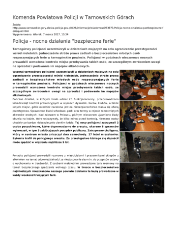 Komenda Powiatowa Policji w Tarnowskich Górach Źródło: http://www.tarnowskie-gory.slaska.policja.gov.pl/k26/informacje/wiadomosci/63973,Policja-nocne-dzialania-quotbezpieczne-f eriequot.html Wygenerowano: Wtorek, 7 marca 2017, 10:34 Policja - nocne działania "bezpieczne ferie" Tarnogórscy policjanci uczestniczyli w działaniach mających na celu ograniczenie przestępczości wśród nieletnich. Jednocześnie stróże prawa zadbali o bezpieczeństwo młodych osób rozpoczynających ferie w tarnogórskim powiecie. Policjanci w godzinach wieczorowo nocnych prowadzili wzmożone kontrole miejsc przebywania takich osób, ze szczególnym zwróceniem uwagi na sprzedaż i podawanie im napojów alkoholowych. Wczoraj tarnogórscy policjanci uczestniczyli w działaniach mających na celu ograniczenie przestępczości wśród nieletnich. Jednocześnie stróże prawa zadbali o bezpieczeństwo młodych osób rozpoczynających ferie w tarnogórskim powiecie. Policjanci w godzinach wieczorowo nocnych prowadzili wzmożone kontrole miejsc przebywania takich osób, ze szczególnym zwróceniem uwagi na sprzedaż i podawanie im napojów alkoholowych. Podczas działań, w których brało udział 25 funkcjonariuszy, przeprowadzono kilkadziesiąt kontroli prewencyjnych w rejonach dyskotek, barów, klubów, a także innych miejsc, gdzie młodzież narażona jest na niebezpieczeństwo stania się ofiarą przestępstwa. Sprawdzono klatki schodowe, parki oraz tereny w rejonie zamarzniętych akwenów wodnych. Nad zalewem w Pniowcu, późnym wieczorem ujawniono ślady obuwia na lodzie, które wskazywały, że kilka minut przed kontrolą, nieznane osoby chodziły po bardzo niebezpiecznie cienkim lodzie. Tej nocy policjanci zatrzymali 2 osoby poszukiwane, które doprowadzono do aresztu, ukarano 8 sprawców wykroczeń, w tym 5 zakłócających porządek publiczny. Zatrzymano chuligana, który w centrum miasta zniszczył dwa samochody. 27 letni mieszkaniec Bytomia trafił do policyjnego aresztu. Za przestępstwo którego się dopuścił może spędzić w więzieniu najbliższe 5 lat. Ponadto policjanci prowadzili rozmowy z właścicielami i pracownikami sklepów z alkoholem na temat odpowiedzialności za niestosowanie się m.in. do przepisów ustawy o wychowaniu w trzeźwości. Z osobami małoletnimi prowadzone były rozmowy na temat bezpiecznego spędzania wolnego czasu. W trosce o bezpieczeństwo najmłodszych mieszkańców naszego powiatu działania te będą prowadzone w każdy weekend trwających ferii. Zainstaluj wtyczkę Flash, aby zobaczyć odtwarzacz. pobierz film - 13.2 MB Ocena: 0/5 (0) Tweetnij