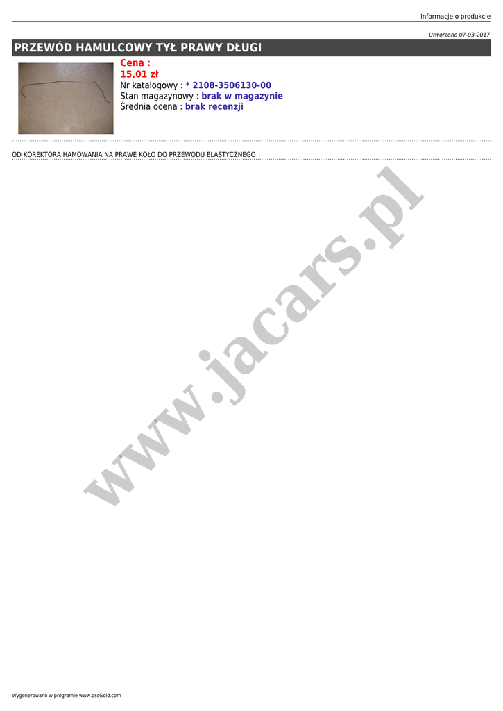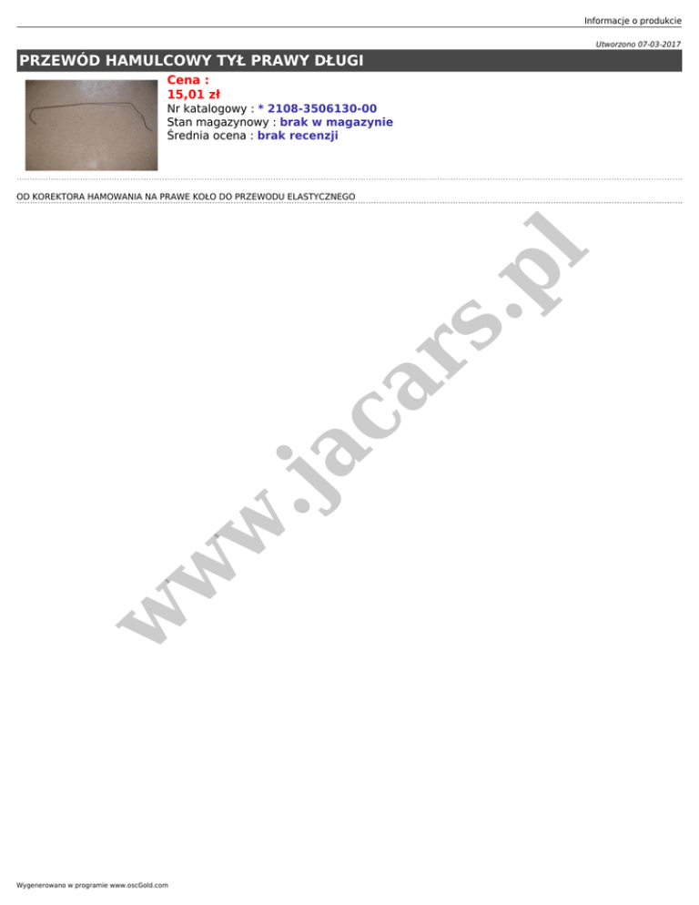 Informacje o produkcie Utworzono 07-03-2017 PRZEWÓD HAMULCOWY TYŁ PRAWY DŁUGI Cena : 15,01 zł Nr katalogowy : * 2108-3506130-00 Stan magazynowy : brak w magazynie Średnia ocena : brak recenzji w w w .ja ca rs .p l OD KOREKTORA HAMOWANIA NA PRAWE KOŁO DO PRZEWODU ELASTYCZNEGO Wygenerowano w programie www.oscGold.com