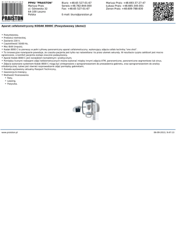 PPHU "PRAISTON" Mariusz Prais ul. Górowska 32 64-100 Leszno Polska Biuro: +48.65 527-01-67 Serwis:+48.782-844-000 Fax: +48.65 527-01-67 Mariusz Prais: +48.693-37-27-47 Łukasz Prais: +48.665-345-001 Zenon Prais: +48.609-788-830 E-mail: [email protected] Aparat cefalometryczny KODAK 8000C (Powystawowy (demo)) • Powystawowy, • Produkcji niemieckiej, • Zasilanie 230 V, • Częstotliwość 50/60 Hz, • Moc 6kW (impuls), • Kodak 8000 C to pierwszy w pełni cyfrowy panoramiczny aparat cefalometryczny, wykonujący zdjęcia cefalo techniką "one shot". • To innowacyjne rozwiązanie powoduje, że czaszka pacjenta jest tylko raz naświetlana i to przez ułamek sekundy. W rezultacie ryzyko zakłóceń jest mocno ograniczone, a komfort pacjenta zostaje znacznie podwyższony, • Aparat Kodak 8000 C jest narzędziem kompletnym i praktycznym, • Pomiędzy licznymi rodzajami zdjęć kefalometrycznych można wykonać między innymi zdjęcia ATM, panoramiczne, panoramiczne segmentowe lub sinus, • Zdjęcia wykonane systemem Kodak 8000 C mogą być zintegrowane z oprogramowaniem do prowadzenia gabinetu, oraz oprogramowaniem do analizy ortodontycznej. Łatwe jest również rozprowadzanie zdjęć pomiędzy gabinetami, • Posiada wystawiony aktualny Paszport Techniczny, • Gwarancja 6-miesięcy, • Możliwość finansowania: ⚬ Raty, ⚬ Leasing, ⚬ Pożyczka. www.praiston.pl 06-09-2013, 9:47:13
