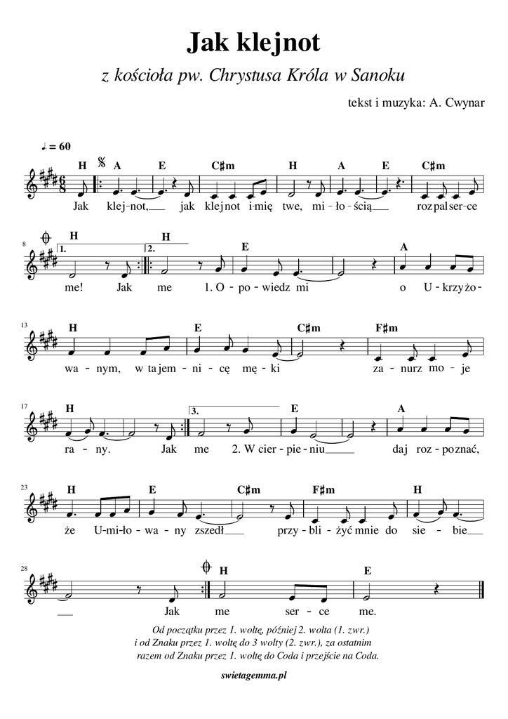 Jak klejnot z kościoła pw. Chrystusa Króla w Sanoku tekst i muzyka: A. Cwynar = 60 A H 6 8 Jak 8 H 1. E klej not, E Jak me 1. O E nym, w ta jem ni H 23 3. ny. Jak H cę A me roz pal ser ce mę wiedz mi C♯m U mi ło wa ny zszedł H Jak me o U krzy żo za nurz mo je ki E A C♯m F♯m 2. W cier pie niu E 28 C♯m daj roz po znać, F♯m H że E A po 17 ra H 13 wa H jak klej not i mię twe, mi ło ścią 2. me! H C♯m przy bli żyć mnie do sie bie E ser ce me. Od początku przez 1. woltę, później 2. wolta (1. zwr.) i od Znaku przez 1. woltę do 3 wolty (2. zwr.), za ostatnim razem od Znaku przez 1. woltę do Coda i przejście na Coda. swietagemma.pl