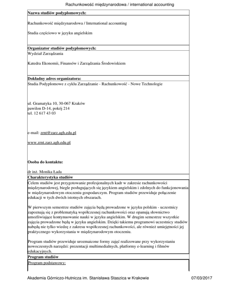 Rachunkowość międzynarodowa / international accounting Nazwa studiów podyplomowych: Rachunkowość międzynarodowa / International accounting Studia częściowo w języku angielskim Organizator studiów podyplomowych: Wydział Zarządzania Katedra Ekonomii, Finansów i Zarządzania Środowiskiem Dokładny adres organizatora: Studia Podyplomowe z cyklu Zarządzanie - Rachunkowość - Nowe Technologie ul. Gramatyka 10, 30-067 Kraków pawilon D-14, pokój 214 tel. 12 617 43 03 e-mail: [email protected] www.zrnt.zarz.agh.edu.pl Osoba do kontaktu: dr inż. Monika Łada Charakterystyka studiów Celem studiów jest przygotowanie profesjonalnych kadr w zakresie rachunkowości międzynarodowej, biegle posługujących się językiem angielskim i zdolnych do funkcjonowania w międzynarodowym otoczeniu gospodarczym. Program studiów przewiduje połączenie edukacji w tych dwóch istotnych obszarach. W pierwszym semestrze studiów zajęcia będą prowadzone w języku polskim - uczestnicy zapoznają się z problematyką współczesnej rachunkowości oraz opanują słownictwo umożliwiające kontynuowanie nauki w języku angielskim. W drugim semestrze wszystkie zajęcia prowadzone będą w języku angielskim. Dzięki takiemu programowi uczestnicy studiów nabędą nie tylko wiedzę z zakresu współczesnej rachunkowości, ale również umiejętności jej praktycznego wykorzystania w międzynarodowym otoczeniu. Program studiów przewiduje urozmaicone formy zajęć realizowane przy wykorzystaniu nowoczesnych narzędzi: prezentacji multimedialnych, platformy e-learning i filmów edukacyjnych. Program studiów Program podstawowy: Akademia Górniczo-Hutnicza im. Stanisława Staszica w Krakowie 07/03/2017 Rachunkowość międzynarodowa / international accounting Zakres tematyczny: Przedmioty w języku polskim (I semestr) • Współczesna rachunkowość finansowa • Współczesna rachunkowość zarządcza • English for Accounting and Finance Przedmioty w języku angielskim (II semestr) • Contemporary Management • International Accounting Standards • Przedmiot obieralny w ramach specjalności • Final Thesis /w języku angielskim lub polskim/ Przedmioty obieralne w ramach specjalności: ♦ Accounting in International Practice ♦ Corporate Governance ♦ International Controlling ♦ Inne specjalności uruchamiane na życzenie uczestników Sylwetka absolwenta Studia skierowane są do szerokiego grona kadry stykającej się w praktyce z problematyką rachunkowości międzynarodowej lub do osób pragnących rozwijać swoją dalszą karierę zawodową w tym kierunku. W szczególności zaproponowana oferta programowa skierowana jest do: • dyrektorów finansowych, controllerów i głównych księgowych • kadry działów finansowych, rachunkowości i controllingu • kadry centrów rozliczeniowych oraz firm audytorskich • kadry kierowniczej wszystkich szczebli zatrudnionej w firmach międzynarodowych • osób planujących kontynuację swojej kariery w obszarze rachunkowości i finansów za granicą • absolwentów studiów wyższych pragnących uzyskać wiedzę i umiejętności niezbędne do pracy w firmach zagranicznych, w tym również w międzynarodowych centrach rozliczeniowych. Po zakończeniu studiów słuchacze będą dysponować wiedzą teoretyczną dotyczącą współczesnego zakresu rachunkowości międzynarodowej, jak również umiejętnościami z zakresu rachunkowości oraz znajomością języka angielskiego w stopniu wymaganym do swobodnego funkcjonowania w praktyce organizacji międzynarodowych. Absolwenci otrzymują świadectwo ukończenia studiów podyplomowych w zakresie rachunkowości międzynarodowej na podstawie zaliczeń przedmiotów oraz obrony pracy podyplomowej. Świadectwo ukończenia studiów uprawnia do ubiegania się o zezwolenie Ministerstwa Finansów na usługowe prowadzenie ksiąg rachunkowych bez egzaminu Akademia Górniczo-Hutnicza im. Stanisława Staszica w Krakowie 07/03/2017 Rachunkowość międzynarodowa / international accounting (Certyfikat Księgowego). Kierownik: dr inż. Monika Łada Czas trwania: 2 semestry Od IX 2012 r. do VI 2013 r. Opłaty: 6.000 zł, w tym opłata operacyjna 100 zł płatna przy zapisie Zasady naboru: Termin zgłoszeń: od IV do IX 2012 r. Wymagane dokumenty: • zgłoszenie na studia • potwierdzenie wniesienia opłaty operacyjnej • odpis dyplomu ukończenia studiów wyższych (licencjackich, inżynierskich lub magisterskich) Tryb zgłoszeń: kolejność zgłoszeń Liczba miejsc: 90 Miejsce zgłoszeń: Zgłoszenia przez Internet: http://www.zrnt.zarz.agh.edu.pl/rekrutacja.html Osoba przyjmująca zgłoszenia: Anna Pietrzyk tel. 12 617 42 36 Informacje dodatkowe: Zajęcia odbywają się w weekendy w trybie dwudniowych zjazdów (sobota i niedziela) rozłożonych średnio raz w miesiącu w okresie od września do czerwca. Studia realizowana są przy współudziale partnerów zewnętrznych, w tym zagranicznych wykładowców ze School of Accounting and Finance, University of Dundee oraz School of Business and Management, Queen Mary University of London. Akademia Górniczo-Hutnicza im. Stanisława Staszica w Krakowie 07/03/2017