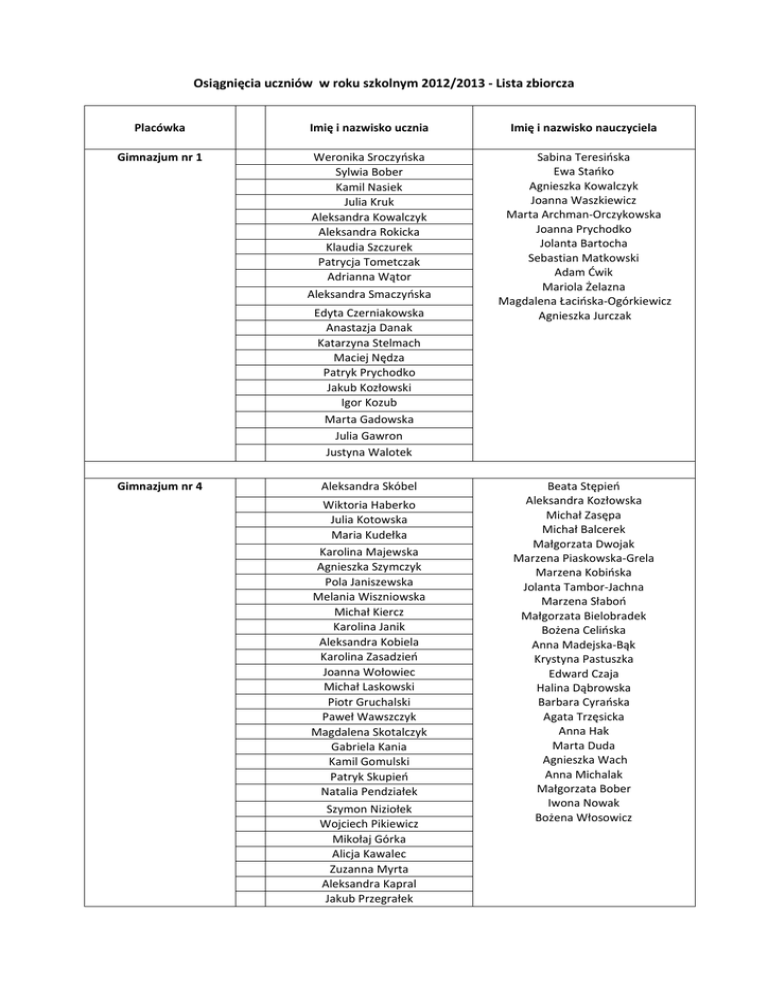Osiągnięcia uczniów w roku szkolnym 2012/2013 - Lista zbiorcza Placówka Imię i nazwisko ucznia Imię i nazwisko nauczyciela Gimnazjum nr 1 Weronika Sroczyńska Sylwia Bober Kamil Nasiek Julia Kruk Aleksandra Kowalczyk Aleksandra Rokicka Klaudia Szczurek Patrycja Tometczak Adrianna Wątor Aleksandra Smaczyńska Sabina Teresińska Ewa Stańko Agnieszka Kowalczyk Joanna Waszkiewicz Marta Archman-Orczykowska Joanna Prychodko Jolanta Bartocha Sebastian Matkowski Adam Ćwik Mariola Żelazna Magdalena Łacińska-Ogórkiewicz Agnieszka Jurczak Edyta Czerniakowska Anastazja Danak Katarzyna Stelmach Maciej Nędza Patryk Prychodko Jakub Kozłowski Igor Kozub Marta Gadowska Julia Gawron Justyna Walotek Gimnazjum nr 4 Aleksandra Skóbel Wiktoria Haberko Julia Kotowska Maria Kudełka Karolina Majewska Agnieszka Szymczyk Pola Janiszewska Melania Wiszniowska Michał Kiercz Karolina Janik Aleksandra Kobiela Karolina Zasadzień Joanna Wołowiec Michał Laskowski Piotr Gruchalski Paweł Wawszczyk Magdalena Skotalczyk Gabriela Kania Kamil Gomulski Patryk Skupień Natalia Pendziałek Szymon Niziołek Wojciech Pikiewicz Mikołaj Górka Alicja Kawalec Zuzanna Myrta Aleksandra Kapral Jakub Przegrałek Beata Stępień Aleksandra Kozłowska Michał Zasępa Michał Balcerek Małgorzata Dwojak Marzena Piaskowska-Grela Marzena Kobińska Jolanta Tambor-Jachna Marzena Słaboń Małgorzata Bielobradek Bożena Celińska Anna Madejska-Bąk Krystyna Pastuszka Edward Czaja Halina Dąbrowska Barbara Cyrańska Agata Trzęsicka Anna Hak Marta Duda Agnieszka Wach Anna Michalak Małgorzata Bober Iwona Nowak Bożena Włosowicz Maciej Baran Przemysław Rogala Zuzanna Stojczyk Paulina Bzowy Łukasz Wybrańczyk Mateusz Moruś Jan Kwaśniewski Patryk Bąk Mateusz Głowa Amanda Krawiec Wiktoria Strona Iga Soczawa Katarzyna Łosiowska Aleksandra Majcher Iga Włodarczyk Natalia Wójcik Marcelina Kowalik Katarzyna Zieger Dominika Smoleń Anna Zygmunt Gimnazjum nr 9 Wiktoria Adamek Aleksandra Konieczna Kamil Bartkiewicz Norbert Lech Karolina Prusakowska Robert Korczyński Marta Prusakowska Zespół Szkół nr 1 Szkoła Podstawowa nr 16 Gimnazjum nr 13 Małgorzata Nakonieczny (kl. IV) Iga Odorkiewicz (Kl. VI) Nikodem Mucha (Kl. IV) Kinga Skibińska (Kl. IV) Piotr Staroń Aleksander Kijas Bartłomiej Szombara Beata Studzińska Izabela Bednarska Anna Tylec Monika Klimczak Łukasz Gajda Beata Dzierzęcka-Zwoźniak Anna Łągiewka Teresa Walotek Zespół Szkół nr 2 Szkoła Podstawowa nr 13 Gimnazjum nr 5 Mateusz Stańko (kl. I-III) Maksymilian Brosch (kl. I-III) Łukasz Pędzik kl. VI Dawid Snochowski kl. V Julia Jakima Ewa Marciniak Karol Białas Patryk Chodur Michał Lewicki Bartosz Czech Kamil Majka Magdalena Strzelec Iwona Augustynik Violetta Rusek Barbara Grosicka Anna Bogdańska Patrycja Bugajska Ewa Pajurek Dorota Sekita Janusz Horbowy Tomasz Jagodziński Norbert Podoręcki Dariusz Włosowicz Weronika Skrzekowska Grzegorz Przewieźlik Zespół Szkół nr 3 Szkoła Podstawowa nr 29 Gimnazjum nr 7 Paulina Pączkowska Magdalena Nowicka Maciej Mazur Agnieszka Kryza Edyta Brańka-Paw Zespół Szkół nr 4 Szkoła Podstawowa nr 34 Gimnazjum nr 8 Natalia Smok Weronika Mirus Roksana Tarczyńska Wiktoria Olesen Piotr Pikiewicz Paulina Dołubizno Adrianna Ściślicka Kinga Bielec Joanna Sordyl Anna Adamiak Violetta Klamra Patrycja Kopcińska Jarosław Ziętek Justyna Kańtoch-Wilk Grażyna Mackiewicz Edyta Pasamonik Małgorzata Błaszczyk Zespół Szkół nr 7 Szkoła Podstawowa nr 30 Gimnazjum nr 3 Borys Skowron Marcel Czop Miłosz Nowak Marianna Wiśnicka Agnieszka Stawiarz Jakub Mańczykowski Julia Drab Natalia Pająk Aleksandra Wesołowska Ewelina Kuc Ewa Lisowska Iwona Brodziak Małgorzata Mol Iwona Zientarska Alicja Lisek Edyta Paździorek Anna Szuda-Bączek Jolanta Kubik Izabela Skraba-Szymska Agnieszka Żmuda Beata Cichorska Szymon Nabrdalik Ewa Chojowska Zespół Szkół Muzycznych Jakub Piekutowski Szymon Pelc Bartosz Maciążek Piotr Wacowski Filip Lenart Oliwia Kłyż Aleksandra Gołuszka Aleksandra Miśkiewcz Tristan Trzewiczek Joanna Kućmierz Róża Prusik Mikołaj Zajdek (kl. I-III) Kacper Bednarczyk (kl. I-III) Piotr Marciniak Jerzy Ślęzak Dariusz Jędrusik Agnieszka Pierzchała Monika Walasik Ilona Trzęsimiech Aleksandra Naczyńska-Szlęk Jan Kućmierczyk Agnieszka Wyrodek Małgorzata Siemoniak Zespół Szkół Plastycznych Martyna Piątek Agnieszka Tomsia Katarzyna Halejak - absolwentka Aleksandra Szlęk Sylwia Pałuchowska Edyta Kubik Łukasz Kawka Agnieszka Budny Agnieszka Gorgoń Dominika Urbańczyk - absolwentka Oliwia Dudek Aleksandra Kopacka Małgorzata Sobczyk - absolwentka Marta Oleksiak Konrad Motłoch Katarzyna Piątkowska - absolwentka Patrycja Wcisło Marcin Ambrozik Maja Kawaliło Maria Pawłowicz Agata Lędźwa Kamil Kwiatkowski - absolwent Marcelina Sokół - absolwentka Jagoda Cerkiewnik Agnieszka Gawęda Monika Winiarczyk Magdalena Kieszniewska Kamil Łata Ewelina Paskuta Anna Musioł Emil Lewicki Karolina Szopa Aleksandra Szydłowska Grzegorz Skrzypek Beata Skrzypek Damian Pacha Mariusz Wnukowski Anna Wolniaczyk Beata Będkowska Wojciech Jurkiewicz Robert Kańtoch Magdalena Łucka-Stojek Rafał Pelczar Agnieszka Mika-Koszek Monika Słaboń Ewa Balcer Monika Muszkat-Zielińska Ewelina Piasecka-Woźniczka Maria Moryc Przedstawiciel grupy, która otrzymała nagrodę za pracę zbiorową w Ogólnopolskim Konkursie Plastycznym „Wariacje na temat twórczości Tadeusza Kantora” Katarzyna Czerwińska Daria Remjasz Karolina Nawara Paweł Sojka Patrycja Obarewicz Elżbieta Marzec I Liceum Ogólnokształcące Katarzyna Jankowiak Marceli Hankiewicz Dominika Jędryczka Sandra Zgrzebniok Kamil Sadowski Krzysztof Lesiak Maciej Wroński Patrycja Gorzelańczyk Jakub Wójcik Marcin Kaczor Karol Bargieł Mariusz Drynda Marcin Sysło Agnieszka Tuleta Joanna Kańska Ewa Lis Joanna Dobczyńska-Wójcik Zuzanna Kobryń Aleksandra Dul Mariusz Paszkowski Iwona Hajducka Ewa Wierzcholska Monika Muszkat-Zielińska Jadwiga Bo