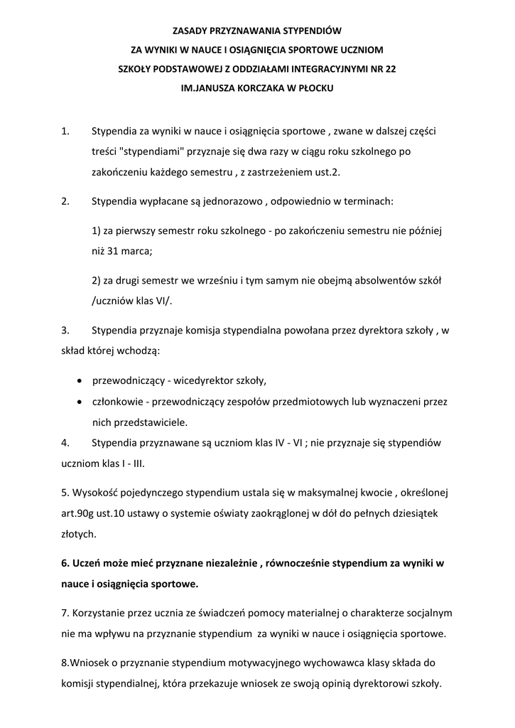 ZASADY PRZYZNAWANIA STYPENDIÓW ZA WYNIKI W NAUCE I OSIĄGNIĘCIA SPORTOWE UCZNIOM SZKOŁY PODSTAWOWEJ Z ODDZIAŁAMI INTEGRACYJNYMI NR 22 IM.JANUSZA KORCZAKA W PŁOCKU 1. Stypendia za wyniki w nauce i osiągnięcia sportowe , zwane w dalszej części treści "stypendiami" przyznaje się dwa razy w ciągu roku szkolnego po zakończeniu każdego semestru , z zastrzeżeniem ust.2. 2. Stypendia wypłacane są jednorazowo , odpowiednio w terminach: 1) za pierwszy semestr roku szkolnego - po zakończeniu semestru nie później niż 31 marca; 2) za drugi semestr we wrześniu i tym samym nie obejmą absolwentów szkół /uczniów klas VI/. 3. Stypendia przyznaje komisja stypendialna powołana przez dyrektora szkoły , w skład której wchodzą: przewodniczący - wicedyrektor szkoły, członkowie - przewodniczący zespołów przedmiotowych lub wyznaczeni przez nich przedstawiciele. 4. Stypendia przyznawane są uczniom klas IV - VI ; nie przyznaje się stypendiów uczniom klas I - III. 5. Wysokość pojedynczego stypendium ustala się w maksymalnej kwocie , określonej art.90g ust.10 ustawy o systemie oświaty zaokrąglonej w dół do pełnych dziesiątek złotych. 6. Uczeń może mieć przyznane niezależnie , równocześnie stypendium za wyniki w nauce i osiągnięcia sportowe. 7. Korzystanie przez ucznia ze świadczeń pomocy materialnej o charakterze socjalnym nie ma wpływu na przyznanie stypendium za wyniki w nauce i osiągnięcia sportowe. 8.Wniosek o przyznanie stypendium motywacyjnego wychowawca klasy składa do komisji stypendialnej, która przekazuje wniosek ze swoją opinią dyrektorowi szkoły. 8. 9.Przy podziale stypendium należy kierować się następującymi zasadami: 1) stypendia za osiągnięcia sportowe mogą otrzymać uczniowie posiadający najwyższe w szkole osiągnięcia sportowe na szczeblu co najmniej międzyszkolnym oraz zachowanie co najmniej dobre w semestrze poprzedzającym okres , w którym przyznaje się to stypendium . 2) w przypadku zbyt dużej ilości kandydatów do stypendium posiadających osiągnięcia sportowe na tym samym poziomie decyzję o przyznaniu stypendium podejmuje komisja stypendialna w oparciu o opinię wychowawcy i trenera. Pisemna opinia powinna uwzględniać m.in. ocenę zachowania ucznia / sumę zdobytych punktów/ , jego zaangażowanie w życie klasy i szkoły , aktywność społeczną , pełnione funkcje społeczne. 3) liczba stypendiów za osiągnięcia sportowe nie może przekroczyć 20% całkowitej liczby przyznawanych stypendiów w szkole. 4) pozostałą liczbę stypendiów przeznacza się na stypendia za najlepsze wyniki w nauce , dzieląc ją między poszczególne poziomy nauczania proporcjonalnie do liczby uczniów w zaokrągleniu do jedności. 5) stypendia za wyniki w nauce mogą otrzymać uczniowie posiadający średnią ocen co najmniej 4,75 i zachowanie co najmniej dobre w semestrze poprzedzającym okres , w którym przyznaje się to stypendium . W pierwszej kolejności przyznaje się stypendia uczniom z zachowaniem wzorowym i najwyższą średnią ocen począwszy od 6,0. 6) okolicznością wykluczającą przyznanie stypendium za wyniki w nauce i osiągnięcia sportowe jest minimalna średnia ocen za semestr poniżej 3,0 oraz zachowanie poniżej dobrego. 7) przyznanie stypendiów w poszczególnych poziomach nauczania następuje w kolejności od najwyższej średniej ocen. Minimalną średnią ocen, w danym semestrze, która uprawnia do uzyskania stypendium, ustala komisja stypendialna po zasięgnięciu opinii rady pedagogicznej i samorządu uczniowskiego. 2 8) jeśli na liście ustalonej w sposób opisany w punktach 5 - 7 znajdzie się większa ilość uczniów o tej samej średniej ocen niż przeznaczona dla tego poziomu nauczania ilość stypendiów , decyzja o przyznaniu stypendium poszczególnym uczniom zostaje podjęta w oparciu o opinię wychowawcy. Pisemna opinia powinna uwzględniać m.in. ocenę zachowania ucznia / sumę zdobytych punktów/ , jego zaangażowanie w życie klasy i szkoły , aktywność społeczną , pełnione funkcje społeczne , szczególne osiągnięcia w nauce na szczeblu międzyszkolnym lub ogólnopolskim. 9) jeśli w danym poziomie nauczania znajduje się mniejsza ilość uczniów ze średnią ocen co najmniej 4,75 i zachowaniem co najmniej dobrym, stypendia należy przyznać tylko uczniom spełniającym te warunki , a pozostałą liczbę stypendiów rozdzielić między pozostałych uczniów szkoły nie objętych listą określoną w punktach 5 -7 , posiadających co najmniej dobrą ocenę z zachowania oraz osiągających najwyższą średnią ocen w szkole w kolejności od najwyższej do najniższej bez względu na przynależność do poziomu nauczania oraz bez względu na to czy uczniowie osiągnęli średnią ocen 4,75. W przypadku zbyt dużej ilości uczniów o tej samej średniej decyzję o przyznaniu stypendium podejmuje komisja stypendialna w oparciu o pisemne opinie wychowawców klas. 10. Stypendium za wyniki w nauce lub za osiągnięcia sportowe przyznaje dyrektor szkoły, po zasięgnięciu opinii rady pedagogicznej, w ramach środków przyznanych przez organ prowadzący na ten cel w budżecie szkoły. 11. Wysokość stypendium ustala dyrektor szkoły , po zasięgnięciu opinii komisji stypendialnej i rady pedagogicznej oraz w porozumieniu z organem prowadzącym szkołę. 3