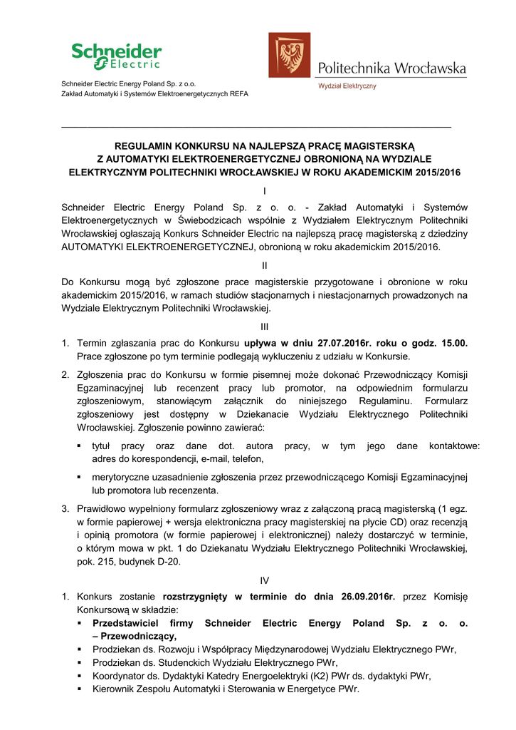 Schneider Electric Energy Poland Sp. z o.o. Zakład Automatyki i Systemów Elektroenergetycznych REFA __________________________________________________________________________________________ REGULAMIN KONKURSU NA NAJLEPSZĄ PRACĘ MAGISTERSKĄ Z AUTOMATYKI ELEKTROENERGETYCZNEJ OBRONIONĄ NA WYDZIALE ELEKTRYCZNYM POLITECHNIKI WROCŁAWSKIEJ W ROKU AKADEMICKIM 2015/2016 I Schneider Electric Energy Poland Sp. z o. o. - Zakład Automatyki i Systemów Elektroenergetycznych w Świebodzicach wspólnie z Wydziałem Elektrycznym Politechniki Wrocławskiej ogłaszają Konkurs Schneider Electric na najlepszą pracę magisterską z dziedziny AUTOMATYKI ELEKTROENERGETYCZNEJ, obronioną w roku akademickim 2015/2016. II Do Konkursu mogą być zgłoszone prace magisterskie przygotowane i obronione w roku akademickim 2015/2016, w ramach studiów stacjonarnych i niestacjonarnych prowadzonych na Wydziale Elektrycznym Politechniki Wrocławskiej. III 1. Termin zgłaszania prac do Konkursu upływa w dniu 27.07.2016r. roku o godz. 15.00. Prace zgłoszone po tym terminie podlegają wykluczeniu z udziału w Konkursie. 2. Zgłoszenia prac do Konkursu w formie pisemnej może dokonać Przewodniczący Komisji Egzaminacyjnej lub recenzent pracy lub promotor, na odpowiednim formularzu zgłoszeniowym, stanowiącym załącznik do niniejszego Regulaminu. Formularz zgłoszeniowy jest dostępny w Dziekanacie Wydziału Elektrycznego Politechniki Wrocławskiej. Zgłoszenie powinno zawierać: tytuł pracy oraz dane dot. autora adres do korespondencji, e-mail, telefon, pracy, w tym jego dane kontaktowe: merytoryczne uzasadnienie zgłoszenia przez przewodniczącego Komisji Egzaminacyjnej lub promotora lub recenzenta. 3. Prawidłowo wypełniony formularz zgłoszeniowy wraz z załączoną pracą magisterską (1 egz. w formie papierowej + wersja elektroniczna pracy magisterskiej na płycie CD) oraz recenzją i opinią promotora (w formie papierowej i elektronicznej) należy dostarczyć w terminie, o którym mowa w pkt. 1 do Dziekanatu Wydziału Elektrycznego Politechniki Wrocławskiej, pok. 215, budynek D-20. IV 1. Konkurs zostanie rozstrzygnięty w terminie do dnia 26.09.2016r. przez Komisję Konkursową w składzie: Przedstawiciel firmy Schneider Electric Energy Poland Sp. z o. o. – Przewodniczący, Prodziekan ds. Rozwoju i Współpracy Międzynarodowej Wydziału Elektrycznego PWr, Prodziekan ds. Studenckich Wydziału Elektrycznego PWr, Koordynator ds. Dydaktyki Katedry Energoelektryki (K2) PWr ds. dydaktyki PWr, Kierownik Zespołu Automatyki i Sterowania w Energetyce PWr. Schneider Electric Energy Poland Sp. z o.o. Zakład Automatyki i Systemów Elektroenergetycznych REFA V 1. Informacje o rozstrzygnięciu Konkursu zostaną podane do wiadomości publicznej w formie ogłoszenia na tablicy informacyjnej Uczelni oraz na stronach internetowych Wydziału oraz Zakładu. 2. Nagroda pieniężna za najlepszą magisterską pracę dyplomową wynosi 4000- zł. brutto (cztery tysiące złotych) dla autora (lub zespołu autorów). Kwota zostanie wpłacona przez Wydział na konto zwycięzcy. Od nagrody pieniężnej zostanie pobrany zryczałtowany podatek dochodowy zgodnie z Art. 30 ust.1 pkt.2 Ustawy o podatku dochodowym od osób fizycznych. Zwycięzca będzie zobowiązany do wskazania swoich danych związanych z płatnością podatku, w tym PESEL oraz właściwy urząd skarbowy. W przypadku gdy Komisja Konkursowa wyłoni dwóch zwycięzców Konkursu za dwie równorzędnej wartości prace magisterskie, decyzją Komisji Konkursowej nagroda pieniężna może zostać podzielona. 3. Symboliczne wręczenie nagrody zwycięzcy konkursu nastąpi podczas uroczystości Inauguracji nowego roku akademickiego na Wydziale Elektrycznym. Wydział Zakład Świebodzice – Wrocław, …………………….r. Schneider Electric Energy Poland Sp. z o.o. Zakład Automatyki i Systemów Elektroenergetycznych REFA Wrocław,……………………………….. ZGŁOSZENIE PRACY do Konkursu SCHNEIDER ELECTRIC na najlepszą pracę magisterską z automatyki elektroenergetycznej obronioną Wydziale Elektrycznym Politechniki Wrocławskiej w roku akademickim 2015/2016 ………………………………………………………..………………………………………………………………………………………………………… Imię i nazwisko zgłaszającego pracę do konkursu □ Przewodniczący Komisji Egzaminu Dyplomowego □ Promotor □ Recenzent ………………………………………………………..………………………………………………………………………………………………………… Imię i nazwisko kandydata Nr albumu ………………………………………………………..………………………………………………………………………………………………………… Telefon komórkowy kandydata e-mail: e-mail prywatny: ………………………………………………………..………………………………………………………………………………………………………… Adres do korespondencji nr telefonu: ………………………………………………………..………………………………………………………………………………………………………… Kierunek Tryb studiów (stacjonarne, niestacjonarne) ………………………………………………………..………………………………………………………………………………………………………… Promotor Recenzent ………………………………………………………..………………………………………………………………………………………………………… ………………………………………………………..………………………………………………………………………………………………………… Tytuł pracy …