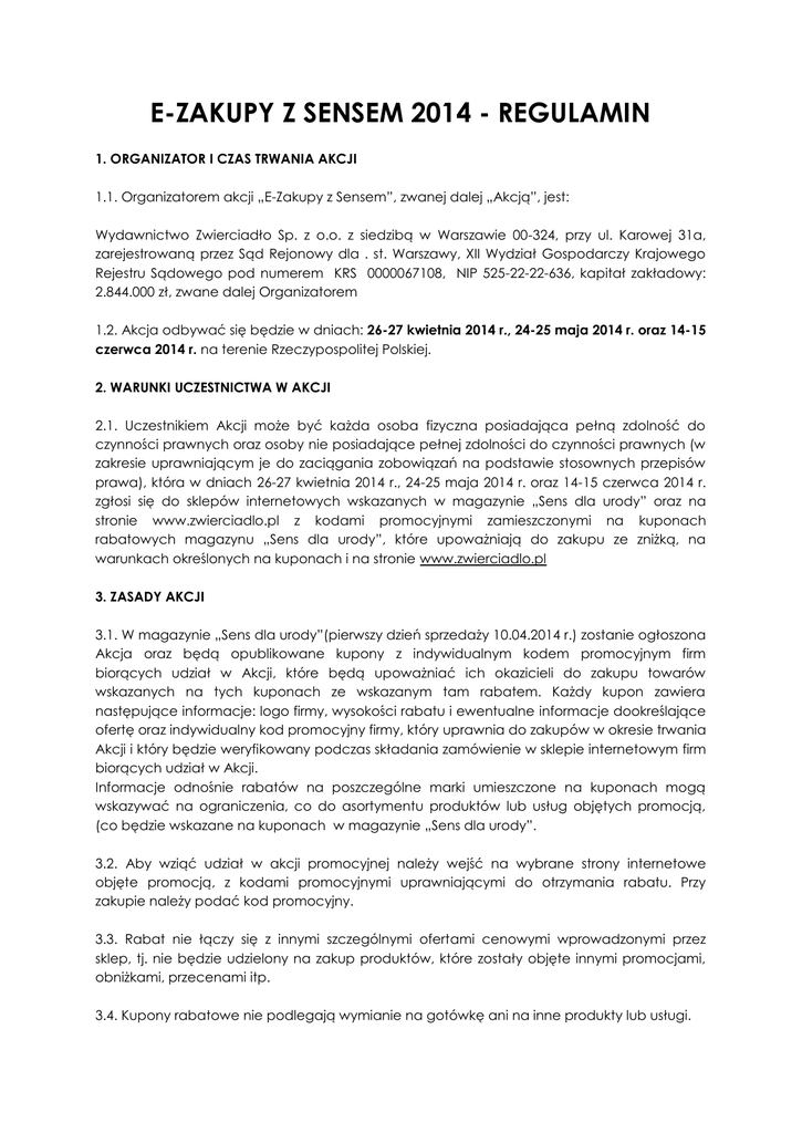 E-ZAKUPY Z SENSEM 2014 - REGULAMIN 1. ORGANIZATOR I CZAS TRWANIA AKCJI 1.1. Organizatorem akcji „E-Zakupy z Sensem”, zwanej dalej „Akcją”, jest: Wydawnictwo Zwierciadło Sp. z o.o. z siedzibą w Warszawie 00-324, przy ul. Karowej 31a, zarejestrowaną przez Sąd Rejonowy dla . st. Warszawy, XII Wydział Gospodarczy Krajowego Rejestru Sądowego pod numerem KRS 0000067108, NIP 525-22-22-636, kapitał zakładowy: 2.844.000 zł, zwane dalej Organizatorem 1.2. Akcja odbywać się będzie w dniach: 26-27 kwietnia 2014 r., 24-25 maja 2014 r. oraz 14-15 czerwca 2014 r. na terenie Rzeczypospolitej Polskiej. 2. WARUNKI UCZESTNICTWA W AKCJI 2.1. Uczestnikiem Akcji może być każda osoba fizyczna posiadająca pełną zdolność do czynności prawnych oraz osoby nie posiadające pełnej zdolności do czynności prawnych (w zakresie uprawniającym je do zaciągania zobowiązań na podstawie stosownych przepisów prawa), która w dniach 26-27 kwietnia 2014 r., 24-25 maja 2014 r. oraz 14-15 czerwca 2014 r. zgłosi się do sklepów internetowych wskazanych w magazynie „Sens dla urody” oraz na stronie www.zwierciadlo.pl z kodami promocyjnymi zamieszczonymi na kuponach rabatowych magazynu „Sens dla urody”, które upoważniają do zakupu ze zniżką, na warunkach określonych na kuponach i na stronie www.zwierciadlo.pl 3. ZASADY AKCJI 3.1. W magazynie „Sens dla urody”(pierwszy dzień sprzedaży 10.04.2014 r.) zostanie ogłoszona Akcja oraz będą opublikowane kupony z indywidualnym kodem promocyjnym firm biorących udział w Akcji, które będą upoważniać ich okazicieli do zakupu towarów wskazanych na tych kuponach ze wskazanym tam rabatem. Każdy kupon zawiera następujące informacje: logo firmy, wysokości rabatu i ewentualne informacje dookreślające ofertę oraz indywidualny kod promocyjny firmy, który uprawnia do zakupów w okresie trwania Akcji i który będzie weryfikowany podczas składania zamówienie w sklepie internetowym firm biorących udział w Akcji. Informacje odnośnie rabatów na poszczególne marki umieszczone na kuponach mogą wskazywać na ograniczenia, co do asortymentu produktów lub usług objętych promocją, (co będzie wskazane na kuponach w magazynie „Sens dla urody”. 3.2. Aby wziąć udział w akcji promocyjnej należy wejść na wybrane strony internetowe objęte promocją, z kodami promocyjnymi uprawniającymi do otrzymania rabatu. Przy zakupie należy podać kod promocyjny. 3.3. Rabat nie łączy się z innymi szczególnymi ofertami cenowymi wprowadzonymi przez sklep, tj. nie będzie udzielony na zakup produktów, które zostały objęte innymi promocjami, obniżkami, przecenami itp. 3.4. Kupony rabatowe nie podlegają wymianie na gotówkę ani na inne produkty lub usługi. 3.5. Pracownik sklepu biorącego udział w Akcji uprawniony jest do odmówienia przyjęcia kodu i jego realizacji, jeżeli przedłożony kod budzi jego wątpliwości co do autentyczności i/lub legalności pochodzenia. 4. POSTANOWIENIA KOŃCOWE 4.1. Reklamacje dotyczące przebiegu Akcji powinny być zgłaszane pocztą elektroniczną na adres: [email protected] z tytułem maila „kupony Sens dla urody” lub listownie na adres Organizatora. Reklamacja powinna zawierać co najmniej adres (listowny lub elektroniczny) lub telefon kontaktowy oraz opis zgłaszanych zastrzeżeń. Jeżeli podane w reklamacji dane lub informacje wymagają uzupełnienia, przed rozpatrzeniem reklamacji Organizator zwraca się do składającego reklamację o jej uzupełnienie we wskazanym zakresie. Prawidłowe reklamacje będą rozpatrywane przez Organizatora w terminie 14 dni od otrzymania reklamacji i wysłane w takiej samej formie jak nadana przez zgłaszającego reklamację na jego adres wskazany w reklamacji. 4.2. Decyzja Organizatora co do zgłoszonej reklamacji jest ostateczna, co nie wyłącza prawa Użytkownika do dochodzenia nieuwzględnionych roszczeń na drodze postępowania sądowego. 4.3. Regulamin niniejszej Akcji jest dostępny w siedzibie Organizatora i na stronie www.zwierciadlo.pl 4.4. W sprawach nie uregulowanych niniejszym Regulaminem zastosowanie mają przepisy Kodeksu Cywilnego.