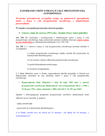 ZAWIERANIE UMÓW O PRACĘ W CELU PRZYGOTOWANIA ZAWODOWEGO Zwracamy pracodawcom szczególną uwagę na poprawność sporządzania umów o pracę w celu przygotowania zawodowego z młodocianymi pracownikami. W związku z tym poniżej przytaczamy stosowne przepisy: • Ustawa z dnia 26 czerwca 1974 roku - Kodeks Pracy (tekst jednolity) Art. 194. Do zawierania i rozwiązywania z młodocianymi umów o pracę w celu przygotowania zawodowego mają zastosowanie przepisy kodeksu dotyczące umów o pracę na czas nieokreślony ze zmianami przewidzianymi w art. 195 i 196. Art. 195. § 1. Umowa o pracę w celu przygotowania zawodowego powinna określać w szczególności: 1) rodzaj przygotowania zawodowego (nauka zawodu lub przyuczenie do wykonywania określonej pracy), 2) czas trwania i miejsce odbywania przygotowania zawodowego, 3) sposób dokształcania teoretycznego, 4) wysokość wynagrodzenia. § 2. Rada Ministrów może w drodze rozporządzenia określić przypadki, w których jest dopuszczalne zawieranie na czas określony umów o pracę w celu przygotowania zawodowego. • Rozporządzenie Rady Ministrów z dnia 28 maja 1996 roku w sprawie przygotowania zawodowego młodocianych i ich wynagradzania (Dz.U. z 1996 r. Nr 60, poz. 278), z późn. zmianami w 2002 roku (Dz.U. Nr 197, poz.1663) Zgodnie z obowiązującymi przepisami przygotowanie zawodowe młodocianych może odbywać się na 2 sposoby, tj. poprzez: - naukę zawodu bądź - przyuczenie do wykonywania określonej pracy § 6.1.Nauka zawodu trwa nie krócej niż 24 miesiące i nie dłużej niż 36 miesięcy, z zastrzeżeniem §12 § 12. 1. Jeżeli młodociany dokształcający się w zasadniczej szkole zawodowej nie otrzymał promocji do klasy programowo wyższej lub nie ukończył szkoły, pracodawca, na wniosek młodocianego, albo izba rzemieślnicza, na wniosek pracodawcy będącego rzemieślnikiem i młodocianego, może przedłużyć czas trwania nauki zawodu, nie więcej jednak niż o 12 miesięcy, w celu umożliwienia dokończenia nauki w szkole, a w innych uzasadnionych przypadkach nie więcej niż o 6 miesięcy. 2. Pracodawca, na wniosek młodocianego, a jeżeli pracodawcą jest rzemieślnik - izba rzemieślnicza, na wniosek pracodawcy będącego rzemieślnikiem i młodocianego, może wyrazić zgodę na skrócenie czasu trwania nauki zawodu, nie więcej jednak niż o 12 miesięcy, jeżeli młodociany nie dokształca się w zasadniczej szkole zawodowej. § 14. 1. W razie przerwania nauki zawodu i podjęcia jej w tym samym lub pokrewnym zawodzie u innego pracodawcy, czas odbytej poprzednio nauki zawodu wlicza się młodocianemu do okresu wymaganego do obycia przygotowania zawodowego, po sprawdzeniu stopnia opanowania zawodu, jeżeli przerwa w nauce zawodu nie trwała dłużej niż 12 miesięcy. § 15. 1. Przyuczenie młodocianego do wykonywania określonej pracy może trwać od 3 do 6 miesięcy. 2. W odniesieniu do młodocianych uczestników Ochotniczych Hufców Pracy okres ustalony w ust. 1 może być przedłużony do czasu ukończenia gimnazjum i trwać łącznie nie dłużej niż 22 miesiące. • Rozporządzenie Rady Ministrów z dnia 21 marca 2005 r. zmieniające rozporządzenie w sprawie przygotowania zawodowego młodocianych i ich wynagradzania (Dz. U. nr 53, poz.472) z 2005 r. § 3a otrzymuje brzmienie: „O zawarciu umowy z pracownikiem młodocianym, o której mowa w § 3 pracodawca zawiadamia wójta (burmistrza, prezydenta miasta) właściwego ze względu na miejsce zamieszkania młodocianego, a w przypadku pracodawcy będącego rzemieślnikiem – również izbę rzemieślniczą właściwą ze względu na siedzibę rzemieślnika.”