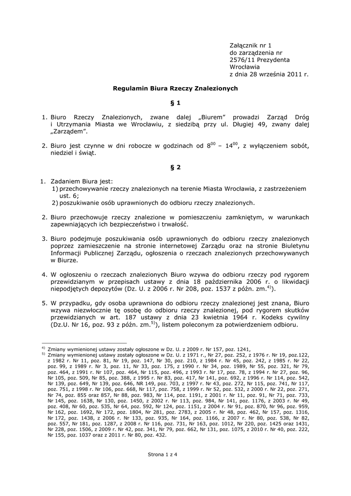 Załącznik nr 1 do zarządzenia nr 2576/11 Prezydenta Wrocławia z dnia 28 września 2011 r. Regulamin Biura Rzeczy Znalezionych §1 1. Biuro Rzeczy Znalezionych, zwane dalej „Biurem” prowadzi Zarząd Dróg i Utrzymania Miasta we Wrocławiu, z siedzibą przy ul. Długiej 49, zwany dalej „Zarządem”. 2. Biuro jest czynne w dni robocze w godzinach od 800 – 1400, z wyłączeniem sobót, niedziel i świąt. §2 1. Zadaniem Biura jest: 1) przechowywanie rzeczy znalezionych na terenie Miasta Wrocławia, z zastrzeŜeniem ust. 6; 2) poszukiwanie osób uprawnionych do odbioru rzeczy znalezionych. 2. Biuro przechowuje rzeczy znalezione w pomieszczeniu zamkniętym, w warunkach zapewniających ich bezpieczeństwo i trwałość. 3. Biuro podejmuje poszukiwania osób uprawnionych do odbioru rzeczy znalezionych poprzez zamieszczenie na stronie internetowej Zarządu oraz na stronie Biuletynu Informacji Publicznej Zarządu, ogłoszenia o rzeczach znalezionych przechowywanych w Biurze. 4. W ogłoszeniu o rzeczach znalezionych Biuro wzywa do odbioru rzeczy pod rygorem przewidzianym w przepisach ustawy z dnia 18 października 2006 r. o likwidacji niepodjętych depozytów (Dz. U. z 2006 r. Nr 208, poz. 1537 z późn. zm.4)). 5. W przypadku, gdy osoba uprawniona do odbioru rzeczy znalezionej jest znana, Biuro wzywa niezwłocznie tę osobę do odbioru rzeczy znalezionej, pod rygorem skutków przewidzianych w art. 187 ustawy z dnia 23 kwietnia 1964 r. Kodeks cywilny (Dz.U. Nr 16, poz. 93 z późn. zm.5)), listem poleconym za potwierdzeniem odbioru. 4) 5) Zmiany wymienionej ustawy zostały ogłoszone w Dz. U. z 2009 r. Nr 157, poz. 1241, Zmiany wymienionej ustawy zostały ogłoszone w Dz. U. z 1971 r., Nr 27, poz. 252, z 1976 r. Nr 19, poz.122, z 1982 r. Nr 11, poz. 81, Nr 19, poz. 147, Nr 30, poz. 210, z 1984 r. Nr 45, poz. 242, z 1985 r. Nr 22, poz. 99, z 1989 r. Nr 3, poz. 11, Nr 33, poz. 175, z 1990 r. Nr 34, poz. 1989, Nr 55, poz. 321, Nr 79, poz. 464, z 1991 r. Nr 107, poz. 464, Nr 115, poz. 496, z 1993 r. Nr 17, poz. 78, z 1994 r. Nr 27, poz. 96, Nr 105, poz. 509, Nr 85, poz. 388, z 1995 r. Nr 83, poz. 417, Nr 141, poz. 692, z 1996 r. Nr 114, poz. 542, Nr 139, poz. 649, Nr 139, poz. 646, NR 149, poz. 703, z 1997 r. Nr 43, poz. 272, Nr 115, poz. 741, Nr 117, poz. 751, z 1998 r. Nr 106, poz. 668, Nr 117, poz. 758, z 1999 r. Nr 52, poz. 532, z 2000 r. Nr 22, poz. 271, Nr 74, poz. 855 oraz 857, Nr 88, poz. 983, Nr 114, poz. 1191, z 2001 r. Nr 11, poz. 91, Nr 71, poz. 733, Nr 145, poz. 1638, Nr 130, poz. 1450, z 2002 r. Nr 113, poz. 984, Nr 141, poz. 1176, z 2003 r. Nr 49, poz. 408, Nr 60, poz. 535, Nr 64, poz. 592, Nr 124, poz. 1151, z 2004 r. Nr 91, poz. 870, Nr 96, poz. 959, Nr 162, poz. 1692, Nr 172, poz. 1804, Nr 281, poz. 2783, z 2005 r. Nr 48, poz. 462, Nr 157, poz. 1316, Nr 172, poz. 1438, z 2006 r. Nr 133, poz. 935, Nr 164, poz. 1166, z 2007 r. Nr 80, poz. 538, Nr 82, poz. 557, Nr 181, poz. 1287, z 2008 r. Nr 116, poz. 731, Nr 163, poz. 1012, Nr 220, poz. 1425 oraz 1431, Nr 228, poz. 1506, z 2009 r. Nr 42, poz. 341, Nr 79, poz. 662, Nr 131, poz. 1075, z 2010 r. Nr 40, poz. 222, Nr 155, poz. 1037 oraz z 2011 r. Nr 80, poz. 432. Strona 1 z 4 6. Biuro nie przyjmuje rzeczy: 1) nie przedstawiających Ŝadnej wartości; 2) stanowiących sprzęt lub ekwipunek wojskowy; 3) dokumentów wojskowych; 4) których posiadanie wymaga szczególnego zezwolenia organów państwowych, jak broń, amunicja, materiały wybuchowe, aparatura radiowo – nadawcza oraz znalezione dowody osobiste, tymczasowe zaświadczenia toŜsamości, paszporty i dokumenty podróŜy; 5) znalezionych w budynku publicznym albo w innym budynku lub pomieszczeniu otwartym dla publiczności; 6) znalezionych w wagonie kolejowym, na statku lub w innym środku transportu publicznego; 7) zwierząt, które zabłąkały się lub uciekły. 7. Znalazca, jeŜeli nie wie kto jest uprawniony do odbioru zwierząt, które się zabłąkały lub uciekły, albo nie zna miejsca zamieszkania osoby uprawnionej, powinien oddać zwierzęta do Schroniska dla Bezdomnych Zwierząt we Wrocławiu, przy ul. Ślazowej 2. §3 1. Rzeczy znalezione przyjęte do Biura przechowywane są w formie depozytu. 2. Przed przyjęciem rzeczy do Biura naleŜy wykonać dokumentację zdjęciową (serię co najmniej trzech zdjęć). 3. Pieniądze przechowywane są w kasie Zarządu lub depozycie bankowym. 4. Papiery wartościowe, zagraniczne środki płatnicze, złoto, srebro i wyroby z tych metali, kamienie szlachetne i perły, a takŜe platyna i inne metale z grupy platynowców przechowywane są w depozycie bankowym. 5. W razie przypuszczenia, Ŝe rzecz znaleziona, przyjęta przez Biuro stanowi przedmiot o wartości naukowej lub artystycznej, Biuro zawiadamia w ciągu 7 dni miejskiego konserwatora zabytków o znalezieniu rzeczy. 6. W przypadku przyjęcia przez Biuro rzeczy, których przechowywanie byłoby związane ze znacznymi kosztami lub nadmiernymi trudnościami albo powodowałyby znaczne obniŜenie jej wartości, Biuro niezwłocznie zawiadamia o tym fakcie Prezydenta Wrocławia, w celu dokonania sprzedaŜy rzeczy w trybie określonym w przepisach o postępowaniu egzekucyjnym w administracji. 7. SprzedaŜy rzeczy, o których mowa w ust. 6 dokonuje upowaŜniony przez Prezydenta Wrocławia pracownik Urzędu Miejskiego Wrocławia do likwidacji ruchomości. §4 1. Przyjęcie rzeczy znalezionej do depozytu potwierdza Biuro wydając znalazcy poświadczenie odebrania zawiadomienia o znalezieniu rzeczy oraz przyjęcia oddanej rzeczy, którego wzór określa załącznik nr 2 do zarządzenia nr 2576/11 Prezydenta Wrocławia z dnia 28 września 2011r. 2. Poświadczenie odebrania zawiadomienia o znalezieniu rzeczy oraz przyjęcia oddanej rzeczy sporządza się w dwóch jednobrzmiących egzemplarzach, po jednym egzemplarzu dla znalazcy i Biura. Strona 2 z 4 §5 1. Koszty przechowywania i sprzedaŜy rzeczy oraz utrzymywania jej w naleŜytym stanie, a takŜe koszty poszukiwań ponosi osoba upr