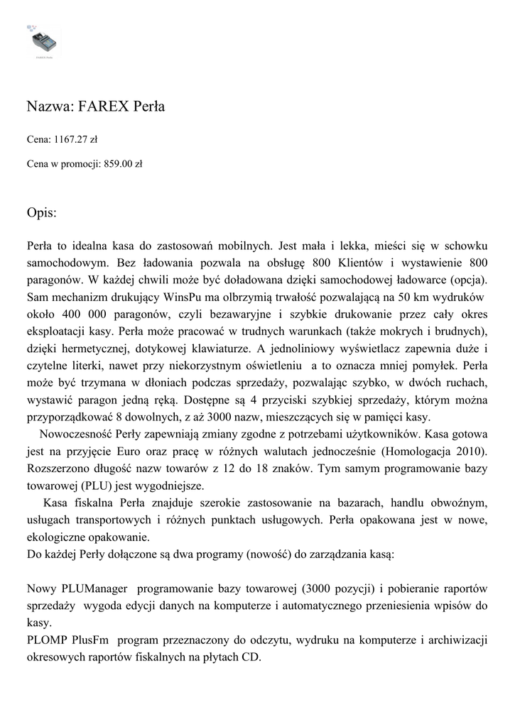 Nazwa: FAREX Perła Cena: 1167.27 zł Cena w promocji: 859.00 zł Opis: Perła to idealna kasa do zastosowań mobilnych. Jest mała i lekka, mieści się w schowku samochodowym. Bez ładowania pozwala na obsługę 800 Klientów i wystawienie 800 paragonów. W każdej chwili może być doładowana dzięki samochodowej ładowarce (opcja). Sam mechanizm drukujący WinsPu ma olbrzymią trwałość pozwalającą na 50 km wydruków około 400 000 paragonów, czyli bezawaryjne i szybkie drukowanie przez cały okres eksploatacji kasy. Perła może pracować w trudnych warunkach (także mokrych i brudnych), dzięki hermetycznej, dotykowej klawiaturze. A jednoliniowy wyświetlacz zapewnia duże i czytelne literki, nawet przy niekorzystnym oświetleniu a to oznacza mniej pomyłek. Perła może być trzymana w dłoniach podczas sprzedaży, pozwalając szybko, w dwóch ruchach, wystawić paragon jedną ręką. Dostępne są 4 przyciski szybkiej sprzedaży, którym można przyporządkować 8 dowolnych, z aż 3000 nazw, mieszczących się w pamięci kasy. Nowoczesność Perły zapewniają zmiany zgodne z potrzebami użytkowników. Kasa gotowa jest na przyjęcie Euro oraz pracę w różnych walutach jednocześnie (Homologacja 2010). Rozszerzono długość nazw towarów z 12 do 18 znaków. Tym samym programowanie bazy towarowej (PLU) jest wygodniejsze. Kasa fiskalna Perła znajduje szerokie zastosowanie na bazarach, handlu obwoźnym, usługach transportowych i różnych punktach usługowych. Perła opakowana jest w nowe, ekologiczne opakowanie. Do każdej Perły dołączone są dwa programy (nowość) do zarządzania kasą: Nowy PLUManager programowanie bazy towarowej (3000 pozycji) i pobieranie raportów sprzedaży wygoda edycji danych na komputerze i automatycznego przeniesienia wpisów do kasy. PLOMP PlusFm program przeznaczony do odczytu, wydruku na komputerze i archiwizacji okresowych raportów fiskalnych na płytach CD. Zalety i funkcje Najmniejsza kasa na rynku - z pełną funkcjonalnością "dużej" kasy. Mała i lekka - zapewnia wygodę użytkowania w terenie i mieści się w schowku auta. Klawiatura - hermetyczna, dotykowa, nie obawia się mokrych i zakurzonych palców. Jednoliniowy duży wyświetlacz - czytelny opis transakcji widoczny w trudnych warunkach. Gotowa na EURO - przeliczanie waluty, czyli bezpieczna inwestycja na lata. DANE TECHNICZNE: KASA FISKALNA FAREX "PERŁA" (KF-02) CECHY GŁÓWNE Typ Przenośna, Stacjonarna Baza Towarowa (PLU) 3000 Grupy Towarowe 8 Liczba Kasjerów 4 Liczba Stawek VAT 9 MECHANIZM DRUKUJĄCY Rodzaj Termiczny (regulacja kontrastu wydruku) Typ (TP2); 8 linii/s Szerokość Papieru 2 x 28 mm Czujnik Końca Papieru TAK KLAWIATURA Rodzaj Membranowa Liczba Klawiszy 30 ZŁĄCZA Liczba złącz komunikacyjnych 2 Współpraca PC/Skaner/Waga TAK / TAK / TAK Współpraca z Szufladą TAK WYŚWIETLACZE Klient LCD, alfanumeryczny, 14 znaków w wierszu Kasjer LCD, alfanumeryczny, 14 znaków w wierszu ZASILANIE Zasilacz Zewnętrzny INPUT: 230V/50Hz; 0,8A. OUTPUT: DC 6,9V; 800mA Akumulator 6V; 1,8 Ah OPROGRAMOWANIE Raporty fiskalne Dobowy - Miesięczny - Okresowy ( wg. dat i wg. numerów raportów dobowych) - PLU Opakowań Zbiorczych - Rozliczeniowy Raporty niefiskalne Poglądowy - PLU - Sprzedaży - Kasowy - Kasjerów - Przyporządkowania Towarów do Grup Towarowych - Opakowań Zwrotnych - Opisów Stałych - Zestaw Raportów Użytkownika Funkcja Przeliczania Waluty TAK - obsługa EURO Funkcja Szybkiej Sprzedaży 4 klawisze (8 PLU) Przypomnienie o Rocznym Przeglądzie TAK Ograniczenie Ceny ograniczenie górnej granicy ceny - grupy towarowe Kontrola Stanów Magazynowych TAK DODATKOWE FUNKCJE Zabezpieczenie Poprawności Daty AKCESORIA Szuflada TAK (opcja) Pokrowiec Ochronny TAK (opcja) Zasilacz Samochodowy TAK (opcja) Przewód Komuni. Kasa-PC TAK DANE OGÓLNE Wymiary 100 szer. x 90 wys. x 180 dł. Masa 0,7 kg Okres Gwarancji 1 rok Temperatura Pracy od -10°C do +40°C Wszystkie podane ceny, są cenami netto do których należy doliczyć podatek VAT. Cennik nie stanowi oferty handlowej w rozumieniu art. 66 par.1 Kodeksu Cywilnego