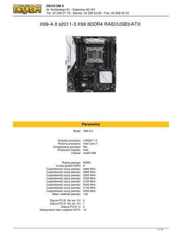 DEVCOM II Al. Korfantego 81 - Katowice 40-161 Tel. 32 259 27 19 - Serwis: 32 259 22 60 - Fax: 32 258 05 53 X99-A II s2011-3 X99 8DDR4 RAID/USB3/ATX Parametry Model X99-A II Gniazdo procesora Rodzina procesora Zintegrowany procesor Producent chipsetu Chipset Rodzaj pamięci Liczba gniazd DDR4 Częstotliwość szyny pamięci Częstotliwość szyny pamięci Częstotliwość szyny pamięci Częstotliwość szyny pamięci Częstotliwość szyny pamięci Częstotliwość szyny pamięci Częstotliwość szyny pamięci Częstotliwość szyny pamięci Maks. wielkość pamięci Złącza PCI-E 16x ver. 3.0 Złącza PCI-E 16x ver. 2.0 Złącza PCI-E 1x Maksymalna ilość urządzeń SATA LGA2011-3 Intel Core i7 Nie Intel Intel® X99 DDR4 8 2666 MHz 2800 MHz 3300 MHz 3333 MHz 3100 MHz 3200 MHz 2133 MHz 2450 MHz 128 3 1 2 10 1/4 DEVCOM II Al. Korfantego 81 - Katowice 40-161 Tel. 32 259 27 19 - Serwis: 32 259 22 60 - Fax: 32 258 05 53 RAID Tak Szczegółowe dane o interfejsach dysków/napędów New Intel® Core™ i7 X-Series Processors : - 1 x M.2 x4 Socket 3, with M Key, type 2242/2260/2280/22110 storage devices support (Support PCIE SSD only)*4 - 1 x U.2 port, support PCIe 3.0 x4 NVM Express storage*4 Intel® X99 chipset : - 1 x SATA Express port, Compatible with 2 x SATA 6.0 Gb/s ports - Support Raid 0, 1, 5, 10 - Supports Intel® Smart Response Technology, Intel® Rapid Recovery Technology*6 Zintegrowana karta graficzna Nie Karta dźwiękowa Realtek® ALC1150 8-Channel High Definition Audio CODEC featuring Crystal Sound 3 - Supports : Jack-detection, Multi-streaming, Front Panel Jack-retasking - High quality 112 dB SNR stereo playback output (Lineout at rear) and 104 dB SNR stereo playback input (Linein) - High-fidelity audio OP AMP(s) Audio Feature : - DTS Connect - DTS Studio Sound - Optical S/PDIF out port(s) at back panel - BD Audio Layer Content Protection - Audio Shielding: Ensures precision analog/digital separation and greatly reduced multi-lateral interference - Dedicated audio PCB layers: Separate layers for left and right channels to guard the quality of the sensitive audio signals - Audio amplifier: Provides the highest-quality sound for headphone and speakers - Premium Japanese-made audio capacitors: Provide warm, natural and immersive sound with exceptional clarity and fidelity - Unique de-pop circuit: Reduces start-up popping noise to audio outputs - Top notch audio sensation delivers according to the audio configuration - EMI protection cover to prevent electrical noise to affect the amplifier quality - Power pre-regulator: Reduces power input noise to ensure consistent performance Interfejs sieciowy 1 x 10/100/1000 Mbit/s Interfejs sieciowy Intel® I218V, 1 x Gigabit LAN Controller(s) Porty USB na tylnym panelu 10 Porty USB do wyprowadzenia z płyty 8 Liczba portów USB 3.0 8 Liczba portów USB 3.1 2 2/4 DEVCOM II Al. Korfantego 81 - Katowice 40-161 Tel. 32 259 27 19 - Serwis: 32 259 22 60 - Fax: 32 258 05 53 Port / Złącze COM Złącza zewnętrzne Złącza zewnętrzne Złącza zewnętrzne Złącza zewnętrzne Złącza zewnętrzne Złącza zewnętrzne Złącza zewnętrzne Złącza zewnętrzne Złącza zewnętrzne Złącza zewnętrzne Złącza zewnętrzne Złącza zewnętrzne Złącza dostępne na płycie Złącza dostępne na płycie Złącza dostępne na płycie Złącza dostępne na płycie Złącza dostępne na płycie Złącza dostępne na płycie Złącza dostępne na płycie Złącza dostępne na płycie Złącza dostępne na płycie Złącza dostępne na płycie Złącza dostępne na płycie Złącza dostępne na płycie Złącza dostępne na płycie Złącza dostępne na płycie Złącza dostępne na płycie Złącza dostępne na płycie Złącza dostępne na płycie Złącza dostępne na płycie Złącza dostępne na płycie Złącza dostępne na płycie Złącza dostępne na płycie Złącza dostępne na płycie Funkcje specjalne Tak 1 x USB 3.1 Type-C 4 x USB 3.0 1 x USB 3.1 1 x Line Out 1 x MIC (przód) 1 x RJ-45 1 x S/PDIF 4 x USB 2.0 1 x Line Out (przód) 1 x PS/2 Klawiatura/Mysz Combo 1 x Głośnik centralny / Subwoofer 1 x Line In 1 x Port szeregowy 1 x Thunderbolt 1 x TPM 1 x Wyjście S/PDIF 1 x Zworka Clear CMOS 1 x Przycisk MemOK! 1 x Przycisk zasilania 1 x Przycisk reset 1 x 3pin wentylator procesora 1 x 4pin wentylator procesora 1 x 4pin wentylator opcjonalny procesora 2 x 4pin wentylator obudowy 1 x 4pin 12V zasilanie 1 x 8pin 12V zasilanie 1 x 24pin ATX zasilanie 1 x U.2 1 x M.2 1 x SATA Express 8 x SATA III 6Gb/s 2 x USB 2.0/1.1 2 x USB 3.0 1 x Czujnik temperatury 5-Way Optimization by Dual Intelligent Processors 5 - 5-Way Optimization tuning key perfectly consolidates TPU, EPU, DIGI+ VRM, Fan Xpert 4, and Turbo Core App ASUS 5X Protection II : - ASUS LANGuard - 2.5X higher surge tolerance - ASUS Overvoltage Protection - World-class circuitprotecting power design - ASUS DIGI+ VRM - 8 Phase digital power design - ASUS DRAM Overcurrent Protection - Prevents damage from short circuits - ASUS Stainless-Steel Back I/O - 3X corrosionresistance for greater durability ASUS TPU : - Auto Tuning - GPU Boost ASUS EPU : - EPU ASUS Digital Power Design : - Industry leading Digital 8 Phase Power Design - Industry leading Digital 4 Phase DRAM Power Design - CPU Power Utility - DRAM Power Utility ASUS Exclusive Features : - Remote GO! - USB BIOS Flashback 3/4 DEVCOM II Al. Korfantego 81 - Katowice 40-161 Tel. 32 259 27 19 - Serwis: 32 259 22 60 - Fax: 32 258 05 53 - MemOK! - AI Suite 3 - Ai Charger+ - USB Charger+ - M.2 & SATA Express - Anti-Surge - Onboard Button : Power/Reset - ASUS UEFI BIOS EZ Mode featuring friendly graphics user interface - USB 3.1 Boost - Turbo LAN - Crystal Sound 3 - EZ XMP ASUS Exclusive Features - Mobo Connect - PC Cleaner Remote Entertainment - Media Streamer - HyStream ASUS Quiet Thermal Solution : - ASUS Fan Xpert 4 ASUS EZ DIY : - Precision Tweaker 2 - ASUS O.C. Tuner - ASUS O.C. Profile - ASUS CrashFree BIOS 3 - ASUS EZ Flash 3 - ASUS USB BIO