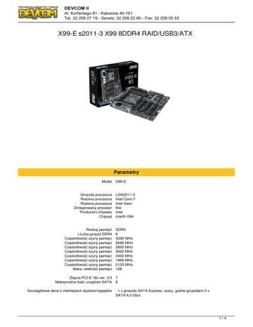 DEVCOM II Al. Korfantego 81 - Katowice 40-161 Tel. 32 259 27 19 - Serwis: 32 259 22 60 - Fax: 32 258 05 53 X99-E s2011-3 X99 8DDR4 RAID/USB3/ATX Parametry Model X99-E Gniazdo procesora Rodzina procesora Rodzina procesora Zintegrowany procesor Producent chipsetu Chipset Rodzaj pamięci Liczba gniazd DDR4 Częstotliwość szyny pamięci Częstotliwość szyny pamięci Częstotliwość szyny pamięci Częstotliwość szyny pamięci Częstotliwość szyny pamięci Częstotliwość szyny pamięci Częstotliwość szyny pamięci Maks. wielkość pamięci LGA2011-3 Intel Core i7 Intel Xeon Nie Intel Intel® X99 DDR4 8 3200 MHz 2666 MHz 2800 MHz 3000 MHz 2400 MHz 1866 MHz 2133 MHz 128 Złącza PCI-E 16x ver. 3.0 7 Maksymalna ilość urządzeń SATA 8 Szczegółowe dane o interfejsach dysków/napędów - 1 x gniazdo SATA Express, szary, godne gniazdami 2 x SATA 6.0 Gb/s 1/4 DEVCOM II Al. Korfantego 81 - Katowice 40-161 Tel. 32 259 27 19 - Serwis: 32 259 22 60 - Fax: 32 258 05 53 - 1 x M.2 x4 Socket 3, szary, , with M Key, type 2260/2280 storage devices support (PCIE mode) - Obsługa Technologia Intel® Rapid Storage Technology - ASMedia® SATA Express controller : - 1 x gniazdo SATA Express, szary, godne gniazdami 2 x SATA 6.0 Gb/s - ASMedia® SATA 6Gb/s controller : - 2 x port eSATA 6Ggodne gniazdami 2 x SATA 6.0 Gb/s Zintegrowana karta graficzna Nie Karta dźwiękowa Realtek® ALC1150 8-kanałowe Kodek High Definition Audio - Obsługa : wykrywanie wtyczki, wiele strumieni, zmianę przeznaczenia gniazda na panelu przednim, Front Panel MIC Jack-retasking Opcje audio : - DTS Ultra PC II - DTS Connect - Wyjście optyczne S/PDIF na panelu tylnym - Ochrona treści audio z płyt BD - Ekranowanie audio: zapewnia dokładną separację sygnału analogowego od cyfrowego i znacznie zmniejsza wielostronne zakłócenia - Wydzielone warstwy audio na płytce drukowanej: oddzielne warstwy dla kanału lewego i prawego, by strzec jakości wrażliwych sygnałów audio - Wzmacniacz audio: zapewnia najwyższą jakość dźwięku w słuchawkach i głośnikach Premium Japanese-made 12K hours capacitors - Absolute Pitch 192khz/24bit true BD lossless sound - Wysokiej jakości odtwarzanie stereo o stosunku sygnału do szumu SNR wynoszącym na wyjściu 109 dB (Line-out at rear) oraz 104 dB odtwarzanie stereo o stosunku sygnału do szumu SNR wynoszącym na wejściu nagrywania (Line-in ) - High-fidelity audio OP AMP(s) Separate layer for left and right track, ensuring both sound deliver equal quality Interfejs sieciowy 2 x 10/100/1000 Mbit/s Interfejs sieciowy - Intel® I210-AT, 1 x kontroler Gigabit LAN - Intel® I218LM, 1 x kontroler Gigabit LAN, podwójny łącznik między zintegrowaną podwarstwą sterowania dostępem do nośnika (MAC) i warstwą fizyczną (PHY) Porty USB na tylnym panelu 10 Porty USB do wyprowadzenia z płyty 8 Liczba portów USB 3.0 14 Port / Złącze COM Port / Złącze LPT Złącza zewnętrzne Złącza zewnętrzne Złącza zewnętrzne Nie Nie 1 x Przycisk USB BIOS Flashback 10 x USB 3.0 2 x eSATA 2/4 DEVCOM II Al. Korfantego 81 - Katowice 40-161 Tel. 32 259 27 19 - Serwis: 32 259 22 60 - Fax: 32 258 05 53 Złącza zewnętrzne Złącza zewnętrzne Złącza zewnętrzne Złącza zewnętrzne Złącza zewnętrzne Złącza zewnętrzne Złącza zewnętrzne Złącza zewnętrzne Złącza zewnętrzne Złącza zewnętrzne Złącza dostępne na płycie Złącza dostępne na płycie Złącza dostępne na płycie Złącza dostępne na płycie Złącza dostępne na płycie Złącza dostępne na płycie Złącza dostępne na płycie Złącza dostępne na płycie Złącza dostępne na płycie Złącza dostępne na płycie Złącza dostępne na płycie Złącza dostępne na płycie Złącza dostępne na płycie Złącza dostępne na płycie Złącza dostępne na płycie Złącza dostępne na płycie Złącza dostępne na płycie Złącza dostępne na płycie Złącza dostępne na płycie Złącza dostępne na płycie Złącza dostępne na płycie Złącza dostępne na płycie Funkcje specjalne 1 x Głośnik boczny 1 x Głośnik centralny / Subwoofer 1 x Głośnik tylny 1 x Line In 1 x Line Out (przód) 1 x Line Out 1 x MIC (przód) 1 x MIC 1 x S/PDIF 2 x RJ-45 1 x 4pin wentylator procesora 1x Zworka CPU/DRAM overvoltage 1 x 4pin wentylator opcjonalny procesora 4 x 4pin wentylator obudowy 1 x 8pin 12V zasilanie 1 x 24pin ATX zasilanie 1 x M.2 2 x SATA Express 8 x SATA III 6Gb/s 2 x USB 2.0/1.1 2 x USB 3.0 1 x Thunderbolt 1 x TPM 1 x System panel 1 x Wyjście S/PDIF 1 x Przycisk Clear CMOS 1 x Przycisk MemOK! 1 x Przycisk zasilania 1 x Przycisk reset 1 x Przełącznik EZ XMP 1 x Przełącznik TPU 1 x Czujnik temperatury 5-Way Optimization wraz z Dual Intelligent Processors 5 - Whole system optimization with a single click! 5-Way Optimization tuning key perfectly consolidates TPU, EPU, DIGI+ Power Control, Fan Xpert 3, and Turbo App together, providing better CPU performance, efficient power saving, precise digital power control, whole system cooling and even tailor your own app usages. Cyfrowy układ zasilania ASUS : - Wiodący w branży cyfrowy 8 fazowy układ zasilania - Narzędzie sterujące zasilaniem procesora - Narzędzie sterujące zasilaniem pamięci - Wiodące rozwiązanie cyfrowego zasilania pamięci, 4 fazy ASUS TPU : - Auto Tuning - GPU Boost - Przełącznik TPU ASUS EPU : - EPU - przełącznik EPU Wyjątkowe funkcje ASUS-a : - MemOK! - AI Suite 3 - Ai Charger+ - ASUS EFI BIOS EZ Mode oferujący przyjazny, graficzny interfejs użytkownika - USB Charger+ - M.2 & SATA Express - USB 3.0 Boost 3/4 DEVCOM II Al. Korfantego 81 - Katowice 40-161 Tel. 32 259 27 19 - Serwis: 32 259 22 60 - Fax: 32 258 05 53 - Disk Unlocker - Turbo LAN - Crystal Sound 2 Interactive HomeCloud - Media Streamer ASUS EZ DIY : - Precision Tweaker 2 - ASUS O.C. Tuner - ASUS CrashFree BIOS - ASUS EZ Flash - ASUS USB BIOS Flashback - ASUS UEFI BIOS EZ Mode - Push Notice ASUS Q-Design : - ASUS Q-Shield - ASUS Q-Code - ASUS Q-LED (CPU, DRAM, V