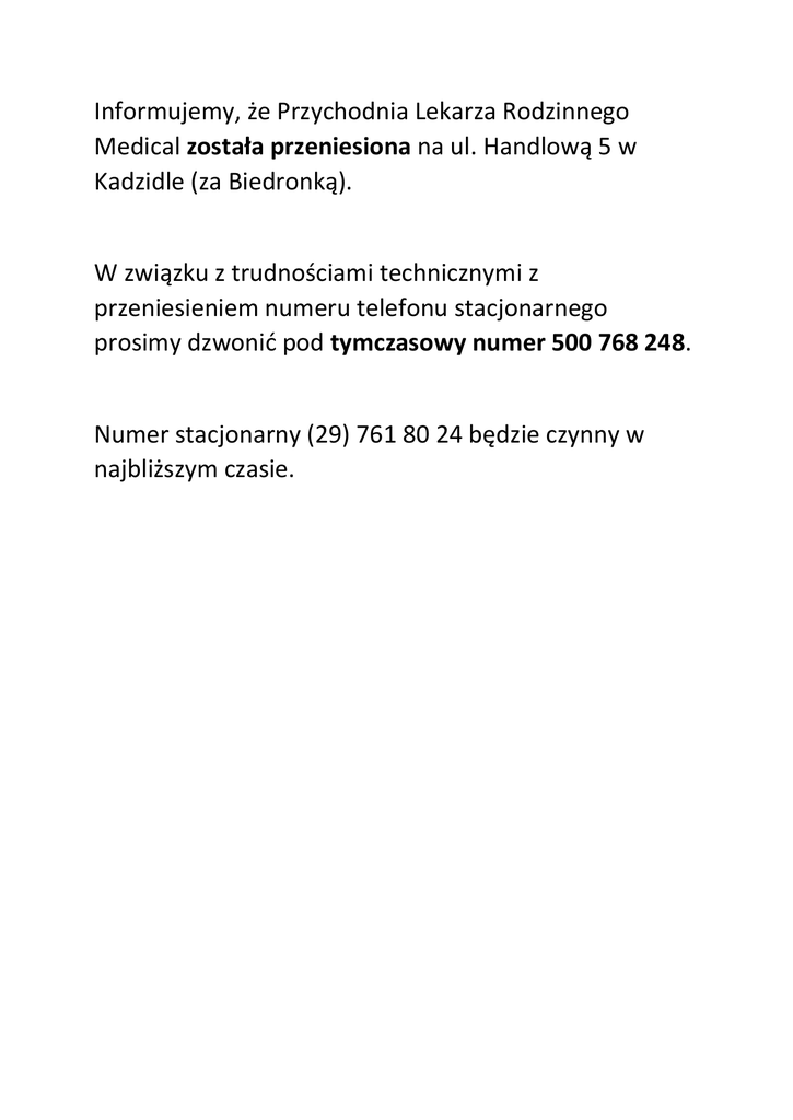 Informujemy, że Przychodnia Lekarza Rodzinnego Medical została przeniesiona na ul. Handlową 5 w Kadzidle (za Biedronką). W związku z trudnościami technicznymi z przeniesieniem numeru telefonu stacjonarnego prosimy dzwonić pod tymczasowy numer 500 768 248. Numer stacjonarny (29) 761 80 24 będzie czynny w najbliższym czasie.