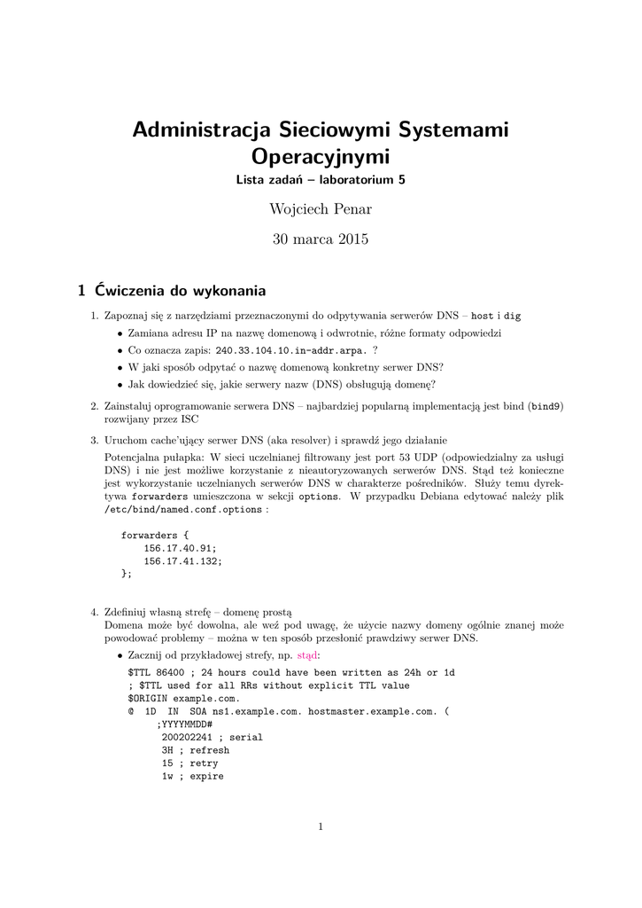 jest wykorzystanie uczelnianych serwerów DNS w charakterze pośredników. Służy temu dyrektywa forwarders umieszczona w sekcji options. W przypadku Debiana edytować należy plik