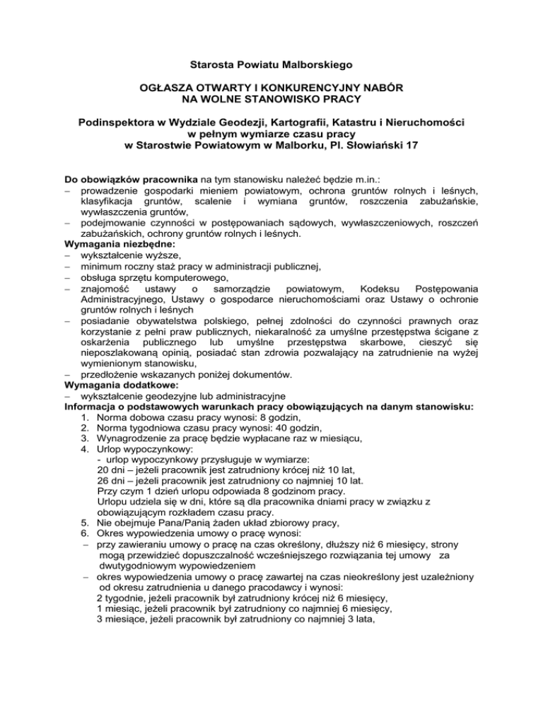 Starosta Powiatu Malborskiego OGŁASZA OTWARTY I KONKURENCYJNY NABÓR NA WOLNE STANOWISKO PRACY Podinspektora w Wydziale Geodezji, Kartografii, Katastru i Nieruchomości w pełnym wymiarze czasu pracy w Starostwie Powiatowym w Malborku, Pl. Słowiański 17 Do obowiązków pracownika na tym stanowisku należeć będzie m.in.: − prowadzenie gospodarki mieniem powiatowym, ochrona gruntów rolnych i leśnych, klasyfikacja gruntów, scalenie i wymiana gruntów, roszczenia zabużańskie, wywłaszczenia gruntów, − podejmowanie czynności w postępowaniach sądowych, wywłaszczeniowych, roszczeń zabużańskich, ochrony gruntów rolnych i leśnych. Wymagania niezbędne: − wykształcenie wyższe, − minimum roczny staż pracy w administracji publicznej, − obsługa sprzętu komputerowego, − znajomość ustawy o samorządzie powiatowym, Kodeksu Postępowania Administracyjnego, Ustawy o gospodarce nieruchomościami oraz Ustawy o ochronie gruntów rolnych i leśnych − posiadanie obywatelstwa polskiego, pełnej zdolności do czynności prawnych oraz korzystanie z pełni praw publicznych, niekaralność za umyślne przestępstwa ścigane z oskarżenia publicznego lub umyślne przestępstwa skarbowe, cieszyć się nieposzlakowaną opinią, posiadać stan zdrowia pozwalający na zatrudnienie na wyżej wymienionym stanowisku, − przedłożenie wskazanych poniżej dokumentów. Wymagania dodatkowe: − wykształcenie geodezyjne lub administracyjne Informacja o podstawowych warunkach pracy obowiązujących na danym stanowisku: 1. Norma dobowa czasu pracy wynosi: 8 godzin, 2. Norma tygodniowa czasu pracy wynosi: 40 godzin, 3. Wynagrodzenie za pracę będzie wypłacane raz w miesiącu, 4. Urlop wypoczynkowy: - urlop wypoczynkowy przysługuje w wymiarze: 20 dni – jeżeli pracownik jest zatrudniony krócej niż 10 lat, 26 dni – jeżeli pracownik jest zatrudniony co najmniej 10 lat. Przy czym 1 dzień urlopu odpowiada 8 godzinom pracy. Urlopu udziela się w dni, które są dla pracownika dniami pracy w związku z obowiązującym rozkładem czasu pracy. 5. Nie obejmuje Pana/Panią żaden układ zbiorowy pracy, 6. Okres wypowiedzenia umowy o pracę wynosi: − przy zawieraniu umowy o pracę na czas określony, dłuższy niż 6 miesięcy, strony mogą przewidzieć dopuszczalność wcześniejszego rozwiązania tej umowy za dwutygodniowym wypowiedzeniem − okres wypowiedzenia umowy o pracę zawartej na czas nieokreślony jest uzależniony od okresu zatrudnienia u danego pracodawcy i wynosi: 2 tygodnie, jeżeli pracownik był zatrudniony krócej niż 6 miesięcy, 1 miesiąc, jeżeli pracownik był zatrudniony co najmniej 6 miesięcy, 3 miesiące, jeżeli pracownik był zatrudniony co najmniej 3 lata, − w przypadku osób podejmujących po raz pierwszy pracę na stanowisku urzędniczym, w tym kierowniczym stanowisku urzędniczym, w jednostkach, o których mowa w art. 2 ustawy z dnia 21 listopada 2008 r. o pracownikach samorządowych (Dz.U. 2008 nr 223 poz. 1458), umowę o pracę zawiera się na czas określony, nie dłuższy niż 6 miesięcy, z możliwością wcześniejszego rozwiązania stosunku pracy za dwutygodniowym wypowiedzeniem. Wskaźnik zatrudnienia osób niepełnosprawnych w Starostwie Powiatowym w Malborku, w rozumieniu przepisów ustawy o rehabilitacji zawodowej i społecznej oraz zatrudnianiu osób niepełnosprawnych, w grudniu 2011 r. wynosił 12,99 %. Oferty zawierające życiorys (CV), list motywacyjny, kserokopię dokumentu poświadczającego wykształcenie i inne dodatkowe dokumenty o posiadanych kwalifikacjach zawodowych i umiejętnościach, kserokopie świadectw pracy lub zaświadczenia z zakładu pracy potwierdzające wymagany staż pracy, zaświadczenie o stanie zdrowia wystawione przez lekarza, oświadczenie o posiadaniu pełnej zdolności do czynności prawnych oraz korzystaniu z pełni praw publicznych, oświadczenie o niekaralności (osoba nie była skazana prawomocnym wyrokiem sądu za umyślne przestępstwo ścigane z oskarżenia publicznego lub umyślne przestępstwo skarbowe) oraz kwestionariusz personalny prosimy przesyłać na adres: Starostwo Powiatowe w Malborku Plac Słowiański 17 82-200 Malbork lub dostarczyć do sekretariatu Starostwa, mieszczącego się w Starostwie Powiatowym w Malborku, pokój nr 24 (I piętro) w nieprzekraczalnym terminie do dnia 7 lutego 2012 roku do godz. 1400. Aplikacje, które wpłyną do Starostwa po wyżej określonym terminie nie będą rozpatrywane. Dokumenty winny być zamieszczone w zamkniętej kopercie zaadresowanej i oznaczonej : „Nabór na stanowisko Podinspektora w Wydziale Geodezji, Kartografii, Katastru i Nieruchomości .” Szczegółowych informacji udziela Referat Organizacji, Nadzoru i Spraw Społecznych Starostwa Powiatowego w Malborku tel. (055) 646 04 09. Pod wskazanym wyżej adresem otrzymają Państwo pakiet informacyjny zawierający opis stanowiska pracy, charakterystykę wymagań na stanowisku oraz kwestionariusz personalny kandydata lub na stronie internetowej www.bip.powiat.malbork.pl Do wysyłanych dokumentów prosimy dopisać klauzulę: „Wyrażam zgodę na przetwarzanie moich danych osobowych zawartych w ofercie pracy dla potrzeb niezbędnych do realizacji procesu rekrutacji (zgodnie z Ustawą z dnia 29.08.1997 r. o ochronie danych osobowych, tekst jednolity z 2002r.: Dz. U. Nr 101 poz. 926 z późn. zm.)”. Informacja o wyniku naboru zostanie umieszczona na stronie internetowej Biuletynu Informacji Publicznej /www.bip.powiat.malbork.pl/ oraz na tablicy informacyjnej w Starostwie Powiatowym w Malborku Plac Słowiański 17. Malbork, dnia 27.01.2012r.