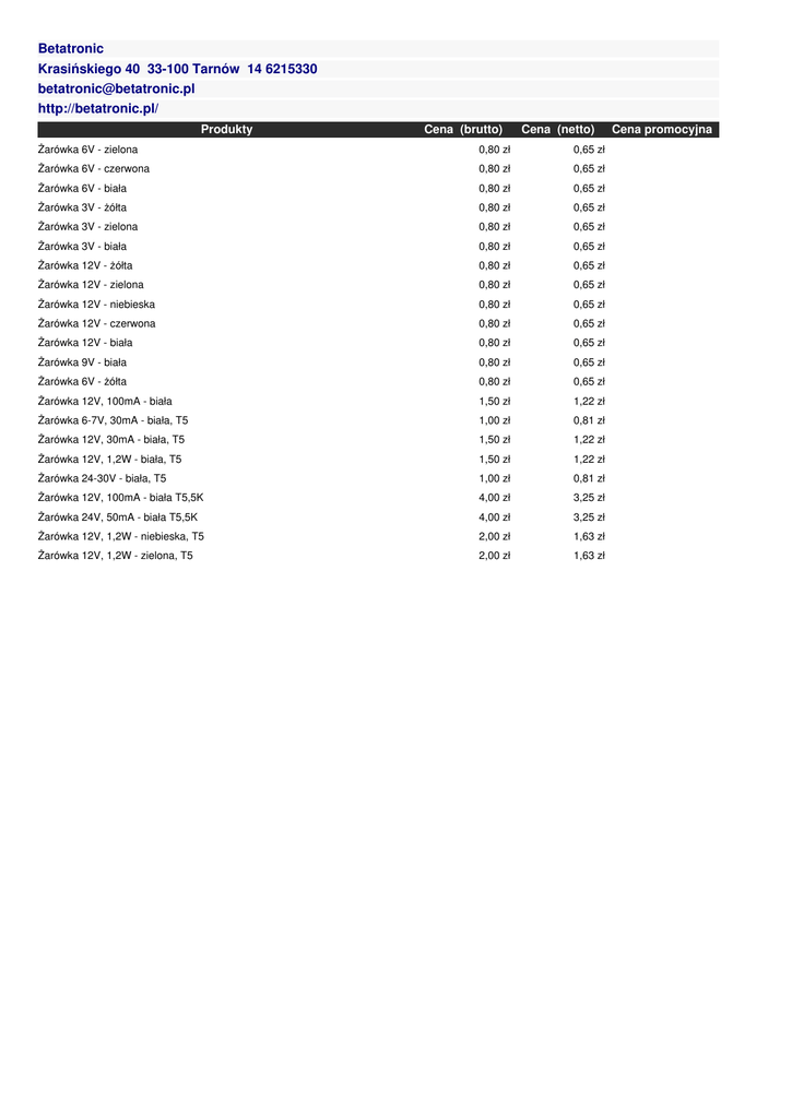 Betatronic Krasińskiego 40 33-100 Tarnów 14 6215330 [email protected] http://betatronic.pl/ Produkty Cena (brutto) Cena (netto) Żarówka 6V - zielona 0,80 zł 0,65 zł Żarówka 6V - czerwona 0,80 zł 0,65 zł Żarówka 6V - biała 0,80 zł 0,65 zł Żarówka 3V - żółta 0,80 zł 0,65 zł Żarówka 3V - zielona 0,80 zł 0,65 zł Żarówka 3V - biała 0,80 zł 0,65 zł Żarówka 12V - żółta 0,80 zł 0,65 zł Żarówka 12V - zielona 0,80 zł 0,65 zł Żarówka 12V - niebieska 0,80 zł 0,65 zł Żarówka 12V - czerwona 0,80 zł 0,65 zł Żarówka 12V - biała 0,80 zł 0,65 zł Żarówka 9V - biała 0,80 zł 0,65 zł Żarówka 6V - żółta 0,80 zł 0,65 zł Żarówka 12V, 100mA - biała 1,50 zł 1,22 zł Żarówka 6-7V, 30mA - biała, T5 1,00 zł 0,81 zł Żarówka 12V, 30mA - biała, T5 1,50 zł 1,22 zł Żarówka 12V, 1,2W - biała, T5 1,50 zł 1,22 zł Żarówka 24-30V - biała, T5 1,00 zł 0,81 zł Żarówka 12V, 100mA - biała T5,5K 4,00 zł 3,25 zł Żarówka 24V, 50mA - biała T5,5K 4,00 zł 3,25 zł Żarówka 12V, 1,2W - niebieska, T5 2,00 zł 1,63 zł Żarówka 12V, 1,2W - zielona, T5 2,00 zł 1,63 zł Cena promocyjna