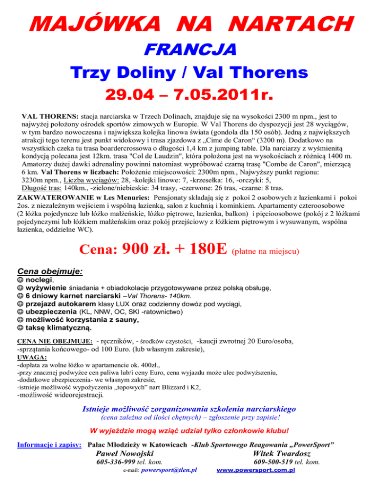 MAJÓWKA NA NARTACH FRANCJA Trzy Doliny / Val Thorens 29.04 – 7.05.2011r. VAL THORENS: stacja narciarska w Trzech Dolinach, znajduje się na wysokości 2300 m npm., jest to najwyżej położony ośrodek sportów zimowych w Europie. W Val Thorens do dyspozycji jest 28 wyciągów, w tym bardzo nowoczesna i największa kolejka linowa świata (gondola dla 150 osób). Jedną z największych atrakcji tego terenu jest punkt widokowy i trasa zjazdowa z „Cime de Caron“ (3200 m). Dodatkowo na wszystkich czeka tu trasa boardercrossowa o długości 1,4 km z jumping table. Dla narciarzy z wyśmienitą kondycją polecana jest 12km. trasa "Col de Laudzin", która położona jest na wysokościach z różnicą 1400 m. Amatorzy dużej dawki adrenaliny powinni natomiast wypróbować czarną trasę "Combe de Caron", mierzącą 6 km. Val Thorens w liczbach: Położenie miejscowości: 2300m npm., Najwyższy punkt regionu: 3230m npm., Liczba wyciągów: 28, -kolejki linowe: 7, -krzesełka: 16, -orczyki: 5, Długość tras: 140km., -zielone/niebieskie: 34 trasy, -czerwone: 26 tras, -czarne: 8 tras. ZAKWATEROWANIE w Les Menuries: Pensjonaty składają się z pokoi 2 osobowych z łazienkami i pokoi 2os. z niezależnym wejściem i wspólną łazienką, salon z kuchnią i kominkiem. Apartamenty czteroosobowe (2 łóżka pojedyncze lub łóżko małżeńskie, łóżko piętrowe, łazienka, balkon) i pięcioosobowe (pokój z 2 łóżkami pojedynczymi lub łóżkiem małżeńskim oraz pokój przejściowy z łóżkiem piętrowym i wysuwanym, wspólna łazienka, oddzielne WC). Cena: 900 zł. + 180E (płatne na miejscu) Cena obejmuje: noclegi, wyżywienie śniadania + obiadokolacje przygotowywane przez polską obsługę, 6 dniowy karnet narciarski –Val Thorens- 140km. przejazd autokarem klasy LUX oraz codzienny dowóz pod wyciągi, ubezpieczenia (KL, NNW, OC, SKI -ratownictwo) możliwość korzystania z sauny, taksę klimatyczną. CENA NIE OBEJMUJE: - ręczników, - środków czystości, -kaucji zwrotnej 20 Euro/osoba, -sprzątania końcowego- od 100 Euro. (lub własnym zakresie), UWAGA: -dopłata za wolne łóżko w apartamencie ok. 400zł., -przy znacznej podwyżce cen paliwa lub/i ceny Euro, cena wyjazdu może ulec podwyższeniu, -dodatkowe ubezpieczenia- we własnym zakresie, -istnieje możliwość wypożyczenia „topowych” nart Blizzard i K2, -możliwość wideorejestracji. Istnieje możliwość zorganizowania szkolenia narciarskiego (cena zależna od ilości chętnych) – zgłoszenie przy zapisie! W wyjeździe mogą wziąć udział tylko członkowie klubu! Informacje i zapisy: Pałac Młodzieży w Katowicach -Klub Sportowego Reagowania „PowerSport” Paweł Nowojski 605-336-999 tel. kom. e-mail: [email protected] Witek Twardosz 609-500-519 tel. kom. www.powersport.com.pl