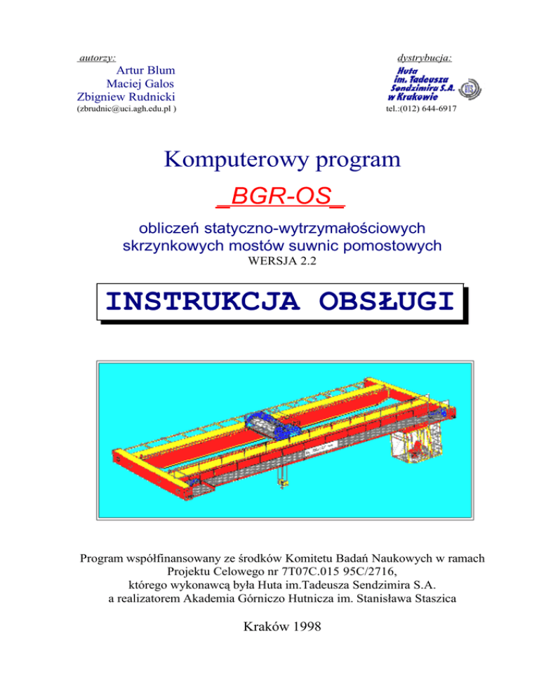 autorzy: dystrybucja: Artur Blum Maciej Galos Zbigniew Rudnicki ([email protected] ) tel.:(012) 644-6917 Komputerowy program _BGR-OS_ obliczeń statyczno-wytrzymałościowych skrzynkowych mostów suwnic pomostowych WERSJA 2.2 INSTRUKCJA OBSŁUGI Program współfinansowany ze środków Komitetu Badań Naukowych w ramach Projektu Celowego nr 7T07C.015 95C/2716, którego wykonawcą była Huta im.Tadeusza Sendzimira S.A. a realizatorem Akademia Górniczo Hutnicza im. Stanisława Staszica Kraków 1998 2 __________________ 7T07C.015 95C/2716 3 1. Zakres stosowania programu Program BGR-OS przeznaczony jest do wykonywania obliczeń wytrzymałościowych mostów dla suwnic pomostowych o następujących cechach konstrukcyjnych: • Rodzaje suwnic: - hakowe ogólnego przeznaczenia, - lejnicze, - chwytakowe, - magnesowe. • Udźwigi suwnic do Q = 100 t. • Suwnice dwubelkowe. • Suwnice z centralnymi lub indywidualnymi mechanizmami jazdy na 4 lub 8 kołach jezdnych. • Ustroje nośne mostów, tj. dźwigary główne i czołownice są konstrukcjami skrzynkowymi, spawanymi. 2. Zakres obliczeń Program BGR-OS umożliwia sprawdzenie wytrzymałości i trwałości najbardziej wytężonych elementów ustroju nośnego mostu, tj. dźwigara głównego po stronie mechanizmu jazdy oraz czołownicy. W dźwigarze głównym po stronie mechanizmu jazdy sprawdzenie wytrzymałości i trwałości wykonuje się w dwóch charakterystycznych przekrojach: - w przekroju środkowym (1), - w przekroju dźwigara przy czołownicy (2). W czołownicy sprawdzanie wytrzymałości i trwałości wykonuje się w przekroju połączenia czołownicy z dźwigarem po stronie mechanizmu jazdy (3). Algorytm umożliwia także obliczenie ugięć dźwigara głównego po stronie mechanizmu jazdy od ciężaru własnego, ciężaru wózka i siły udźwigu. __________________ 7T07C.015 95C/2716 4 Obliczenia zawarte w algorytmie opierają się na obowiązujących normach polskich: PN-91/M-06503 - Dźwignice. Grupy natężenia pracy dźwignic i ich mechanizmów, PN-86/M-06514 - Dźwignice. Obciążenia w obliczeniach ustrojów nośnych dźwignic, PN-79/M-06515 - Dźwignice. Podstawowe zasady wymiarowania stalowych ustrojów. Dla przejrzystości - ciąg obliczeń podzielono na szereg etapów. Programem steruje się przez wybieranie komend z kolejnych menu, a dane i wyniki mogą być zapamiętywane w plikach dyskowych 3. Charakterystyka ogólna oprogramowania Działanie programu jest możliwe zarówno w systemie MS-DOS jak i MS-Windows tak w wersji 3.xx jak i Windows'95 lub nowszych. Program napisano w oparciu o algorytm obliczeń przedstawiony w oddzielnym opracowaniu [1]. Dla ułatwienia obsługi podzielono proces obliczeń na wiele etapów. Po jednorazowym przejściu przez wszystkie etapy można wycofywać się do etapów dowolnie wybranych. Obsługa programu polega na wybieraniu operacji z menu i wprowadzaniu nowych danych lub wykorzystaniu danych przykładowych, które mogą być dowolnie zmieniane. Dla uniknięcia konieczności wielokrotnego wprowadzania tych samych danych umożliwiono zapamiętywanie zestawów danych w plikach dyskowych. Przy kolejnych uruchomieniach programu można odtwarzać wybrany plik danych i użyć go bez zmian lub ewentualnie modyfikować dowolnie wybrane dane. Wyniki również są zapisywane na dysk skąd mogą być drukowane albo pobierane do dowolnych dokumentów tworzonych przy pomocy komputerowych edytorów tekstu, jak MsWORD lub inne. 4. Wymagania sprzętowe Pliki programu zajmują mniej niż 1 MB a więc może on być uruchamiany nawet z dyskietki. Dla poprawnego działania programu potrzebny jest zestaw komputera personalnego działający pod kontrolą systemu operacyjnego MS-DOS lub MS-Windows 3.xx lub Windows'95, który po uruchomieniu ma wolne ok.570 KB pamięci konwencjonalnej (t.zn w obszarze poniżej 640KB). Sprawdzić obszar wolnej pamięci można komendą MEM. Przy mniejszym obszarze wolnej pamięci program działa ale mogą się nie ukazywać na ekranie rysunki i wówczas można zoptymalizować konfigurację komputera na przykład w sposób automatyczny przy pomocy dostarczanego z systemem DOS programu MEMMAKER lub skonsultować się z autorem opracowania komputerowego programu BGR-OS korzystając z email: [email protected] Program używa polskich liter w standardzie PC-852 (IBM-Latin 2) dlatego przy drukowaniu wyników w trybie tekstowym (z systemu DOS) - dla poprawnego wyglądu polskich liter na wydrukach - drukarka powinna mieć możliwość drukowania polskich znaków w tym standardzie. Dodatkowo – istnieje jednak możliwość wygenerowania pliku z wynikami w standardzie polskich liter używanym w systemie Windows tak jak to opisano w rozdziale o drukowaniu. __________________ 7T07C.015 95C/2716 5 5. Uruchomienie programu 5.1. Uruchomienie z DOS Po zainstalowaniu przez osobę dostarczającą program można go uruchamiać wprowadzając z klawiatury słowo: SUWNICA (uruchamiając suwnica.bat). Pojawi się menu startowe: 1. BGR-OS - obliczenia wytrzymałościowe dźwigara suwnicy 2. drukowanie pliku WYNIK1.TXT (wyniki BGR-OS) 3. generowanie pliku WYNIK1.DOC dla edytorów w Windows 9. KONIEC PRACY Podaj wybrany numer operacji: 5.2Uruchomienie programów z poziomu WINDOWS Takie samo menu startowe pojawi się po podwójnym kliknięciu ikony programu (lub dowolnym z innych stosowanych w Windows sposobach uruchamiania programów) 6. Operacje menu głównego Po uruchomieniu programu ukazuje się MENU GŁÓWNE którego przybliżoną postać przedstawiono poniżej. Przesuwanie klawiszami kierunkowymi podświetlenia kolejnych pozycji menu - powoduje wyświetlanie się odpowiednich objaśnień u dołu ekranu. Początkowo (t.zn. po wejściu do programu) menu to zawiera ono tylko 3 pozycje pozwalające wybrać wariant danych do obliczeń: Kraków 1997 OBLICZENIA STATYCZNO-WYTRZYMAŁOŚCIOWE SKRZYNKOWYCH MOSTÓW SUWNIC POMOSTOWYCH BGR-OS wersja 1.0 Algorytm obliczeń opracowali: dr hab inż Artur Blum i doc.dr i