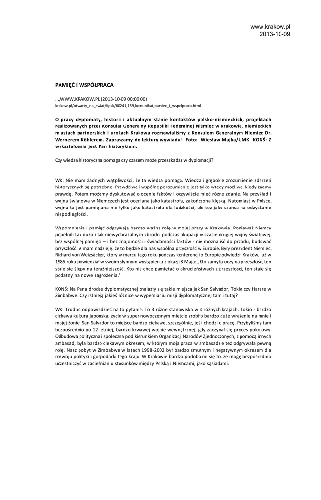 www.krakow.pl 2013-10-09 PAMIĘĆ I WSPÓŁPRACA . .,WWW.KRAKOW.PL (2013-10-09 00:00:00) krakow.pl/otwarty_na_swiat/lipsk/60241,159,komunikat,pamiec_i_wspolpraca.html O pracy dyplomaty, historii i aktualnym stanie kontaktów polsko-niemieckich, projektach realizowanych przez Konsulat Generalny Republiki Federalnej Niemiec w Krakowie, niemieckich miastach partnerskich i urokach Krakowa rozmawialiśmy z Konsulem Generalnym Niemiec Dr. Wernerem Köhlerem. Zapraszamy do lektury wywiadu! Foto: Wiesław Majka/UMK KONŚ: Z wykształcenia jest Pan historykiem. Czy wiedza historyczna pomaga czy czasem może przeszkadza w dyplomacji? WK: Nie mam żadnych wątpliwości, że ta wiedza pomaga. Wiedza i głębokie zrozumienie zdarzeń historycznych są potrzebne. Prawdziwe i wspólne porozumienie jest tylko wtedy możliwe, kiedy znamy prawdę. Potem możemy dyskutować o ocenie faktów i oczywiście mieć różne zdanie. Na przykład I wojna światowa w Niemczech jest oceniana jako katastrofa, zakończona klęską. Natomiast w Polsce, wojna ta jest pamiętana nie tylko jako katastrofa dla ludzkości, ale też jako szansa na odzyskanie niepodległości. Wspomnienia i pamięć odgrywają bardzo ważną rolę w mojej pracy w Krakowie. Ponieważ Niemcy popełnili tak dużo i tak niewyobrażalnych zbrodni podczas okupacji w czasie drugiej wojny światowej, bez wspólnej pamięci – i bez znajomości i świadomości faktów - nie można iść do przodu, budować przyszłość. A mam nadzieję, że to będzie dla nas wspólna przyszłość w Europie. Były prezydent Niemiec, Richard von Weizsäcker, który w marcu tego roku podczas konferencji o Europie odwiedził Kraków, już w 1985 roku powiedział w swoim słynnym wystąpieniu z okazji 8 Maja: „Kto zamyka oczy na przeszłość, ten staje się ślepy na teraźniejszość. Kto nie chce pamiętać o okrucieństwach z przeszłości, ten staje się podatny na nowe zagrożenia." KONŚ: Na Pana drodze dyplomatycznej znalazły się takie miejsca jak San Salvador, Tokio czy Harare w Zimbabwe. Czy istnieją jakieś różnice w wypełnianiu misji dyplomatycznej tam i tutaj? WK: Trudno odpowiedzieć na to pytanie. To 3 różne stanowiska w 3 różnych krajach. Tokio - bardzo ciekawa kultura japońska, życie w super nowoczesnym mieście zrobiło bardzo duże wrażenie na mnie i mojej żonie. San Salvador to miejsce bardzo ciekawe, szczególnie, jeśli chodzi o pracę. Przybyliśmy tam bezpośrednio po 12-letniej, bardzo krwawej wojnie wewnętrznej, gdy zaczynał się proces pokojowy. Odbudowa polityczna i społeczna pod kierunkiem Organizacji Narodów Zjednoczonych, z pomocą innych ambasad, była bardzo ciekawym okresem, w którym moja praca w ambasadzie też odgrywała pewną rolę. Nasz pobyt w Zimbabwe w latach 1998-2002 był bardzo smutnym i negatywnym okresem dla rozwoju polityki i gospodarki tego kraju. W Krakowie bardzo podoba mi się to, że mogę bezpośrednio uczestniczyć w zacieśnianiu stosunków między Polską i Niemcami, jako sąsiadami. www.krakow.pl 2013-10-09 KONŚ: Mijają 23 lata od ponownego zjednoczenia Niemiec. Jak ocenia Pan stosunki polsko-niemieckie od 1990 roku. Co należałoby w nich zmienić, ulepszyć? WK: Stosunki między Niemcami i Polską od 1990 roku rozwijały się bardzo dynamicznie. Dziś istnieje sieć ścisłych stosunków społecznych, kulturalnych i politycznych, które musimy nadal pielęgnować. Często słyszę, jak wielu Polaków jest wdzięcznych Niemcom za wsparcie w trudnych dla Polski latach 80-tych. Należy też zaznaczyć, że w tej części Europy, Polska była co najmniej jeden krok przed Niemcami w walce o wolność i niepodległość. Z pewnością wydarzenia w Polsce były wzorem dla opozycji w dawnym NRD. W ciągu tych 23 lat były różne etapy. Okres ten zaczyna Polsko-Niemiecki Traktat Graniczny z 1990 roku i Polsko-Niemiecki Traktat o Dobrym Sąsiedztwie z 1991 roku. Na bazie tych traktatów stosunki rozwijały się bardzo pozytywnie. Równocześnie z tym traktatem podpisana była Umowa o Polsko-Niemieckiej Współpracy Młodzieży, na wzór Francusko-Niemieckiej Współpracy Młodzieży. Ważne jest to pojednanie z sąsiadem z zachodu i ze wschodu. Głównym celem programów promowanych przez Polsko-Niemiecką Współpracę Młodzieży jest lepsze poznanie młodych ludzi z obu krajów. Ważnymi punktami w historii stosunków polsko-niemieckich jest także wstąpienie Polski do NATO w 1999 roku, do Unii Europejskiej w 2004 roku i do Strefy Schengen w 2007 roku, dzięki którym staliśmy się jeszcze bliższymi partnerami. Niemcy są dla Polski partnerem handlowym nr 1. Z kolei w Polsce i naszym okręgu konsularnym jest dużo firm niemieckich, a firmy polskie coraz skuteczniej działają na rynku niemieckim. Istotna jest także współpraca polityczna. Wystarczy przypomnieć, że swą pierwszą wizytę zagraniczną Prezydent Gauck odbył do Polski. Z pewnością można powtórzyć standardowe zdanie, że dziś stosunki między Polską i Niemcami są najlepsze w historii. KONŚ: Czy wyzwania i priorytety, które wyznaczył Pan sobie obejmując funkcję konsula generalnego w Krakowie choć w części – upłynął, przecież, zaledwie rok - udało się już zrealizować? WK: Ogólnie do moich zadań należy umacnianie stosunków polsko-niemieckich w okręgu działania konsulatu generalnego. Jak już wspominałem, bardzo ważne są dla mnie kontakty z młodymi ludźmi. Ten cel staramy się osiągnąć poprzez realizację różnych imprez, jak np. wspólną z konsulatem francuskim prezentację filmu z okazji 50. rocznicy podpisania Traktatu Elizejskiego w styczniu tego roku. Staramy się również informować o dzisiejszych Niemczech przez Internet i Facebook. Druga i ważna część naszej pracy to wsparcie i współpraca z tymi organizacjami i osobami, które promują język niemiecki jako język obcy. To są nauczyciele, szczególnie w szkołach, które oferują DSD (Dyplom języka niemieckiego). W Kra