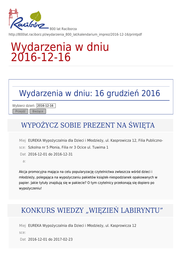 800 lat Raciborza http://800lat.raciborz.pl/wydarzenia_800_lat/kalendarium_imprez/2016-12-16/printpdf Wydarzenia w dniu 2016-12-16 Wydarzenia w dniu: 16 grudzień 2016 Wybierz dzień: 2016-12-16 Przejdź Bieżące WYPOŻYCZ SOBIE PREZENT NA ŚWIĘTA Miej EUREKA Wypożyczalnia dla Dzieci i Młodzieży, ul. Kasprowicza 12, Filia Publicznosce: Szkolna nr 5 Płonia, Filia nr 3 Ocice ul. Tuwima 1 Dat 2016-12-01 do 2016-12-31 a: Akcja promocyjna mająca na celu popularyzację czytelnictwa zwłaszcza wśród dzieci i młodzieży, polegająca na wypożyczaniu pakietów książek-niespodzianek opakowanych w papier. Jakie tytuły znajdują się w pakiecie? O tym czytelnicy przekonają się dopiero po wypożyczeniu! KONKURS WIEDZY „WIĘZIEŃ LABIRYNTU” Miej EUREKA Wypożyczalnia dla Dzieci i Młodzieży, ul. Kasprowicza 12 sce: Dat 2016-12-01 do 2017-02-23 a: Konkurs wiedzy z dwóch pierwszych tomów cyklu „Więzień Labiryntu” Jamesa Dashnera: „Więzień labiryntu” „Próby ognia” Zgłoszenia przyjmowane są do 20 lutego w oddziałach i filiach biblioteki. Regulamin konkursu dostępny na stronie www.biblrac.pl. Konkurs odbędzie się 23 lutego o godz. 16.00 w bibliotece przy Kasprowicza 12. JARMARK BOŻONARODZENIOWY W RAMACH PROJEKTU JARMARK-CZ-PL Miej Rynek w Raciborzu sce: Dat 2016-12-09 do 2016-12-22 a: BIBLIOTEKA NA JARMARKU BOŻONARODZENIOWYM Miej Rynek - namiot sferyczny sce: God 10:30 zina : Dat 2016-12-16 do 2016-12-16 a: Głośne czytanie bajek, zajęcia plastyczne, gry i zabawy dla grup przedszkolnych. XXX LECIE DKF PULS – RECITAL MUZYKI FILMOWEJ DUETU GITAROWEGO. FILM "SERCE, SERDUSZKO"" Miej Kino PRZEMKO ul. Londzina 38 sce: God 18:00 zina : Dat 2016-12-16 do 2016-12-16 a: Zapraszamy Państwa na drugi dzień jubileuszowego spotkania - XXX lecie Dyskusyjnego Klubu Filmowego PULS. W tym dniu proponujemy Państwu Recital Muzyki Filmowej Duetu Gitarowego. Wystąpią przed Państwem Bracia Jan i Piotr Kudełka. https://www.youtube.com/watch?v=pjwyxvJEQZ8 Następnie wyświetlony zostanie film Jana Jakuba Kolskiego „Serce, serduszko”