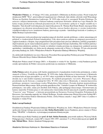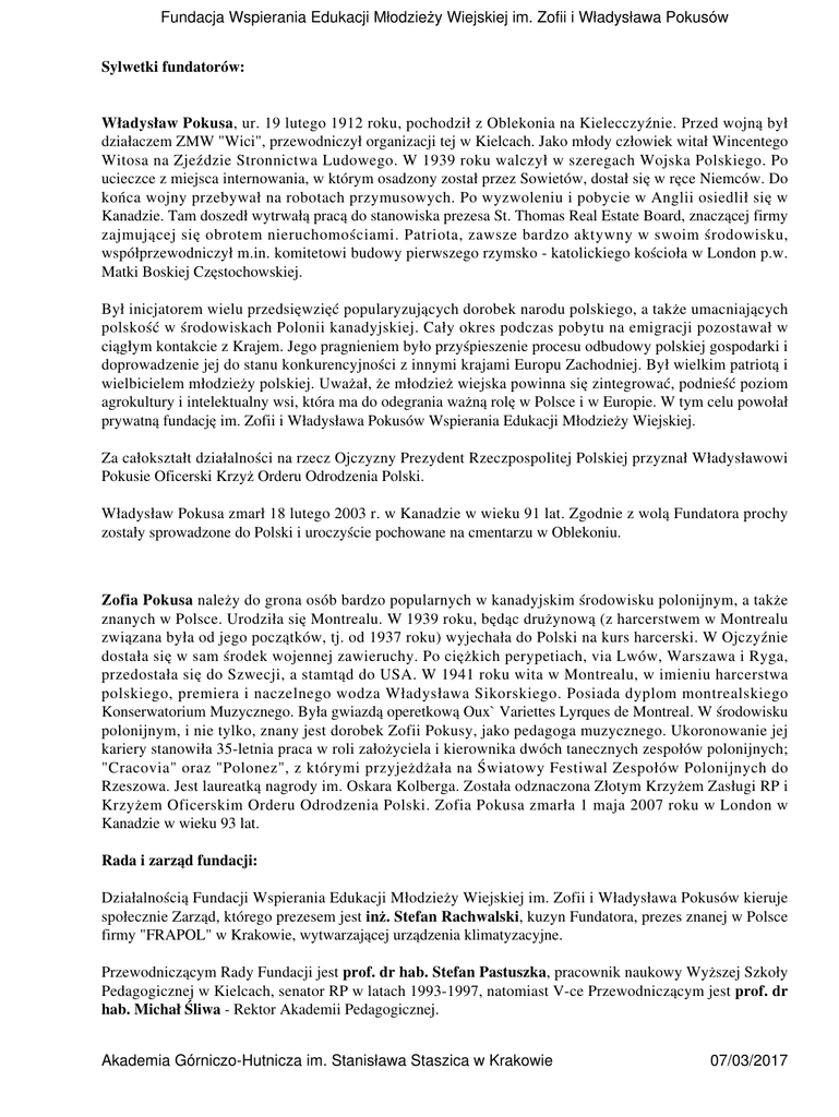 Fundacja Wspierania Edukacji Młodzieży Wiejskiej im. Zofii i Władysława Pokusów Sylwetki fundatorów: Władysław Pokusa, ur. 19 lutego 1912 roku, pochodził z Oblekonia na Kielecczyźnie. Przed wojną był działaczem ZMW "Wici", przewodniczył organizacji tej w Kielcach. Jako młody człowiek witał Wincentego Witosa na Zjeździe Stronnictwa Ludowego. W 1939 roku walczył w szeregach Wojska Polskiego. Po ucieczce z miejsca internowania, w którym osadzony został przez Sowietów, dostał się w ręce Niemców. Do końca wojny przebywał na robotach przymusowych. Po wyzwoleniu i pobycie w Anglii osiedlił się w Kanadzie. Tam doszedł wytrwałą pracą do stanowiska prezesa St. Thomas Real Estate Board, znaczącej firmy zajmującej się obrotem nieruchomościami. Patriota, zawsze bardzo aktywny w swoim środowisku, współprzewodniczył m.in. komitetowi budowy pierwszego rzymsko - katolickiego kościoła w London p.w. Matki Boskiej Częstochowskiej. Był inicjatorem wielu przedsięwzięć popularyzujących dorobek narodu polskiego, a także umacniających polskość w środowiskach Polonii kanadyjskiej. Cały okres podczas pobytu na emigracji pozostawał w ciągłym kontakcie z Krajem. Jego pragnieniem było przyśpieszenie procesu odbudowy polskiej gospodarki i doprowadzenie jej do stanu konkurencyjności z innymi krajami Europu Zachodniej. Był wielkim patriotą i wielbicielem młodzieży polskiej. Uważał, że młodzież wiejska powinna się zintegrować, podnieść poziom agrokultury i intelektualny wsi, która ma do odegrania ważną rolę w Polsce i w Europie. W tym celu powołał prywatną fundację im. Zofii i Władysława Pokusów Wspierania Edukacji Młodzieży Wiejskiej. Za całokształt działalności na rzecz Ojczyzny Prezydent Rzeczpospolitej Polskiej przyznał Władysławowi Pokusie Oficerski Krzyż Orderu Odrodzenia Polski. Władysław Pokusa zmarł 18 lutego 2003 r. w Kanadzie w wieku 91 lat. Zgodnie z wolą Fundatora prochy zostały sprowadzone do Polski i uroczyście pochowane na cmentarzu w Oblekoniu. Zofia Pokusa należy do grona osób bardzo popularnych w kanadyjskim środowisku polonijnym, a także znanych w Polsce. Urodziła się Montrealu. W 1939 roku, będąc drużynową (z harcerstwem w Montrealu związana była od jego początków, tj. od 1937 roku) wyjechała do Polski na kurs harcerski. W Ojczyźnie dostała się w sam środek wojennej zawieruchy. Po ciężkich perypetiach, via Lwów, Warszawa i Ryga, przedostała się do Szwecji, a stamtąd do USA. W 1941 roku wita w Montrealu, w imieniu harcerstwa polskiego, premiera i naczelnego wodza Władysława Sikorskiego. Posiada dyplom montrealskiego Konserwatorium Muzycznego. Była gwiazdą operetkową Oux` Variettes Lyrques de Montreal. W środowisku polonijnym, i nie tylko, znany jest dorobek Zofii Pokusy, jako pedagoga muzycznego. Ukoronowanie jej kariery stanowiła 35-letnia praca w roli założyciela i kierownika dwóch tanecznych zespołów polonijnych; "Cracovia" oraz "Polonez", z którymi przyjeżdżała na Światowy Festiwal Zespołów Polonijnych do Rzeszowa. Jest laureatką nagrody im. Oskara Kolberga. Została odznaczona Złotym Krzyżem Zasługi RP i Krzyżem Oficerskim Orderu Odrodzenia Polski. Zofia Pokusa zmarła 1 maja 2007 roku w London w Kanadzie w wieku 93 lat. Rada i zarząd fundacji: Działalnością Fundacji Wspierania Edukacji Młodzieży Wiejskiej im. Zofii i Władysława Pokusów kieruje społecznie Zarząd, którego prezesem jest inż. Stefan Rachwalski, kuzyn Fundatora, prezes znanej w Polsce firmy "FRAPOL" w Krakowie, wytwarzającej urządzenia klimatyzacyjne. Przewodniczącym Rady Fundacji jest prof. dr hab. Stefan Pastuszka, pracownik naukowy Wyższej Szkoły Pedagogicznej w Kielcach, senator RP w latach 1993-1997, natomiast V-ce Przewodniczącym jest prof. dr hab. Michał Śliwa - Rektor Akademii Pedagogicznej. Akademia Górniczo-Hutnicza im. Stanisława Staszica w Krakowie 07/03/2017 Fundacja Wspierania Edukacji Młodzieży Wiejskiej im. Zofii i Władysława Pokusów Fundacja przyjęła zasadę nie pomniejszania jej majątku. Odpowiednio inwestując powierzone fundusze i pozyskując nowe, rozszerza swoje działania na coraz liczniejsze środowiska młodzieży wiejskiej. Organizacja doceniona została przez prezydenta RP poprzez przyznanie Krzyży Oficerskich Orderu Odrodzenia Polski dla Stefana Rachwalskiego - Prezesa Fundacji i Józefa Górskiego - Członka Rady Fundacji za wybitne zasługi w działalności na rzecz pomocy dzieciom i młodzieży ze środowiska wiejskiego (MP.02.20.352) Dzięki przekazanym środkom finansowym i zaangażowaniu Fundacji została wyremontowana Szkoła Podstawowa w Oblekoniu do której uczęszczał Fundator. Szkoła ta, pierwotnie przeznaczona do likwidacji, obecnie dzięki podniesionemu standardowi (nowy plac zabaw, boisko sportowe, pracownia internetowa) stała się atrakcyjna dla uczniów z okolicznych wsi. Fundacja przekazuje również nieodpłatnie zestawy komputerowe wraz z oprogramowaniem dla szkół wiejskich, wyprawki dla uczniów z klas początkujących, stroje ludowe oraz instrumenty muzyczne. Organizuje ogródki jordanowskie wraz z wyposażeniem boisk sportowych, jak również doposaża szkoły i biblioteki w pomoce naukowe, organizuje i finansuje wycieczki krajoznawcze i kulturoznawcze. Statut fundacji Akademia Górniczo-Hutnicza im. Stanisława Staszica w Krakowie 07/03/2017