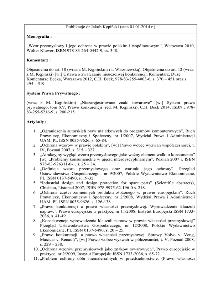 Publikacje dr Jakub Kępiński (stan 01.01.2014 r.) Monografia : „Wzór przemysłowy i jego ochrona w prawie polskim i wspólnotowym”, Warszawa 2010, Wolter Kluwer, ISBN 978-83-264-0442-9, ss. 348. Komentarz : Objaśnienia do art. 10 (wraz z M. Kępińskim i I. Wiszniewską). Objaśnienia do art. 12 (wraz z M. Kępiński) [w:] Ustawa o zwalczaniu nieuczciwej konkurencji. Komentarz, Duże Komentarze Becka, Warszawa 2012, C.H. Beck, 978-83-255-4003-6, s. 370 – 451 oraz s. 495 – 519. System Prawa Prywatnego : (wraz z M. Kępińskim) „Niezarejestrowane znaki towarowe” [w:] System prawa prywatnego, tom XV, Prawo konkurencji (red. M. Kępiński), C.H. Beck 2014, ISBN : 97883-255-5216-9, s. 200-215. Artykuły : 1. „Ograniczenia autorskich praw majątkowych do programów komputerowych”, Ruch Prawniczy, Ekonomiczny i Społeczny, nr 1/2007, Wydział Prawa i Administracji UAM, PL ISSN 0035-9626, s. 65-84. 2. „Ochrona wzorów w prawie polskim”, [w:] Prawo wobec wyzwań współczesności, t. IV, Poznań 2007, s. 315 – 327. 3. „Atrakcyjny wygląd wzoru przemysłowego jako ważny element walki o konsumenta” [w:] „Problemy konsumenckie w ujęciu interdyscyplinarnym”, Poznań 2007 r. ISBN 978-83-926311-0-1, s. 25 – 34. 4. „Definicja wzoru przemysłowego oraz warunki jego ochrony”. Przegląd Ustawodawstwa Gospodarczego, nr 9/2007, Polskie Wydawnictwo Ekonomiczne, PL ISSN 0137-5490, s. 19-32. 5. “Industrial design and design protection for spare parts” (Scientific abstracts), Chisinau, Listopad 2007, ISBN 978-9975-62-196-0 s. 218. 6. „Ochrona części zamiennych produktu złożonego w prawie europejskim”, Ruch Prawniczy, Ekonomiczny i Społeczny, nr 2/2008, Wydział Prawa i Administracji UAM, PL ISSN 0035-9626, s. 126-138 7. „Prawo konkurencji a prawo własności przemysłowej. Wprowadzenie klauzuli napraw.”, Prawo europejskie w praktyce, nr 11/2008, Instytut Europejski ISSN 17332036, s. 41-49. 8. „Konsekwencje wprowadzenia klauzuli napraw w prawie własności przemysłowej” Przegląd Ustawodawstwa Gospodarczego, nr 12/2008, Polskie Wydawnictwo Ekonomiczne, PL ISSN 0137-5490, s. 20 – 25. 9. „Prawo konkurencji, a prawo własności przemysłowej. Sprawy Volvo v. Veng, Maxicar v. Renault”, [w:] Prawo wobec wyzwań współczesności, t. V, Poznań 2008, s. 229 – 238. 10. „Ochrona wzorów przemysłowych jako znaków towarowych”, Prawo europejskie w praktyce, nr 2/2009, Instytut Europejski ISSN 1733-2036, s. 65-72. 11. „Problem ochrony dóbr niematerialnych w przedsiębiorstwie. (Prawo własności przemysłowej)” [w:] „Problemy przedsiębiorstw w ujęciu interdyscyplinarnym” WPiA UAM, ISBN ____, Poznań 2009 12. „Co radca prawny powinien wiedzieć o wzorach ?”, Radca Prawny nr 3/2009, Radca prawny, ISSN 1230-1426, s. 47-55. 13. „Ochrona wzorów w prawie autorskim i prawie własności przemysłowej”, [w:] Granice prawa autorskiego, Warszawa 2010, C.H. Beck, 978-83-255-1101-2, s. 167188. 14. „Prawo konkurencji a prawa własności przemysłowej (sprawy Volvo p. Veng, Maxicar p. Renault) Problematyka wprowadzenia klauzuli napraw”, [w:] Konkurencja a własność intelektualna, Warszawa 2011, C.H. Beck, 978-83-2551584-3, s. 149 – 165. 15. „Artyści wykonawcy i przyznane im prawa w świetle przepisów międzynarodowych i polskich” [w:] Prawa pokrewne (red. J. Kępiński, K. Klafkowska-Waśniowska, R. Sikorski), C.H. Beck, Warszawa 2011, C.H. Beck, 978-83-255-3252-9, s. 33-56. 16. „Zbigniew Radwański – wybitny profesor odznaczony Orderem Orła Białego”, Ruch Prawniczy, Ekonomiczny i Społeczny, nr 3/2011, WPiA PL ISSN 0035-9629, s. 293295. 17. (wraz z M. Kępińskim) „Jurysdykcja sądów wspólnotowych znaków towarowych i wzorów przemysłowych a jurysdykcja sądów krajowych oraz powództwa równoległe w tych sprawach” (red. P. Grzegorczyk, K. Knoppek, M. Walasik)), [w:] Proces cywilny. Nauka – Kodyfikacja – Praktyka. Księga jubileuszowa dedykowana Profesorowi Feliksowi Zedlerowi, Warszawa 2012, Wolter Kluwer 978-83-264-39131, s. 929 – 943. 18. „Wyłączenie ochrony prawnoautorskiej dla wzorów przemysłowych – glosa do wyroku TS z 27.01.2011 r. w sprawie C-168/09 Flos SpA v. Semeraro Casa a Famiglia SpA”, Europejski Przegląd Sądowym nr 4/2012, Wolters Kluwer ISSN 1895-0396, s. 40-46. 19. „Przejście i obciążenie praw do wzoru przemysłowego i wzoru wspólnotowego; umowy licencyjne dotyczące praw do wzoru przemysłowego i wzoru wspólnotowego”, Zeszyty Naukowe Uniwersytetu Jagiellońskiego, Prace z prawa własności intelektualnej, nr 4/2012, Wolters Kluwer ISSN 0137-236X, s. 51-76. 20. „Sylwetka Profesora Mariana Kępińskiego” [w:] Problemy polskiego i europejskiego prawa prywatnego, Księga pamiątkowa Profesora Mariana Kępińskiego (red. K. Klafkowska-Waśniowska, M. Mataczyński, R. Sikorski, M. Sokołowski), Warszawa 2012, Wolters Kluwer ISBN 978-83-264-3769-4, s. 5 -10. 21. „Umowa o stworzenie programu komputerowego. Zagadnienia wybrane”, Przegląd Ekonomiczny, nr 7/2012, s. 11-15. 22. (wraz z M. Kępińskim) „Z historii prawa nieuczciwej konkurencji - międzywojenne orzecznictwo Sądu Najwyższego”, Księga pamiątkowa Profesorów Janusza Barty i Ryszarda Markiewicza, Warszawa 2013, Wolters Kluwer ISBN: 978-83-264-4003-8, s. 443-464. 23. (wraz z M. Kępińskim) „Zasiedzenie udziału we współwłasności nieruchomości przez jednego ze współwłaścicieli”, Księga pamiątkowa Profesora Edwarda Drozda, Warszawa 2013, Lexis Nexis ISBN : 978-83-278-0108-1, s. 133-146. 24. „Oznakowanie i nazewnictwo produktów farmaceutycznych w prawie polskim oraz ich nieuczciwe oznaczenie w świetle art. 10 ZNKU” [w:] Rynek farmaceutyczny a prawo własności intelektualnej (red. J. Kępiński, K. Klafkowska-Waśniowska, R. Sikorski, C.H. Beck, Warszawa 2013, ISBN 978-83-255-5701-0, s. 77- 100. 25. (wraz z A. Wilińską) „Ogólnopolska konferencja naukowa „Jednolity Patent Europej