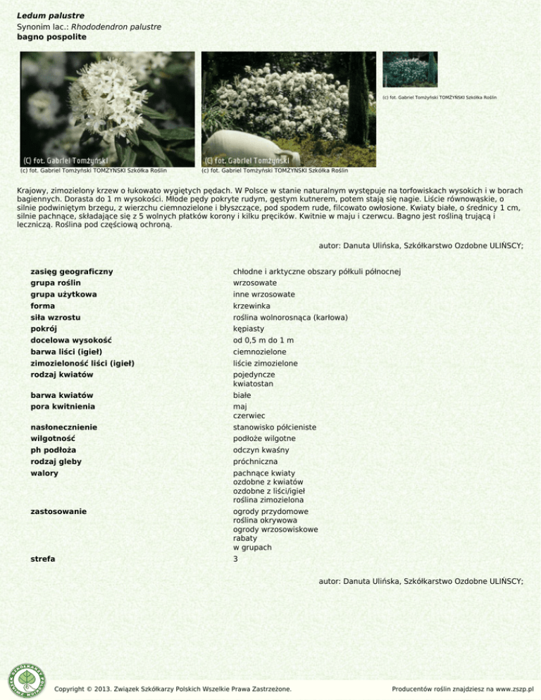 Ledum palustre Synonim lac.: Rhododendron palustre bagno pospolite (c) fot. Gabriel Tomżyński TOMŻYŃSKI Szkółka Roślin (c) fot. Gabriel Tomżyński TOMŻYŃSKI Szkółka Roślin (c) fot. Gabriel Tomżyński TOMŻYŃSKI Szkółka Roślin Krajowy, zimozielony krzew o łukowato wygiętych pędach. W Polsce w stanie naturalnym występuje na torfowiskach wysokich i w borach bagiennych. Dorasta do 1 m wysokości. Młode pędy pokryte rudym, gęstym kutnerem, potem stają się nagie. Liście równowąskie, o silnie podwiniętym brzegu, z wierzchu ciemnozielone i błyszczące, pod spodem rude, filcowato owłosione. Kwiaty białe, o średnicy 1 cm, silnie pachnące, składające się z 5 wolnych płatków korony i kilku pręcików. Kwitnie w maju i czerwcu. Bagno jest rośliną trującą i leczniczą. Roślina pod częściową ochroną. autor: Danuta Ulińska, Szkółkarstwo Ozdobne ULIŃSCY; zasięg geograficzny chłodne i arktyczne obszary półkuli północnej grupa roślin wrzosowate grupa użytkowa inne wrzosowate forma krzewinka siła wzrostu roślina wolnorosnąca (karłowa) pokrój kępiasty docelowa wysokość od 0,5 m do 1 m barwa liści (igieł) ciemnozielone zimozieloność liści (igieł) liście zimozielone rodzaj kwiatów pojedyncze kwiatostan barwa kwiatów białe pora kwitnienia maj czerwiec nasłonecznienie stanowisko półcieniste wilgotność podłoże wilgotne ph podłoża odczyn kwaśny rodzaj gleby próchniczna walory pachnące kwiaty ozdobne z kwiatów ozdobne z liści/igieł roślina zimozielona zastosowanie ogrody przydomowe roślina okrywowa ogrody wrzosowiskowe rabaty w grupach strefa 3 autor: Danuta Ulińska, Szkółkarstwo Ozdobne ULIŃSCY; Copyright © 2013. Związek Szkółkarzy Polskich Wszelkie Prawa Zastrzeżone. Producentów roślin znajdziesz na www.zszp.pl