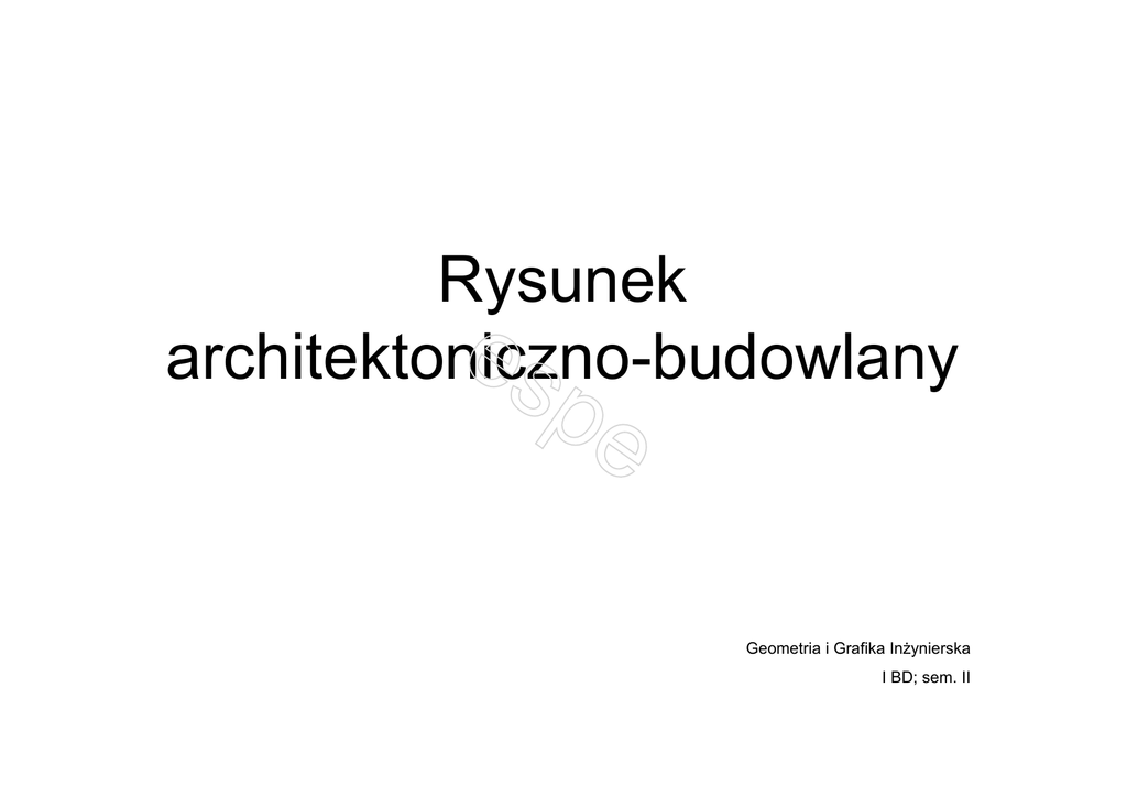 Rysunek architektoniczno-budowlany Geometria i Grafika InŜynierska I BD; sem. II 2 Rzut kondygnacji (przekrój poziomy) 3 Przekrój (przekrój pionowy) Elewacja (widok budynku) 4 1. Grubości linii. Stosowane grubości linii: - linia bardzo gruba: elementy konstrukcji budynku (ściany, stropy) w przekroju - linia gruba: elementy konstrukcji w widoku - linia cienka: elewacje, elementy nieistniejące w rzeczywistości (wymiarowanie, osie, kreskowanie) 12 Rys. I 24 Ściana jednowarstwowa z ociepleniem 12 8 Rys. II 24 Ściana warstwowa 5 Przewody: a) dymowe b) spalinowe c) wentylacyjne Rys. 5.30 Rys. 5.32 Warstwy stropu 6 2. Oznaczenia materiałów (kreskowania). - elementy drobnowymiarowe (cegły, bloczki, pustaki) na zaprawie cem.-wap. - elementy drobnowymiarowe na zaprawie cementowej (np. murowane z cegły trzony kominowe) - beton niezbrojony - Ŝelbet (beton zbrojony) - izolacja termiczna (styropian, wełna mineralna,…) - izolacja przeciwwilgociowa i przeciwwodna (papa termozgrzewalna, folia PE) 7 3. Stolarka okienna i drzwiowa. Rys. 5.3 Otwory okienne i drzwiowe Rys. 5.10 Rodzaje okien. Rys. 5.10 Rodzaje drzwi. 8 9 10 11 Rys. 5.26 Oznaczenie głównego wejścia do budynku. 12 4. Schody i pochylnie. Rys. 5.2 a) schody, b) pochylnia. h s 2h + s = 60÷65cm Wzór na projektowanie schodów. 13 Oznaczenie schodów: n x h x s (n – liczba stopni w biegu) 14 15 5. WyposaŜenie. 16 17 18 19 6. Oznaczenie pomieszczeń. Rys. 5.16 Numeracja kondygnacji. 20 Numeracja pomieszczeń (od głównego wejścia na kondygnację; zgodnie z ruchem wskazówek zegara). Rys. 5.17 Rys. 5.18 Oznaczenie pomieszczeń. 21 6. Oznaczenie poziomów. a) ± 0,00 + 2,90 - 1,45 b) ± 0,00 + 2,90 - 1,45 Oznaczenie poziomów: a) na przekroju b) na rzucie 22 Rys. III Rys. 5.49 Poziomy w budynku. 7. Wymiarowanie. Rys. 5.42 Wymiarowanie trzonu kominowego. Rys. 5.47 Wymiary przewodów kominowych (o innych wymiarach niŜ 14x14cm). Rys. 5.46 Wymiary (na rzucie) stolarki okiennej i drzwiowej. 23 Rys. 5.43 Wymiarowanie otworów drzwiowych w ścianach konstrukcyjnych. Rys. 5.44 Wymiarowanie otworów drzwiowych w ścianach działowych. 24 100 224 Rys. 5.42 Wymiarowanie ścian wewnętrznych. 100 Rys. IV 12 100 Wymiarowanie schodów. 25 Szeregi wymiarowe zewnętrzne (dodatkowo szósty szereg: wymiar gabarytowy (długość i szerokość) budynku). Rys. 5.41 26