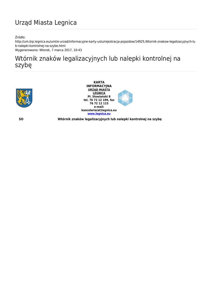 Urząd Miasta Legnica Źródło: http://um.bip.legnica.eu/uml/e-urzad/informacyjne-karty-uslu/rejestracja-pojazdow/14925,Wtornik-znakow-legalizacyjnych-lu b-nalepki-kontrolnej-na-szybe.html Wygenerowano: Wtorek, 7 marca 2017, 10:43 Wtórnik znaków legalizacyjnych lub nalepki kontrolnej na szybę KARTA INFORMACYJNA URZĄD MIASTA LEGNICA Pl. Słowiański 8 tel. 76 72 12 199, fax 76 72 12 115 e-mail: kancelaria(at)legnica.eu www.legnica.eu SO Wtórnik znaków legalizacyjnych lub nalepki kontrolnej na szybę Nazwa: Wtórnik znaków legalizacyjnych lub nalepki kontrolnej na szybę Podstawa prawna: art.73 ust.1 ustawy z dnia 20 czerwca 1997 r. Prawo o ruchu drogowym (Dziennik Ustaw z 2012 roku, poz. 1137); § 11 rozporządzenia Ministra Infrastruktury z dnia 22 lipca 2002r. w sprawie rejestracji i oznaczania pojazdów (Dziennik Ustaw z 2014 poz. 1522) oraz § 5 i 6 rozporzadzenia Ministra Transportu, Budownictwa I Gospodarki Morskiej z dnia 13 kwietnia 2012r. w sprawie trybu legalizacji tablic rejestracyjnych oraz warunków technicznych i wzorów znaku legalizacyjnego (Dziennik Ustaw rok 2012 poz. 481) Termin załatwienia: niezwłocznie Wymagane dokumenty: • Wniosek - druk do pobrania poniżej - w sekcji "Załączniki do strony" • dowód rejestracyjny • karta pojazdu, jeżeli była wydana • stosowne oświadczenie złożone pod odpowiedzialnością karną za składanie fałszywych zeznań • tablice (tablica) rejestracyjne (przy wtórniku znaku legalizacyjnego) • dowód uiszczenia opłaty: - za wtórnik kompletu znaków legalizacyjnych: 12,50 zł (w tym przypadku nie ma opłaty ewidencyjnej) - za wtórnik nalepki kontrolnej na szybę: 18,50 zł oraz 0,50zł - opłaty ewidencyjnej Opłaty można dokonać w kasie urzędu (ul. Chojnowska 2: od poniedziałku do piątku w godzinach od 07:45 do 14:30, we wtorki od 08:15 do 15:00; Pl. Słowiański 8: od poniedziałku do piątku w godzinach 07:45 do 15:00, we wtorki od 08:15 do 15:30), na poczcie, w banku lub przelewem internetowym na następujący rachunek: Urząd Miasta Legnica Bank PeKaO S.A. I O/Legnica numer rachunku: 77 1240 1473 1111 0000 2521 2053 W przypadku zapłaty na poczcie, w banku lub przelewem elektronicznym, w tytule opłaty należy wpisać numer VIN i numer rejestracyjny pojazdu oraz wyszczególnienie opłaty za wtórnik oznaczenia i opłaty ewidencyjnej Uwagi: Jeżeli pojazd jest przedmiotem współwłasności, to wniosek może złożyć każdy ze współwłaścicieli, przedkładając pełnomocnictwo (druk do pobrania poniżej - w sekcji "Załączniki do strony") albo oświadczenie, iż działa za zgodą większości współwłaścicieli. Do wglądu: Dokument tożsamości właściciela: - w przypadku osób fizycznych oraz osób prowadzących działalność gospodarczą i spółek cywilnych- dowód osobisty - w przypadku osób prawnych - wypis z rejestru sądowego lub handlowego oraz zaświadczenie o numerze identyfikacyjnym REGON Etapy - czynności procedury. Czynności poniżej opisane wiążą się jedynie z potrzebą działania ze strony obywatela lub podmiotu gospodarczego. Nie zawierają wszystkich pozostałych czynności administracyjnych i technicznych, które muszą zostać dokonane przez urzędników Etap 1. Pobranie wniosku - Miejsce udostępnienia: województwo: dolnośląskie powiat: m. Legnica gmina: M. Legnica (gmina miejska) miejscowość: Legnica ulica: Chojnowska 2 Etap 2. Złożenie dokumentów (oznaczeń) z opłatami Etap 3. Odbiór dokumentów i oznaczeń Tryb odwoławczy: nie przysługuje Zapraszamy codziennie od 7.30 do 15.30, a we wtorki od 8.00 do 16.00 SO Załączniki do strony ● ● Wniosek o wydanie wtórnika znaków legalizacyjnych lub nalepki kontrolnej na szybę Data publikacji 12.06.2013 14:00 14 KB Druk pełnomocnictwa Data publikacji 12.06.2013 14:00 13.5 KB Metadane Data publikacji 12.06.2013 Podmiot udostępniający informację: Rejestr zmianStarsze wersje dokumentu Urząd Miasta Legnica Osoba wytwarzająca/odpowiadająca za informację: Gabriela Krawczyk-Sudół Osoba udostępniająca informację: Elżbieta Tokarczyk-Kowalczyk Wydział Spraw Obywatelskich Osoba modyfikująca informację: