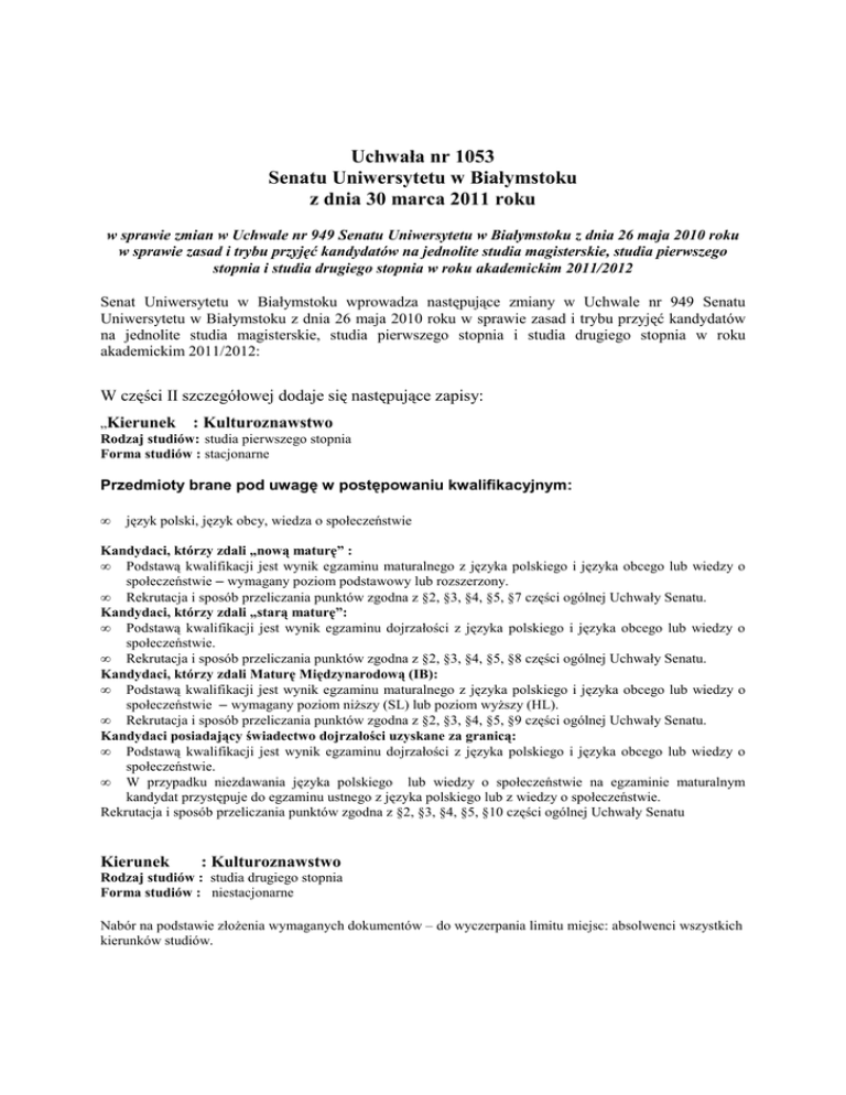 Uchwała nr 1053 Senatu Uniwersytetu w Białymstoku z dnia 30 marca 2011 roku w sprawie zmian w Uchwale nr 949 Senatu Uniwersytetu w Białymstoku z dnia 26 maja 2010 roku w sprawie zasad i trybu przyjęć kandydatów na jednolite studia magisterskie, studia pierwszego stopnia i studia drugiego stopnia w roku akademickim 2011/2012 Senat Uniwersytetu w Białymstoku wprowadza następujące zmiany w Uchwale nr 949 Senatu Uniwersytetu w Białymstoku z dnia 26 maja 2010 roku w sprawie zasad i trybu przyjęć kandydatów na jednolite studia magisterskie, studia pierwszego stopnia i studia drugiego stopnia w roku akademickim 2011/2012: W części II szczegółowej dodaje się następujące zapisy: „Kierunek : Kulturoznawstwo Rodzaj studiów: studia pierwszego stopnia Forma studiów : stacjonarne Przedmioty brane pod uwagę w postępowaniu kwalifikacyjnym: • język polski, język obcy, wiedza o społeczeństwie Kandydaci, którzy zdali „nową maturę” : • Podstawą kwalifikacji jest wynik egzaminu maturalnego z języka polskiego i języka obcego lub wiedzy o społeczeństwie – wymagany poziom podstawowy lub rozszerzony. • Rekrutacja i sposób przeliczania punktów zgodna z §2, §3, §4, §5, §7 części ogólnej Uchwały Senatu. Kandydaci, którzy zdali „starą maturę”: • Podstawą kwalifikacji jest wynik egzaminu dojrzałości z języka polskiego i języka obcego lub wiedzy o społeczeństwie. • Rekrutacja i sposób przeliczania punktów zgodna z §2, §3, §4, §5, §8 części ogólnej Uchwały Senatu. Kandydaci, którzy zdali Maturę Międzynarodową (IB): • Podstawą kwalifikacji jest wynik egzaminu maturalnego z języka polskiego i języka obcego lub wiedzy o społeczeństwie – wymagany poziom niższy (SL) lub poziom wyższy (HL). • Rekrutacja i sposób przeliczania punktów zgodna z §2, §3, §4, §5, §9 części ogólnej Uchwały Senatu. Kandydaci posiadający świadectwo dojrzałości uzyskane za granicą: • Podstawą kwalifikacji jest wynik egzaminu dojrzałości z języka polskiego i języka obcego lub wiedzy o społeczeństwie. • W przypadku niezdawania języka polskiego lub wiedzy o społeczeństwie na egzaminie maturalnym kandydat przystępuje do egzaminu ustnego z języka polskiego lub z wiedzy o społeczeństwie. Rekrutacja i sposób przeliczania punktów zgodna z §2, §3, §4, §5, §10 części ogólnej Uchwały Senatu Kierunek : Kulturoznawstwo Rodzaj studiów : studia drugiego stopnia Forma studiów : niestacjonarne Nabór na podstawie złożenia wymaganych dokumentów – do wyczerpania limitu miejsc: absolwenci wszystkich kierunków studiów. Kierunek : Filologia Specjalność : język angielski stosowany, z hiszpańskim Rodzaj studiów : studia pierwszego stopnia Forma studiów : stacjonarne Przedmioty brane pod uwagę w postępowaniu kwalifikacyjnym: • język angielski Kandydaci, którzy zdali „nową maturę”: • Podstawą kwalifikacji jest wynik egzaminu maturalnego z języka angielskiego – wymagany poziom podstawowy lub rozszerzony. • Rekrutacja i sposób przeliczania punktów zgodna z §2, §3, §6, §7 części ogólnej Uchwały Senatu. Kandydaci, którzy zdali „starą maturę”: • Podstawą kwalifikacji jest wynik egzaminu dojrzałości z języka angielskiego . • Rekrutacja i sposób przeliczania punktów zgodny z §2, §3, §6, §8 części ogólnej Uchwały Senatu. Kandydaci, którzy zdali Maturę Międzynarodową (IB): • Podstawą kwalifikacji jest wynik egzaminu maturalnego z języka angielskiego – wymagany poziom niższy (SL) lub poziom wyższy (HL). • Rekrutacja i sposób przeliczania punktów zgodna z §2, §3, §6, §9 części ogólnej Uchwały Senatu. Kandydaci posiadający świadectwo dojrzałości uzyskane za granicą: • Podstawą kwalifikacji jest wynik egzaminu dojrzałości z języka angielskiego. • W przypadku niezdawania języka angielskiego na egzaminie maturalnym kandydat przystępuje do egzaminu ustnego z języka angielskiego. • Rekrutacja i sposób przeliczania punktów zgodny z §2, §3, §6, §10 części ogólnej Uchwały Senatu. Kierunek : Filologia Specjalność : język francuski stosowany, z hiszpańskim Rodzaj studiów : studia pierwszego stopnia Forma studiów : stacjonarne Przedmioty brane pod uwagę w postępowaniu kwalifikacyjnym: • język francuski, język polski i język obcy (inny niż język francuski) Kandydaci, którzy zdali „nową maturę”: • Podstawą kwalifikacji jest wynik egzaminu maturalnego z języka francuskiego lub języka polskiego i języka • obcego (innego niż język francuski) – wymagany poziom podstawowy lub rozszerzony. • Rekrutacja i sposób przeliczania punktów zgodna z §2, §3, §4, §5, §7 części ogólnej Uchwały Senatu. Kandydaci, którzy zdali „starą maturę”: • Podstawą kwalifikacji jest wynik egzaminu dojrzałości z języka francuskiego lub języka polskiego i języka obcego (innego niż francuski). • Rekrutacja i sposób przeliczania punktów zgodny z §2, §3, §4, §5, §8 części ogólnej Uchwały Senatu. Kandydaci, którzy zdali Maturę Międzynarodową (IB): • Podstawą kwalifikacji jest wynik egzaminu maturalnego z języka francuskiego – wymagany poziom niższy (SL) lub poziom wyższy (HL). • Rekrutacja i sposób przeliczania punktów zgodna z §2, §3, §6, §9 części ogólnej Uchwały Senatu. Kandydaci posiadający świadectwo dojrzałości uzyskane za granicą: • Podstawą kwalifikacji jest wynik egzaminu dojrzałości z języka francuskiego. • W przypadku niezdawania języka francuskiego na egzaminie maturalnym kandydat przystępuje do egzaminu ustnego z języka francuskiego. • Rekrutacja i sposób przeliczania punktów zgodny z §2, §3, §6, §10 części ogólnej Uchwały Senatu. Kierunek : Filologia Specjalność : filologia rosyjska z językiem białoruskim Rodzaj studiów : studia pierwszego stopnia Forma studiów : stacjonarne Przedmioty brane pod uwagę w postępowaniu kwalif