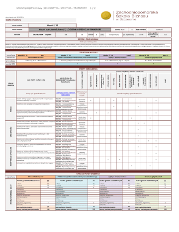 Moduł specjalnościowy (1) LOGISTYKA - SPEDYCJA - TRANSPORT 1/2 obowiązuje od: 2015/2016 karta modułu Moduł E/ 10 numer modułu Moduł specjalnościowy (1) LOGISTYKA-SPEDYCJA-TRANSPORT nazwa modułu EKONOMIA I stopień kierunek III rok semestr 5 punkty ECTS obligatoryjny status 16 lider modułu polski jęz. wykładowy dziekani liczba godzin kontaktowych łącznie 104 ISTOTA I CELE MODUŁU Krótki opis i katalog celów Moduł LST stanowi podstawowy kurs specjalnościowy. Głównym celem modułu jest wyposażenie studenta w podstawową wiedzę z zakresu ekonomiki transportu, logistyki międzynarodowej, jak też przedstawienie zasad i celów polityki transportowej Polski i Unii Europejskiej oraz mechanizmu funkcjonowania rynku usług logistycznych. Moduł jest zorientowany na aspekty praktyczne, dzięki czemu student uzyskuje możliwość zrozumienia istoty opisywanych problemów we współczesnej rzeczywistości gospodarczej o zasięgu krajowym i międzynarodowym. W efekcie student poznaje specyfikę funkcjonowania przedsiębiorstw sektora logistycznego. STRUKTURA MODUŁU numer kursu Moduł E/ 10 kurs 1 Moduł E/ 10 kurs 2 Moduł E/ 10 kurs 3 Moduł E/ 10 kurs 4 nazwa kursu Ekonomika transportu Polityka transportowa z elementami prawa dziedzinowego Logistyka międzynarodowa Rynek usług logistycznych prowadzący dr B. Tundys, dr inż. Ł. Marzantowicz Ł. Konieczny, praktyk, dr inż. Ł. Marzantowicz, mgr A. Rzeczycki dr inż. Ł. Marzantowicz, mgr inż. J. Myszak dr B. Tundys, dr I. Dembińska punkty ECTS 4 4 4 4 KOMPETENCJE SPOŁECZNE UMIEJĘTNOŚCI WIEDZA Student definiuje pojęcia z obszaru ekonomiki transportu oraz charakteryzuje funkcje transportu KE1_W01 Zna podstawowe Ekonomika koncepcje teorii ekonomii i pojęcia transportu KE1_W03 Ma wiedzę umożliwiającą ocenę zjawisk Student zna cele, narzędzia i funkcje polityki trasportowej KE1_W13 Posiada pogłębioną Polityka wiedzę w zakresie wybranej transportowa z specjalności;Posiada zna podstawowe elementami prawa KE1_W05 wiedzę dziedzinowego umożliwiającą krytyczną ocenę zjawisk ekonomicznych, w tym Student posiada wiedzę na temat specyfiki procesów logistycznych KE1_W06 Rozumie decyzje Logistyka organizowanych w przestrzeni międzynarodowej uczestników procesów rynkowych KE1_W14 Posiada wiedzę międzynarodowa praktyczną, umożliwiającą podjęcie Student identyfikuje mechanizmy i uwarunkowania zarządzania KE1_W06 Rozumie decyzje Rynek usług usługami LST uczestników procesów rynkowych logistycznych KE1_W14 Posiada wiedzę praktyczną, umożliwiającą podjęcie Student umie prowadzić ekonomiczną analizę procesów transportu KE1_U05 Potrafi analizować Ekonomika oraz dokonywać wyboru technologii transportu działania i procesy zachodzące w transportu KE1_U06 Potrafi zastosować wiedzę teoretyczną w określonym Student potrafi wybrać i zastosować odpowiednie instrumenty KE1_U07 Potrafi w sposób Polityka polityki transportowej precyzyjny i spójny wypowiadać się transportowa z w mowie i piśmie tematy elementami prawa KE1_U12 Potrafina znajdować dziedzinowego źródła prawa i interpretować je, rozumie przepisy prawne, w tym w Student potrafi zarządzać procesami logistycznymi o skali KE1_U09 Analizuje i przewiduje Logistyka międzynarodowej zachowania członków organizacji, międzynarodowa KE1_U08 Posiada umiejętność formułowania praktycznych Student umie analizować popyt i podać oraz kształtować cenę na KE1_U09 Analizuje i przewiduje Rynek usług rynku usług logistycznych zachowania członków organizacji, logistycznych KE1_U15 Posiada wiedzę praktyczną, umożliwiającą podjęcie Polityka Student jest świadomy poziomu swojej wiedzy oraz rozumie KE1_K01 Ma świadomość transportowa z potrzebę ciągłego uczenia się poziomu swojej wiedzy, dokonuje samoocenyJest własnych kompetencji, elementami prawa KE1_K02 świadomy dziedzinowego złożoności procesów zachodzących we współczesnej gospodarce Student ma świadomość interdyscyplinarności wiedzy i KE1_K02 Jest świadomy Logistyka umiejętności potrzebnych do rozwiązywania złożonych problemów złożoności procesów zachodzących KE1_K03 Myśli logicznie i międzynarodowa analitycznie, jest zdolny do Student samodzielnie identyfikuje, diagnozuje i rozwiązuje KE1_K03 Myśli logicznie i Rynek usług problemy oraz stosuje wariantowanie rozwiązań w praktyce analitycznie, jest zdolny do KE1_K05 Reprezentuje postawę logistycznych gospodarczej przedsiębiorczą i kreatywną, jest gotowy do Potrafi podejmowania Jest otwarty na współdzialanie i pełnienie różnych ról w zespole KE1_K04 pracować i Polityka współdziałać w grupie, aktywnie transportowa z uczestniczyReprezentuje w grupach, postawę elementami prawa KE1_K05 dziedzinowego przedsiębiorczą i kreatywną, jest gotowy do podejmowania uwagi inne aktywności case study zespołowo case study indywidualnie udział w dyskusji prezentacja zadania indywidualnego / grupowego projekt indywidualne projekt zespołowe test wiedzy Adekwatny kurs w ramach modułu ćwiczenia, zadania ZOBACZ LEGENDĘ EFEKTÓW KSZTAŁCENIA praca pisemna (esej, referat, itp.) Zwarty opis efektu kształcenia obszar efektów zaliczenie pisemne odniesienie do KIERUNKOWYCH efektów kształcenia sposoby weryfikacji efektów kształcenia egzamin pisemny opis efektu kształcenia kurs realizujący dany efekt EFEKTY KSZTAŁCENIA Sposób weryfikacji efektu kształcenia x x x x x x x x x x x x x x x x x x x x x x x x x x x x x NAKŁAD PRACY STUDENTA nazwa kursu Ekonomika transportu struktura nakładu pracy liczba godzin kontaktowych w tym: wykład ćwiczenia e-learning laboratorium seminarium warsztat praktyczny wizyta studyjna inne… konsultacje zaliczenia, egzaminy Polityka transportowa z elementami prawa dziedzinowego 26 26 12 12 2 lektoraty praca własna studenta łączny nakład pracy studenta liczba godzin kontaktowych w tym: wykład ćwiczenia e-learning laboratorium seminarium warsztat prak