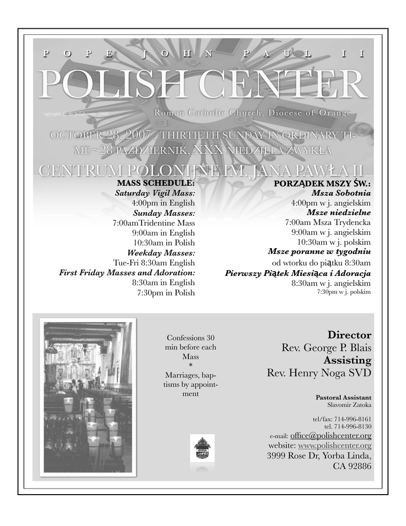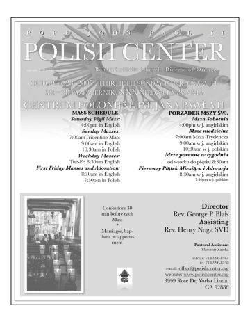 P O P E J O H N P A U L I I POLISH CENTER copyrights by the polish center 2006 Ro m a n C a t h o l i c C h u r c h , D i o c e s e o f O r a n g e OCTOBER 28, 2007 , THIRTIETH SUNDAY IN ORDINARY TIME~28 PAZDZIERNIK, XXX NIEDZIELA ZWYK!A CENTRUM POLONIJNE IM. JANA PAW!A II MASS SCHEDULE: Saturday Vigil Mass: 4:00pm in English Sunday Masses: 7:00amTridentine Mass 9:00am in English 10:30am in Polish Weekday Masses: Tue-Fri 8:30am English First Friday Masses and Adoration: 8:30am in English 7:30pm in Polish Confessions 30 min before each Mass * Marriages, baptisms by appointment PORZ!DEK MSZY "W.: Msza Sobotnia 4:00pm w j. angielskim Msze niedzielne 7:00am Msza Trydencka 9:00am w j. angielskim 10:30am w j. polskim Msze poranne w tygodniu od wtorku do pi"tku 8:30am Pierwszy Pi#tek Miesi#ca i Adoracja 8:30am w j. angielskim 7:30pm w j. polskim Director Rev. George P. Blais Assisting Rev. Henry Noga SVD Pastoral Assistant Slavomir Zatoka tel/fax: 714-996-8161 tel. 714-996-8130 e-mail: [email protected] website: www.polishcenter.org 3999 Rose Dr, Yorba Linda, CA 92886 Page 2 MESSAGE FROM THE DIRECTOR XXX Sunday in Ordinary Time Oct. 27 -28 MESSAGE FROM THE DIRECTOR XXX Niedziela Zwykła, 28 październik, 2007 Today's Gospel calls us to be humble in our prayer life. We bring our needs and concerns to God; however, we cannot be presumptuous or act like the scribes and Pharisees who think they are better than other people. God knows what is in our hearts and He invites us to humbly seek His grace, compassion, love, and mercy. As we end the month of October which was dedicated to Respect Life, we move into the month of November which is a time to reflect on the end of another liturgical year. During the month of November we remember, in a special way, our loved ones who have gone before us to our heavenly Father. We begin the month with two significant feast days in the life of the church. The first is All Saints Day which is a holy day of obligation. Our Mass schedule is as follows. Wed. Oct. 31st at 5:30 Vigil in English, Thur. Nov. 1st 8:30 a. m. English, 5:30 p. m. Latin and 7:30 p. m. Polish. On this day, we remember all the saints who have not been officially named, by the Church, as being with our Lord in Heaven., these are our family and friends like Pope John Paul II who have received this distinction because of the way they lived their lives and, or how they entered eternal life. On Friday Nov. 2nd, we celebrate the feast of All Souls. This is a day for us to remember all those who have died especially our family and friends. These souls may not be officially declared by the church to be in heaven; however, because of our faith and personal knowledge of how they have lived their lives or helped to develop our faith, we pray with them that they are or soon will be with our Lord in heaven. On this day, we will have our morning English Mass at 8:30 and our evening Mass at 7:30 in Polish. It is the first Friday of the month, which is our day of Adoration of the Blessed Sacrament. Adoration will begin after the morning Mass and continue through the day and night until 8:15 on Sat. morning. Please come and spend some quiet prayer time in the presence of the Lord to pray for all of our loved ones and for an increase of vocations to the priesthood and religious life. We will continue to pray for all souls throughout the month of November at all of our Masses. If you have not done so yet and would like to include the names of your loved ones at these Masses, please fill out one of the envelopes and bring it to the office or drop it in the collection basket. These envelopes will remain on the altar throughout the month. During the month of November, our readings focus on the end times. This is not to frighten us, but rather to help us reflect on our need to always be ready for the coming of the Lord. Jesus said: “No one knows the day nor the hour of my return so be prepared.” May we use this time to evaluate our lives and determine where we need to be drawn closer to the Lord. May the Lord Bless you and Mary Keep you. Dzisiejsza Ewangelia wzywa nas do bycia pokornym. Przynosząc nasze prośby do Boga nie zachowujmy się jak faryzeusze i celnicy, myśląc, że jesteśmy lepsi od innych. Bóg wie co kryje się w naszych sercach i zaprasza nas do pokornego szukania Jego łaski, miłości i przebaczenia. Kończymy miesiąc październik będący również miesiącem poszanowania życia, i wchodzimy w okres refleksji nad kończącym się rokiem liturgicznym. W listopadzie szczególną uwagę poświęcamy naszym bliskim zmarłym którzy odeszli na wieczny spoczynek do Ojca niebieskiego. Rozpoczynamy ten miesiąc dwoma ważnymi świętami. Pierwsze to Wszystkich Świętych, które jest świętem kościelnym i obchodzić go będziemy Mszą św. wigilijną w środę 31 października o godzinie 5:30pm w j. angielskim, w czawrtek 1 listopada o godzinie 8:30am w j.angielskim, 5:30pm w obrządku trydenckim, i o godzinie 7:30pm w j. polskim. Tego dnia wspominamy wszystkich tych świętych, którzy nie zostali jeszcze oficjalnie beatyfikowani przez Kościół, zamarłych z naszych rodzin oraz przyjaciół, także Jana Pawła II, pamiętając ich życie na ziemi, i sposób w jaki otrzymali życie wieczne. W piątek obchodzimy Dzień Zaduszny w którym wspominamy naszch bliskich zmarłych, ich zasługi i wpływ na rozwój naszej wiary. To dzień w którym modlimy się za dusze naszych bliskich aby znalazły się w niebie i razem ze wszystkimi świętymi cieszyły się życiem wiecznym u boku Ojca niebieskiego. Porządek Mszy św. na ten dzień: Msza poranna o godzinie 8:30am w j. angielskim i Msza wieczorna w j. polskim. Jest to również Pierwszy Piątek Miesiąca i Adoracja Najświętszego Sakramentu rozpocznie się jak zwykle po porannej Mszy a zakończy na 15 min. przed Mszą sobotnią o 8:30 rano. Będzie to okazja do chwili modlitwy za naszych bliskich zmarłych. Chciałbym też gorąco prosić w tych dnia