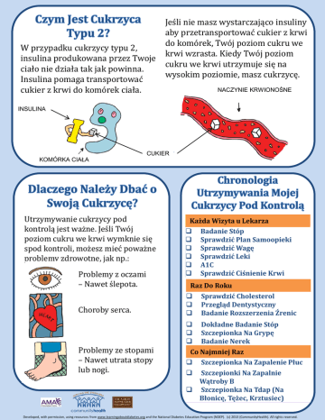 W przypadku cukrzycy typu 2, insulina produkowana przez Twoje ciało nie działa tak jak powinna. Insulina pomaga transportować cukier z krwi do komórek ciała. Jeśli nie masz wystarczająco insuliny aby przetransportować cukier z krwi do komórek, Twój poziom cukru we krwi wzrasta. Kiedy Twój poziom cukru we krwi utrzymuje się na wysokim poziomie, masz cukrzycę. NACZYNIE KRWIONOŚNE INSULINA KOMÓRKA CIAŁA CUKIER Utrzymywanie cukrzycy pod kontrolą jest ważne. Jeśli Twój poziom cukru we krwi wymknie się spod kontroli, możesz mieć poważne problemy zdrowotne, jak np.: Problemy z oczami – Nawet ślepota. Choroby serca. Każda Wizyta u Lekarza Raz Do Roku Sprawdzić Cholesterol Przegląd Dentystyczny Badanie Rozszerzenia Źrenic Problemy ze stopami – Nawet utrata stopy lub nogi. Badanie Stóp Sprawdzić Plan Samoopieki Sprawdzić Wagę Sprawdzić Leki A1C Sprawdzić Ciśnienie Krwi Dokładne Badanie Stóp Szczepionka Na Grypę Badanie Nerek Co Najmniej Raz Szczepionka Na Zapalenie Płuc Szczepionki Na Zapalnie Wątroby B Szczepionka Na Tdap (Na Błonicę, Tężec, Krztusiec) Developed, with permission, using resources from www.learningaboutdiabetes.org and the National Diabetes Education Program (NDEP). (c) 2013 (CommunityHealth). All rights reserved. Dzienna Lista Kontrolna Trzymać się mojej diety. Wielkość porcji ma znaczenie. ¼ zboża Nabiał (mleko chude lub niskotłuszczowe) ½ warzywa i owoce Być aktywnym przez co najmniej 30 minut lub więcej dziennie. ¼ proteiny Wskazówki jak obniżyć ilość spożywanego cukru: pełno zbożowe płatki śniadaniowe/ryż/chleby/tortille, świeże lub mrożone (nie z puszki) owoce i warzywa bez dodatku cukru lub sosu, woda/woda sodowa zamiast napojów gazowanych (np. Coca Cola, Sprite), zachowaj spożywanie słodkości na specjalne okazje, na deser spróbuj świeżych owoców i jogurtu. WYSOKI A1C: średni poziom cukru we krwi poprzez okres 3 miesięcy, mierzony przez mojego lekarza. Poziom cukru we krwi: mierzony przeze mnie codziennie. Moje gole: Przed posiłkami 70-130. A1C = 7 (Dobry) Po posiłkach poniżej 180. Przed snem 110-150. Brać poprawną dawkę leków na czas. Sprawdzać mój poziom cukru we krwi i zapisywać go w moim dzienniku. Aby zapobiec infekcji, sprawdzać moje stopy i zwracać uwagę czy nie ma na nich ran, zaczerwienienia lub opuchlizny, oraz skontaktować się z moim lekarzem jeżeli zauważę któryś z powyższych objawów. Myć zęby aby zapobiec infekcji. Rzucić palenie. Dotrzymywać wizyt lekarskich. Moje następna wizyta jest zapisana na __________. NORMALNY Developed, with permission, using resources from www.learningaboutdiabetes.org and the National Diabetes Education Program (NDEP). (c) 2013 (CommunityHealth). All rights reserved.