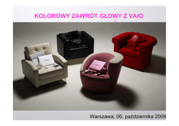 KOLOROWY ZAWRÓT GŁOWY Z VAIO Warszawa, 06. października 2008 Cztery luksusowe kolory… Stworzony z myślą o tym, aby zwracać uwagę. Cztery wspaniałe, wyraziste kolory i perfekcyjne wykończenie zarówno na zewnątrz, jak i w środku komputera. Wyraź swój styl i wybierz jeden z dostępnych kolorów: ognistą czerwień, czystą biel, subtelny róż lub stylową czerń. Klawiatura z dużymi przerwami między klawiszami • Elegancka starannie zaprojektowana klawiatura, tak aby zapewnić większy komfort pisania. • Panoramiczny ekran o przekątnej 14,1 cala • Dzięki niewielkim rozmiarom komputer jest w pełni mobilny, a przy tym bardzo wydajny. Ostre, kontrastowe i jasne obrazy zapewnia technologia X-black LCD firmy Sony Wbudowana kamera MOTION EYE® o rozdzielczości 1,3 megapiksela i mikrofon umożliwiają pogawędki na żywo z przyjaciółmi i rodziną. Dzięki funkcji Picture Capture możesz zrobić sobie zdjęcie, poddać je retuszowi lub użyć efektów specjalnych, a efekt od razu pokazać znajomym. Dotykowy panel AV Capture, AV Control, AV mode, Volume, Power. • Dotykowe elementy sterowania AV • Kontrola nad materiałami audiowizualnymi teraz w zasięgu ręki. Szybki dostęp do filmów, zdjęć i muzyki umożliwiają wygodne przyciski AV z przodu notebooka. Panel AV • Zaawansowana kontrola multimediów • Pojedyńcze / podwójne kliknięcie, przytrzymanie lub przeciągnięcie palcem kliknięcie AV MODE przytrzymanie Podwójne kliknięcie przeciągnięcie VAIO Launcher VAIO Launcher Setting Previous Rev Playback/Pause Stop Next FF Next Volume Down (-1) Volume Down continuously) Volume Down (continuously) Volume Up (+1) Volume Up (continuously) Volume Up (continuously) Previous Mute VAIO CS z odtwarzaczem Blu-ray • Czerwony laptop VAIO wyposażony jest w odtwarzacz blu-ray • Odczyt i zapis na płytach CD i DVD • Odczyt płyt Blu-ray (dane i filmy) Blu-ray Disc™ — rozrywka w formacie HD • Oglądaj zapierające dech w piersi filmy w formacie High Definition, używając napędu Blu-ray, z najnowocześniejszą funkcją odczytu. Podświetlenie LED i sensory dotykowe • Zaawansowany czujnik dla interakcji z użytkownikiem • Rozpoznaje kontakt z górną częścią obudowy • Kolorowe światełka reagują na kontakt VAIO – Twój osobisty towarzysz • Dotykowe panele • Dwa panele dotykowe z 12 wbudowanymi czujnikami każdy • Wspomaganie sterowania AV (nacisk lub przeciągnięcie palcem) • Lewy i prawy czujnik dotyku • Rozpoznaje kiedy użytkownik dotyka VAIO • Reaguje kolorowymi światełkami........... VAIO CS – znajdujemy nowe drogi