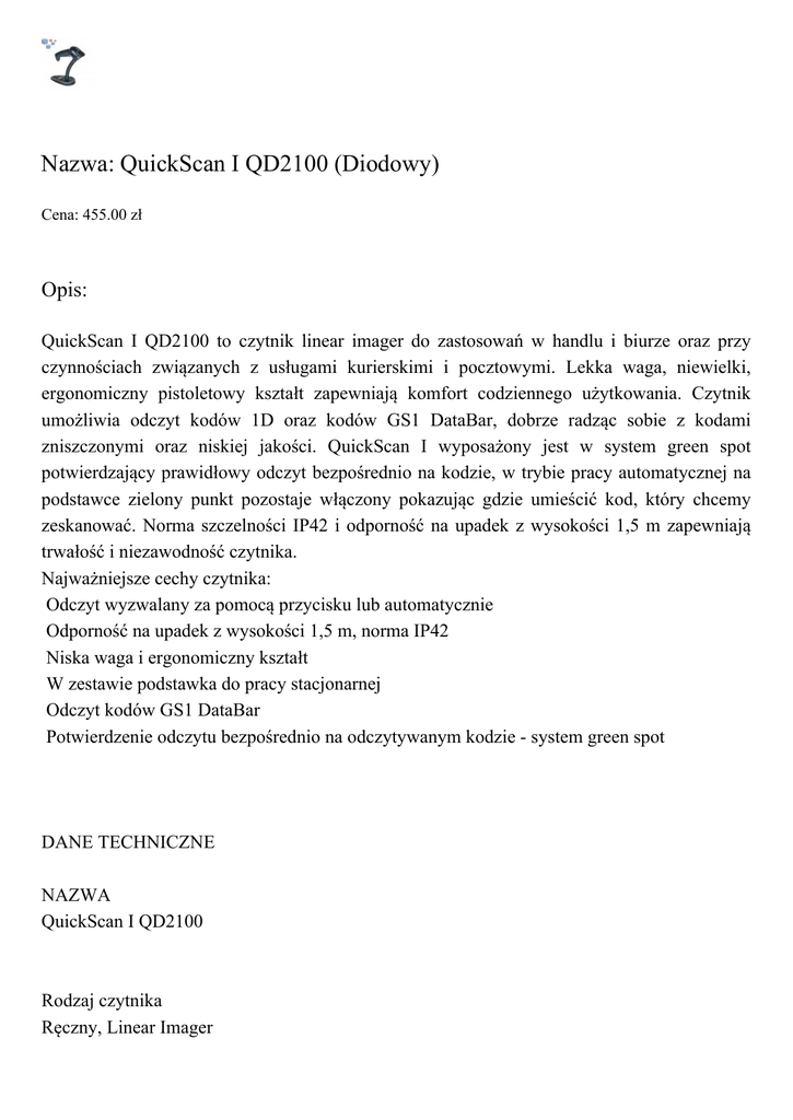 Nazwa: QuickScan I QD2100 (Diodowy) Cena: 455.00 zł Opis: QuickScan I QD2100 to czytnik linear imager do zastosowań w handlu i biurze oraz przy czynnościach związanych z usługami kurierskimi i pocztowymi. Lekka waga, niewielki, ergonomiczny pistoletowy kształt zapewniają komfort codziennego użytkowania. Czytnik umożliwia odczyt kodów 1D oraz kodów GS1 DataBar, dobrze radząc sobie z kodami zniszczonymi oraz niskiej jakości. QuickScan I wyposażony jest w system green spot potwierdzający prawidłowy odczyt bezpośrednio na kodzie, w trybie pracy automatycznej na podstawce zielony punkt pozostaje włączony pokazując gdzie umieścić kod, który chcemy zeskanować. Norma szczelności IP42 i odporność na upadek z wysokości 1,5 m zapewniają trwałość i niezawodność czytnika. Najważniejsze cechy czytnika: Odczyt wyzwalany za pomocą przycisku lub automatycznie Odporność na upadek z wysokości 1,5 m, norma IP42 Niska waga i ergonomiczny kształt W zestawie podstawka do pracy stacjonarnej Odczyt kodów GS1 DataBar Potwierdzenie odczytu bezpośrednio na odczytywanym kodzie - system green spot DANE TECHNICZNE NAZWA QuickScan I QD2100 Rodzaj czytnika Ręczny, Linear Imager Źródło światła Red LED 610-650 nm Odległość odczytu Do 65 cm (w zależności od gęstości kodu kreskowego) Rozdzielczość 4 mils Szybkość odczytu 270 skanów na sekundę Warunki pracy Temp. 0 50 C, wilgotność względna 5 95 % Wymiary 170 x 71 x 66 mm Masa 121,9 g Dostępne interfejsy KBW, USB, RS 232. IBM 46XX Inne Przycisk wyzwalający odczyt, odłączalny kabel transmisyjny, system "green spot" Zastosowanie Handel, biuro, urzędy, biblioteki, stacje benzynowe, apteki, Wszystkie podane ceny, są cenami netto do których należy doliczyć podatek VAT. Cennik nie stanowi oferty handlowej w rozumieniu art. 66 par.1 Kodeksu Cywilnego